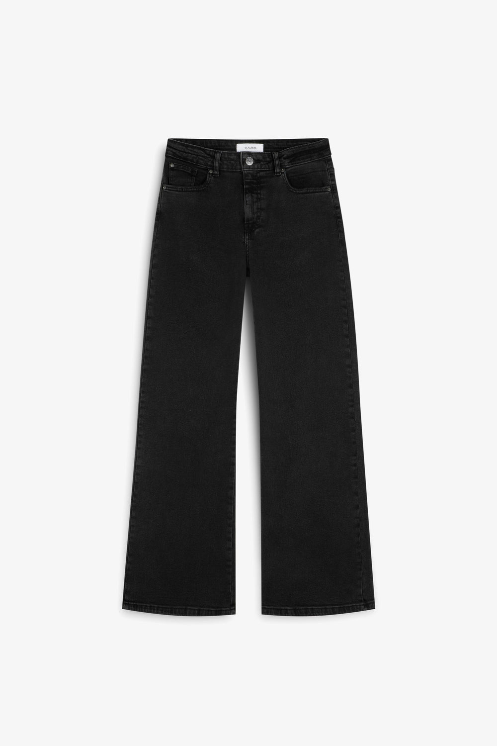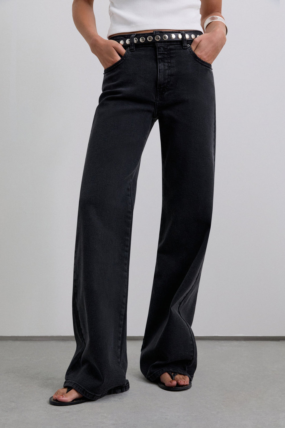 Calças denim confecionadas em 100% algodão ligeiramente elástico. Corte regular fit, full length. Mid waist com fecho de correr e botão. Presilhas na cintura. Bolsos à frente e atrás.