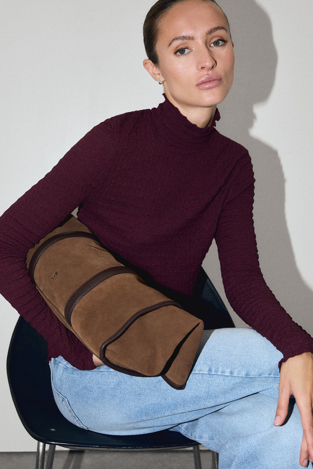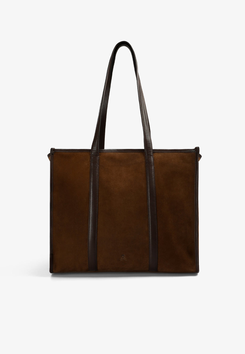 Bolsa shopper confecionada em 100% camurça. Pormenores em pele em contraste. Fecho de correr.