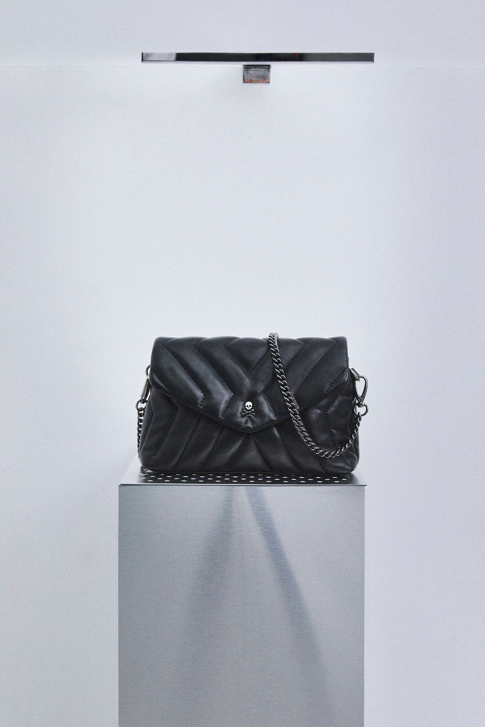 Bolsa confecionada em 100% pele acolchoada. Fecho com placket e íman, alça de corrente e compartimentos interiores. Skull metálica frontal.