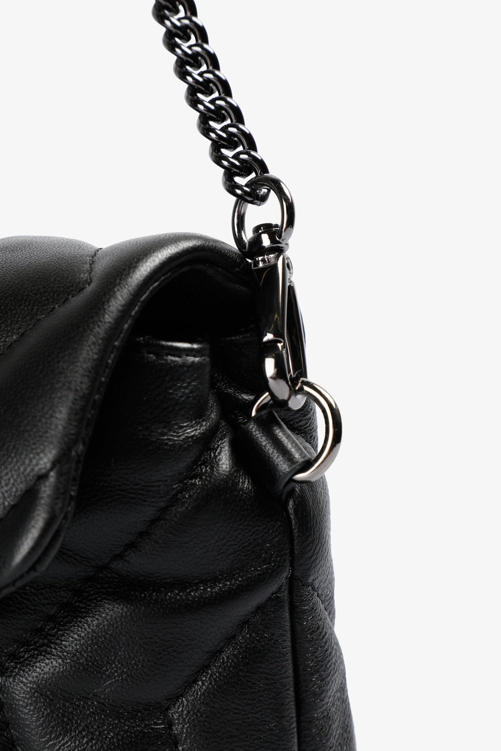 Minibolsa confecionada em 100% pele acolchoada. Fecho com placket e íman, alça de corrente ou regulável em pele e compartimentos interiores. Skull metálica frontal.