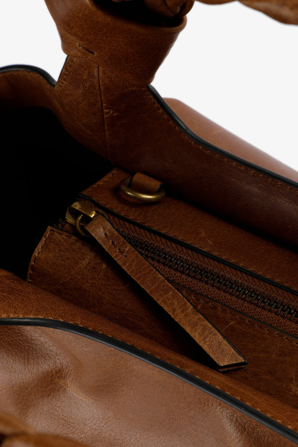 Bolsa de mão confecionada em 100% pele com pormenor de alça entrançada com nós. Forro, bolso interior e fecho de correr. Logótipo metálico à frente. Opção de dupla alça.