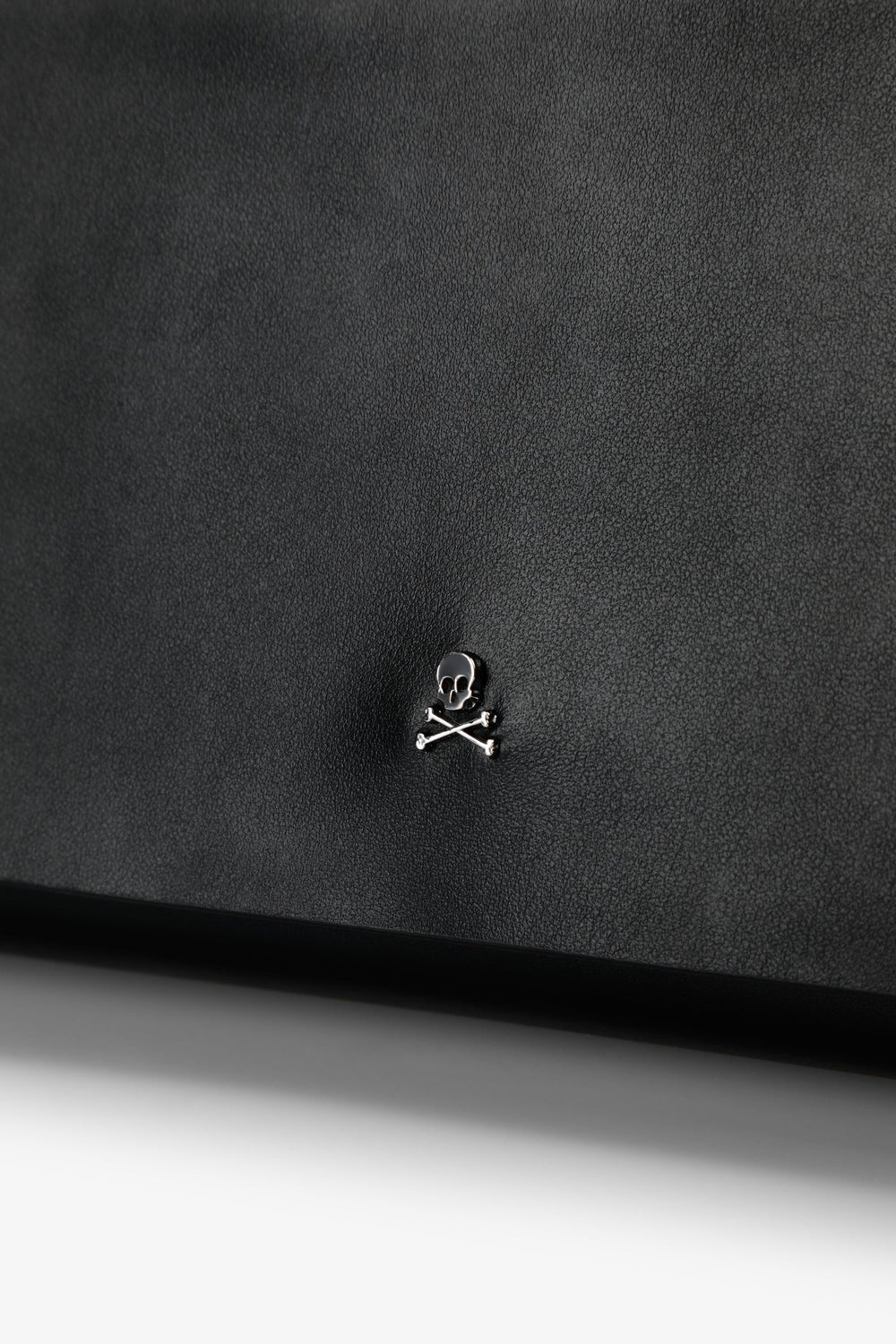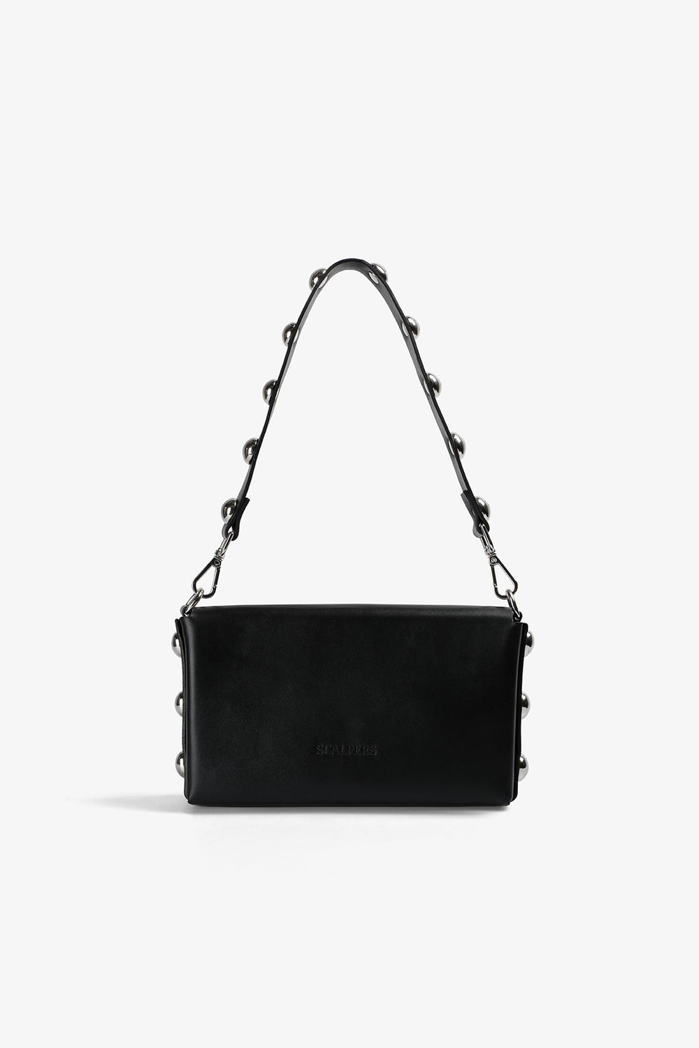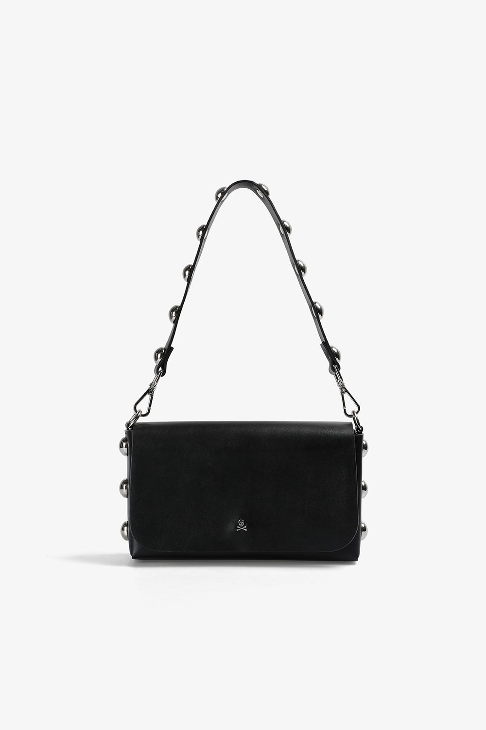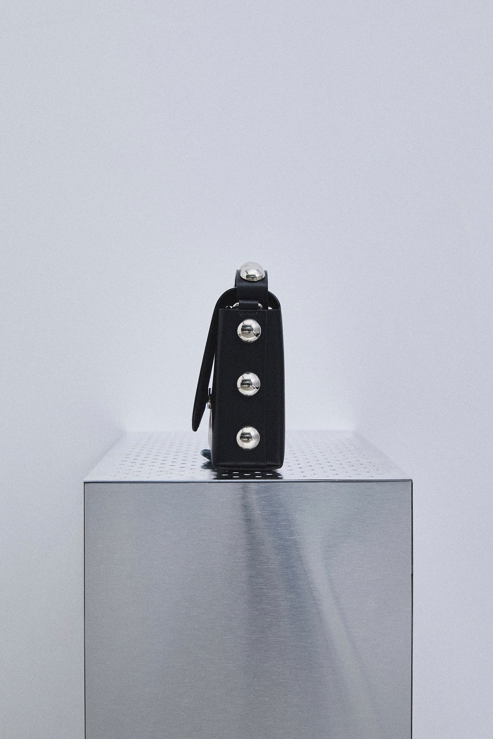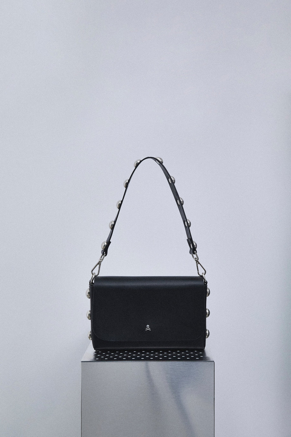 Bolsa mini confecionada em 100% pele com pormenores de studs na alça e nas laterais Pormenor do logótipo metalizado à frente.