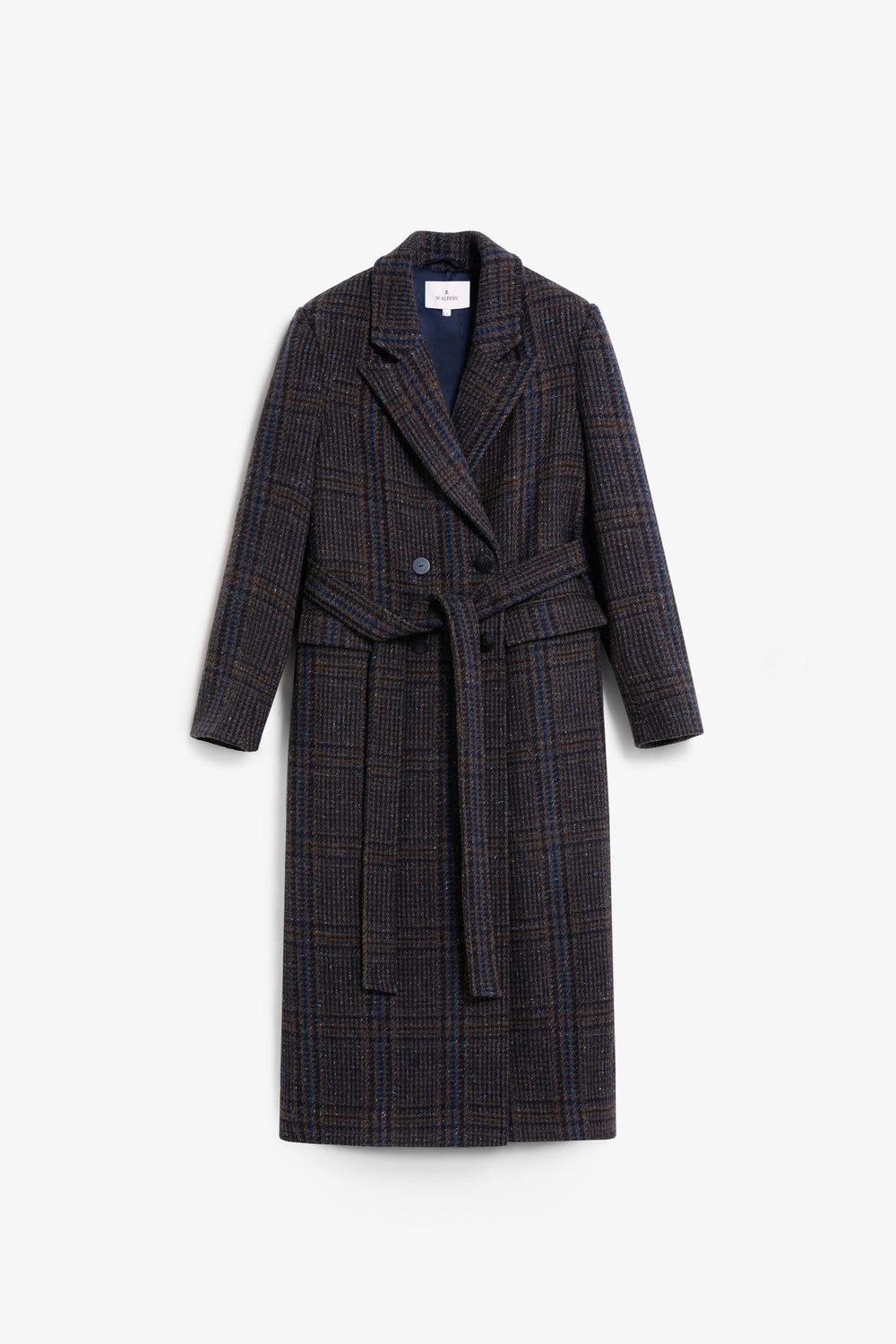 Casaco comprido de lã com padrão xadrez subtil. Com ombreiras, corte a direito e lapelas clássicas. Fecho de botões à frente e cinto no tom para ajustar a cintura. Bolsos laterais.
