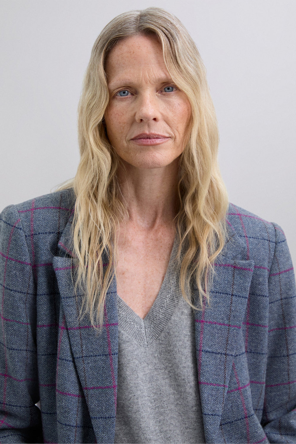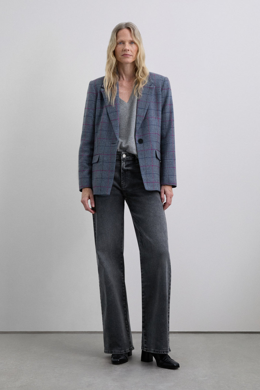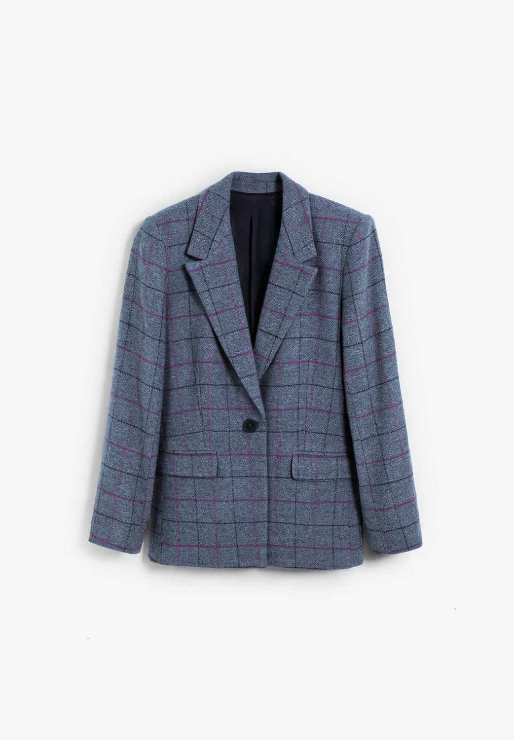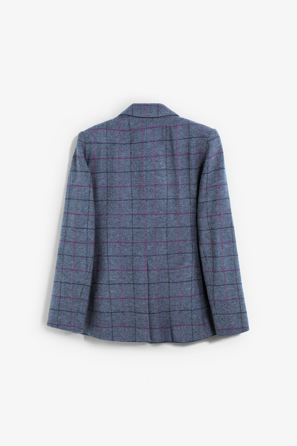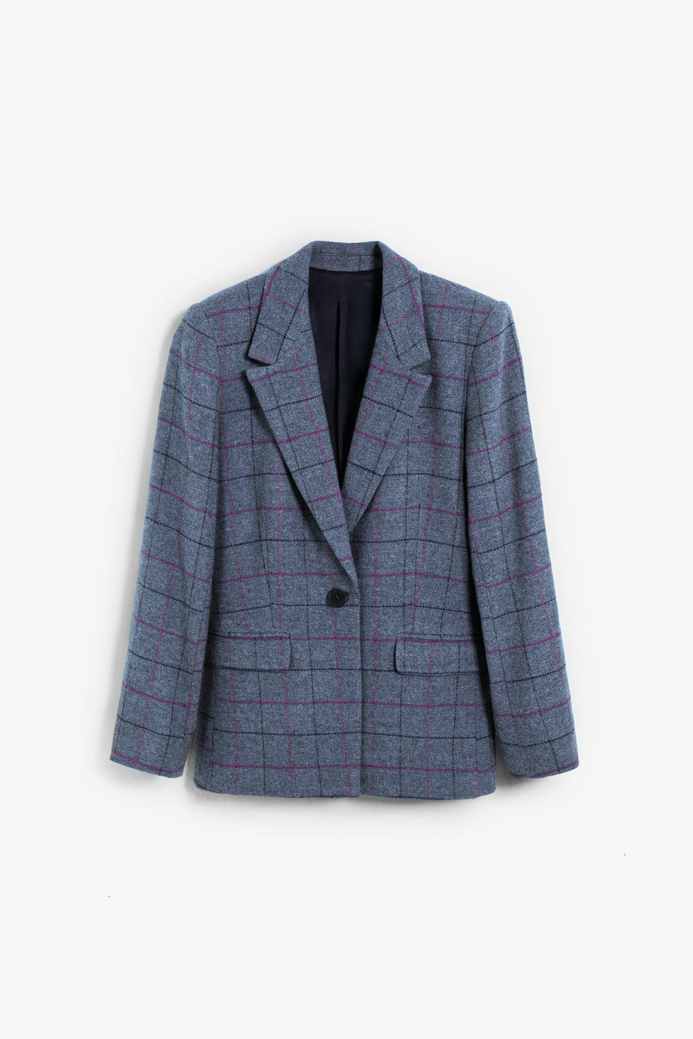Blazer confecionado em lã. Padrão em xadrez. Ombreiras estruturadas. Fecho frontal com botão. Dois bolsos à frente com aba.