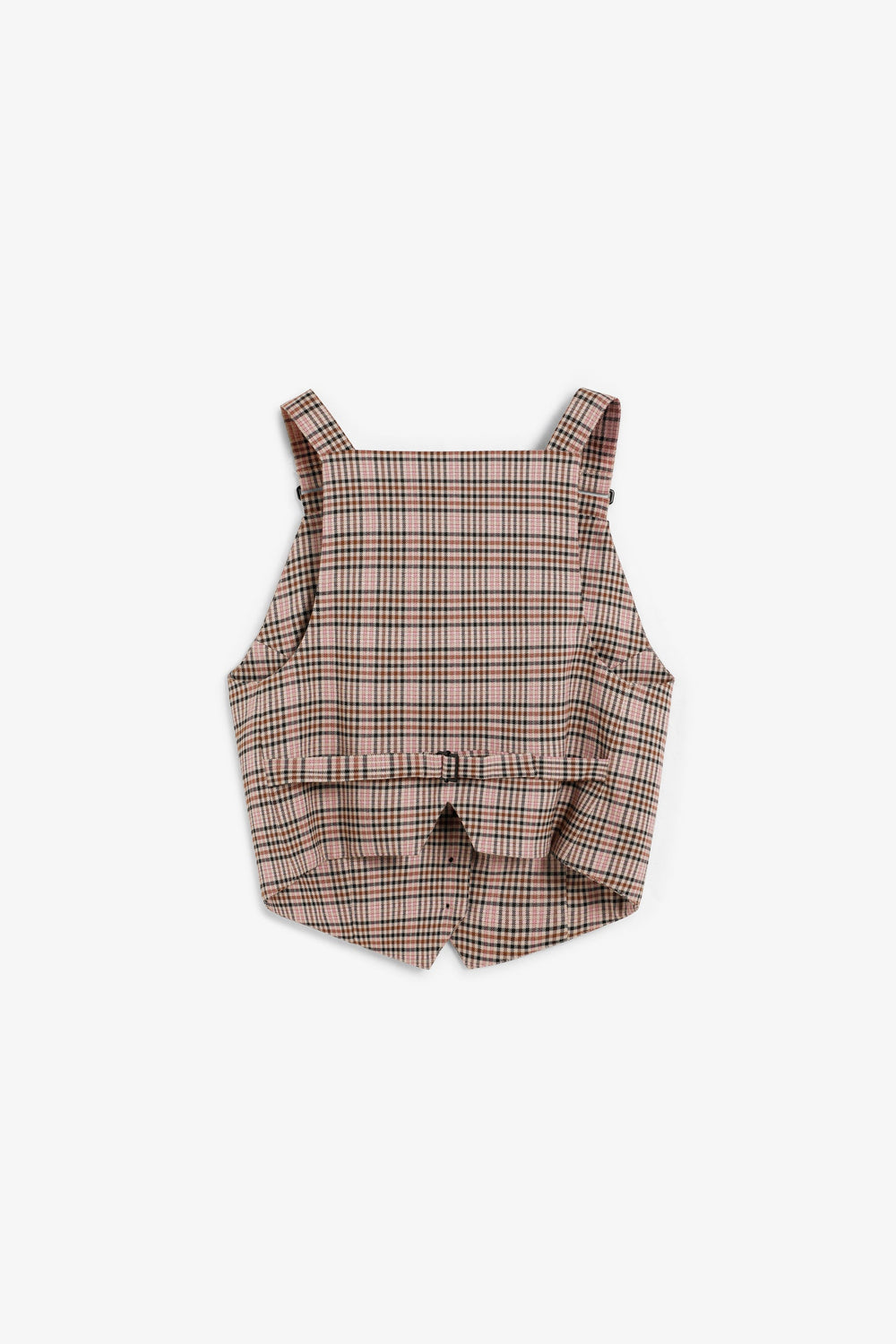 Colete com estampado xadrez. Decote em V. Alças multiusos. Fecho à frente com abotoadura. Dois bolsos à frente.
