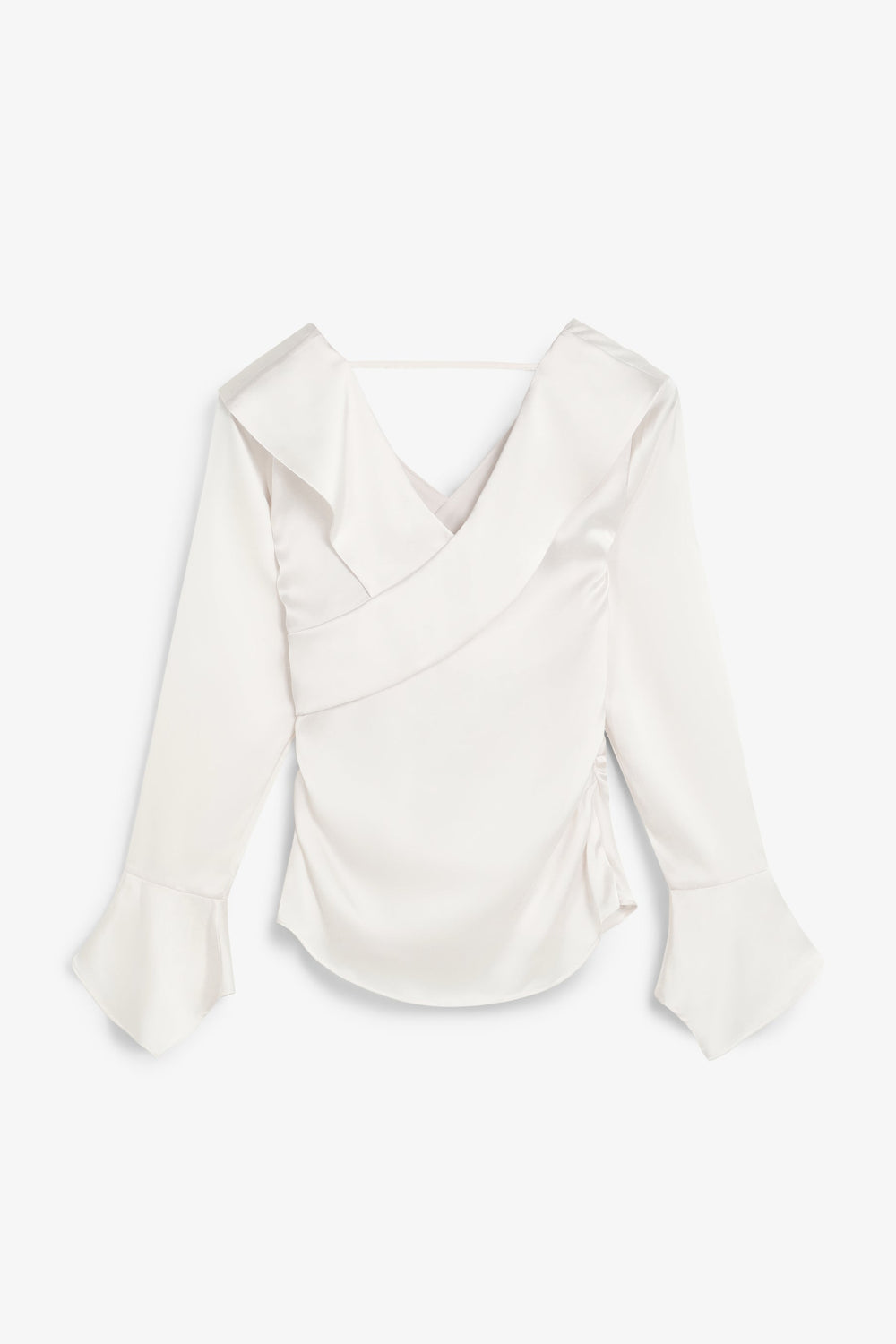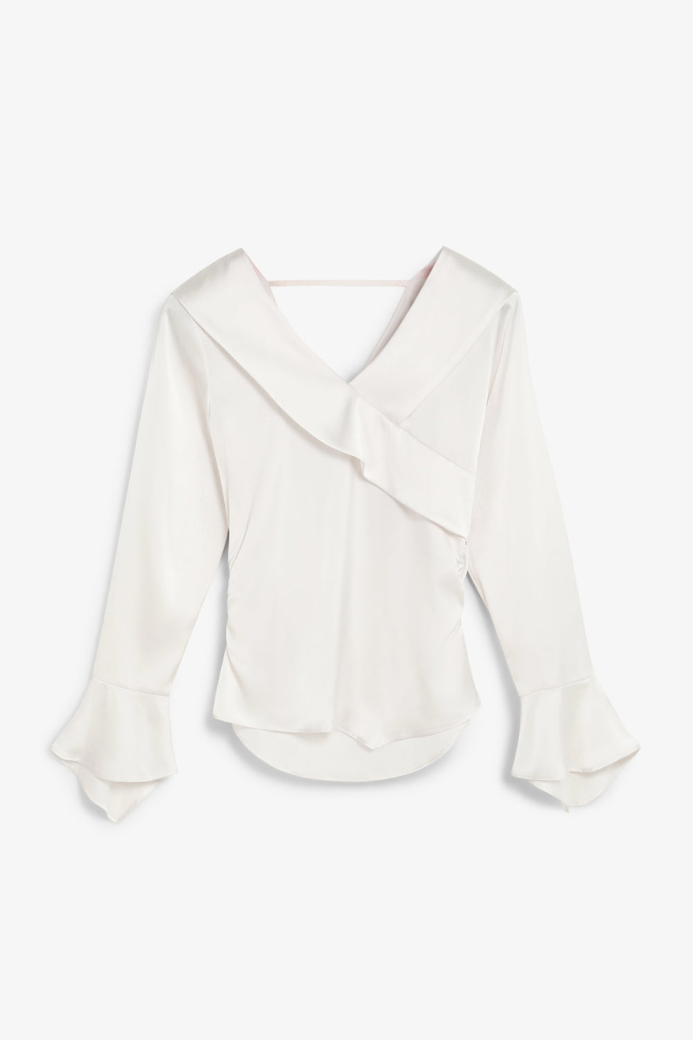 Blusa assimétrica de manga comprida em folho. Cintura franzida e decote em V com pormenor de folho.