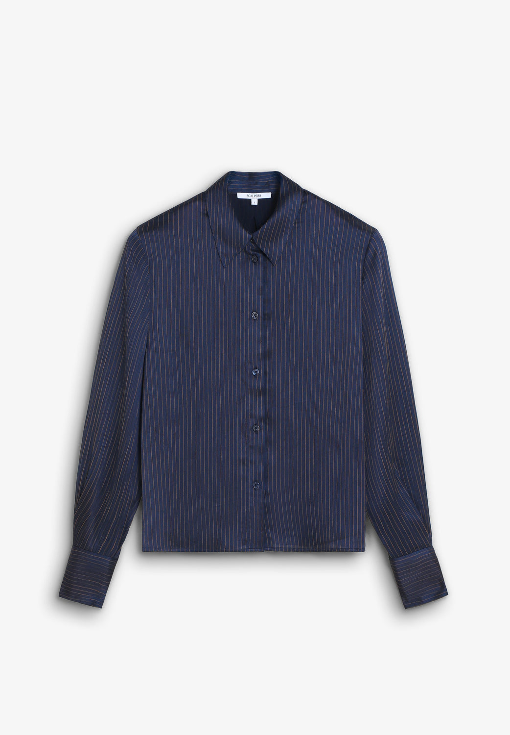 Camisa com estampado de riscas. Manga comprida. Fecho frontal e nos punhos com abotoadura.