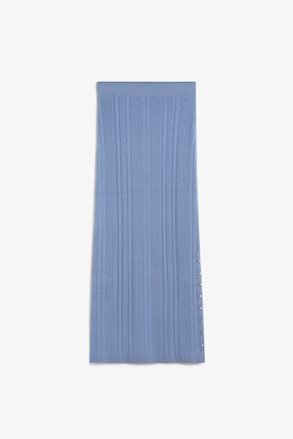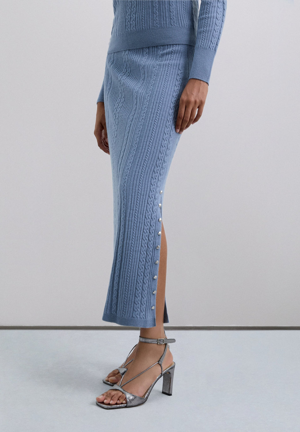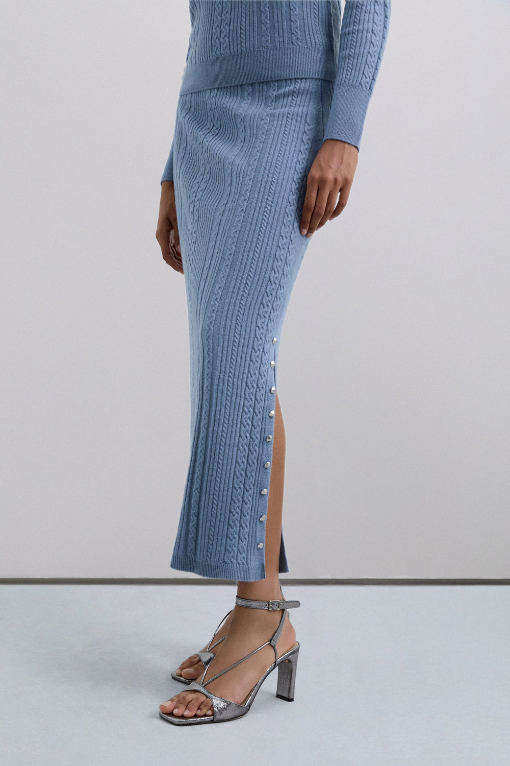 Saia midi confecionada em mistura de lã. Cintura elástica. Abertura lateral. Pormenor de botões.
