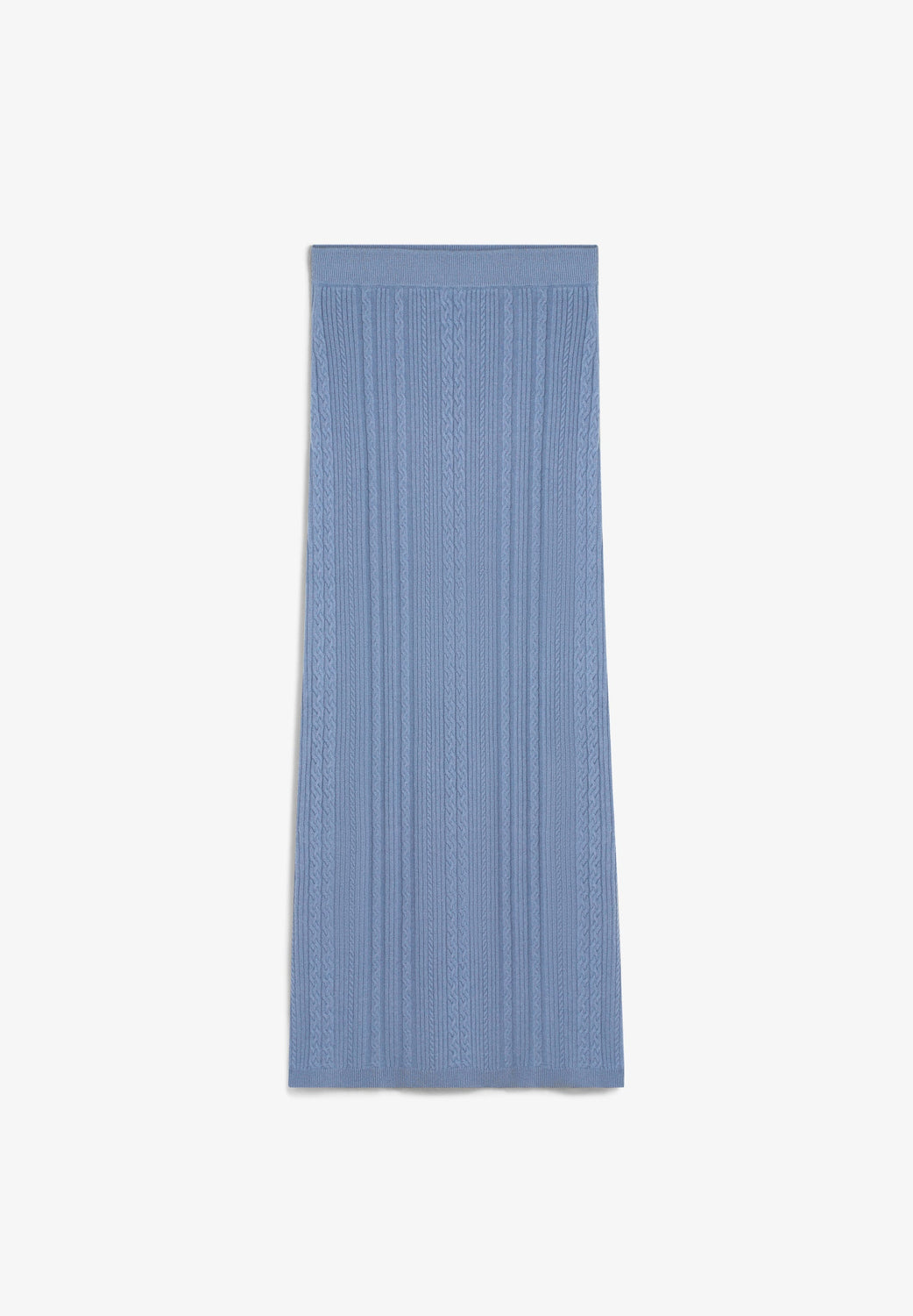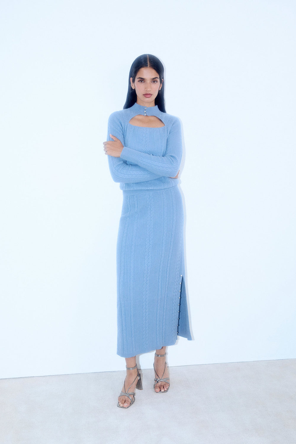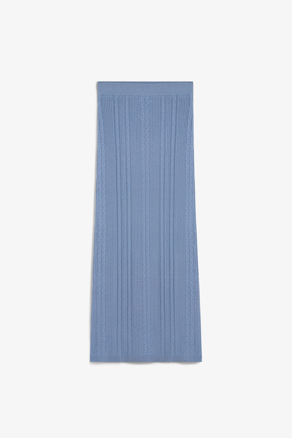 Saia midi confecionada em mistura de lã. Cintura elástica. Abertura lateral. Pormenor de botões.