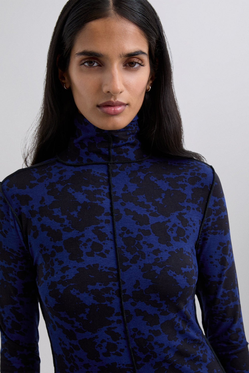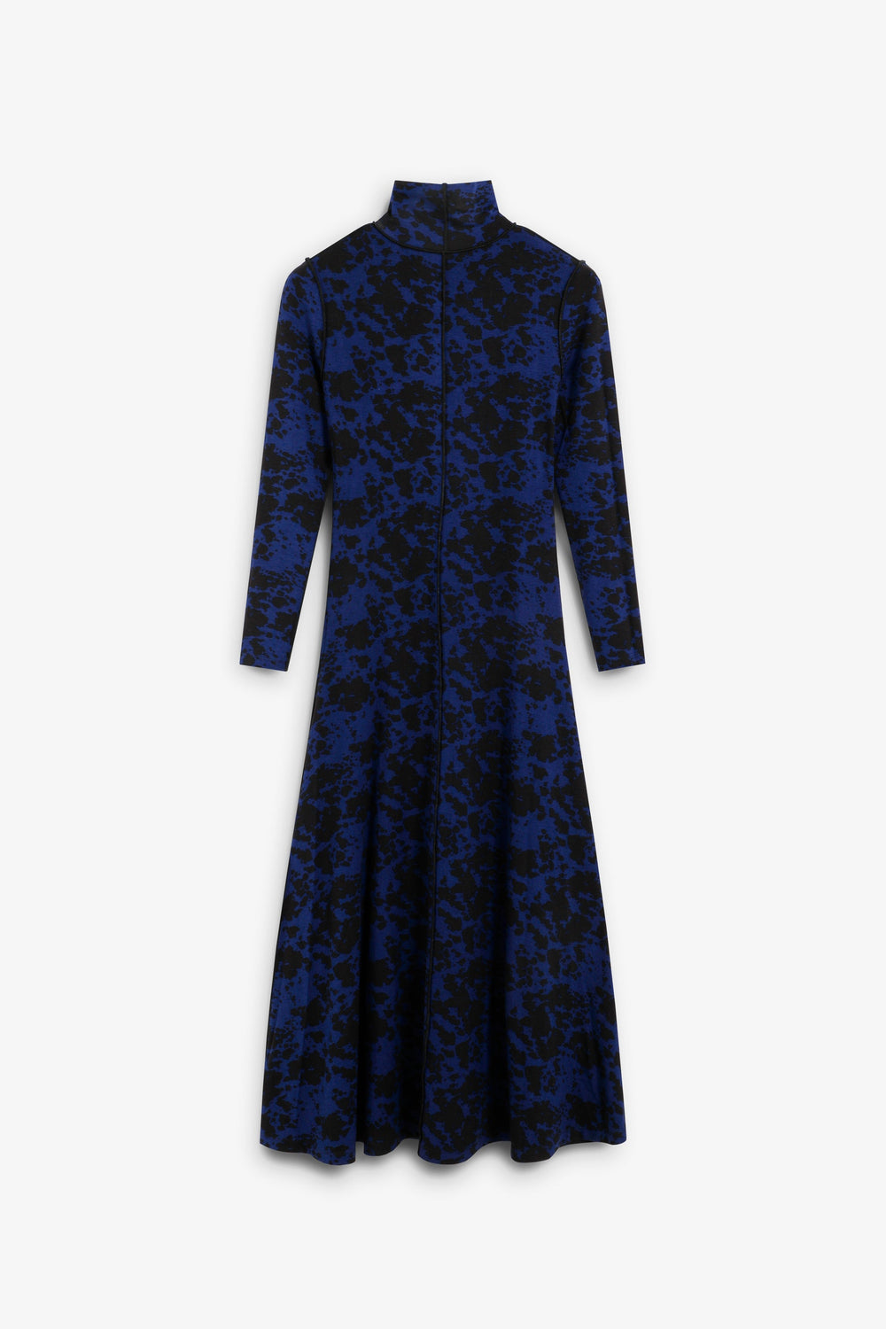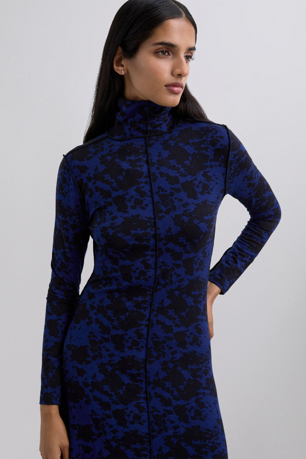 Vestido midi confecionado em viscose ligeiramente elástica. Padrão de estampado animal, gola subida e manga comprida. Pormenores de costuras expostas.