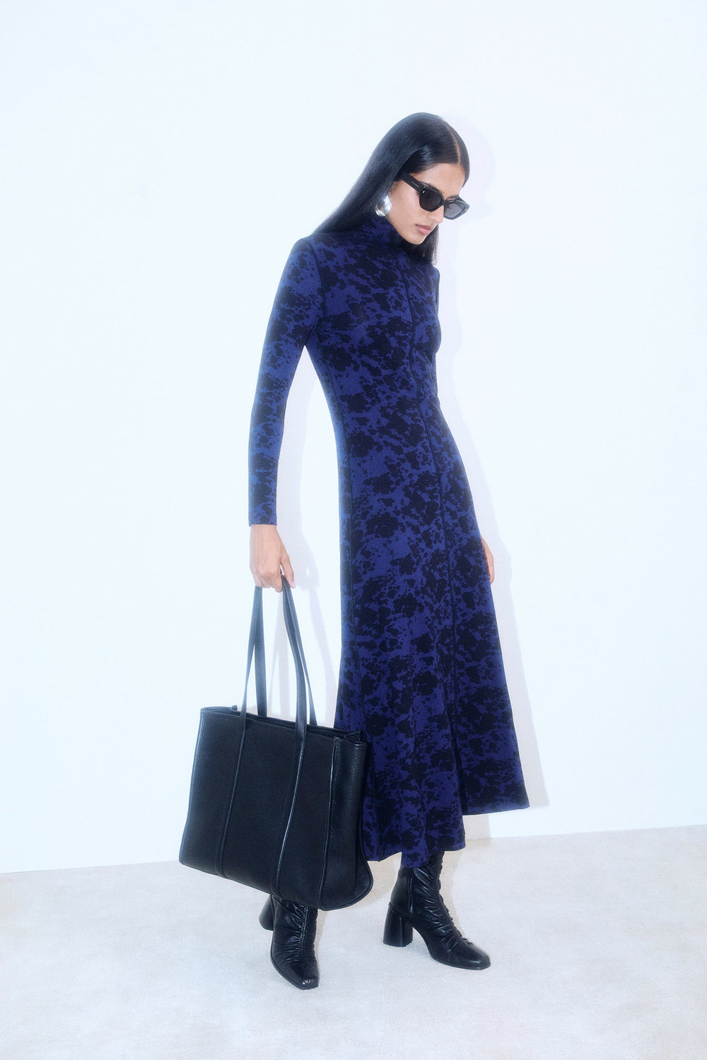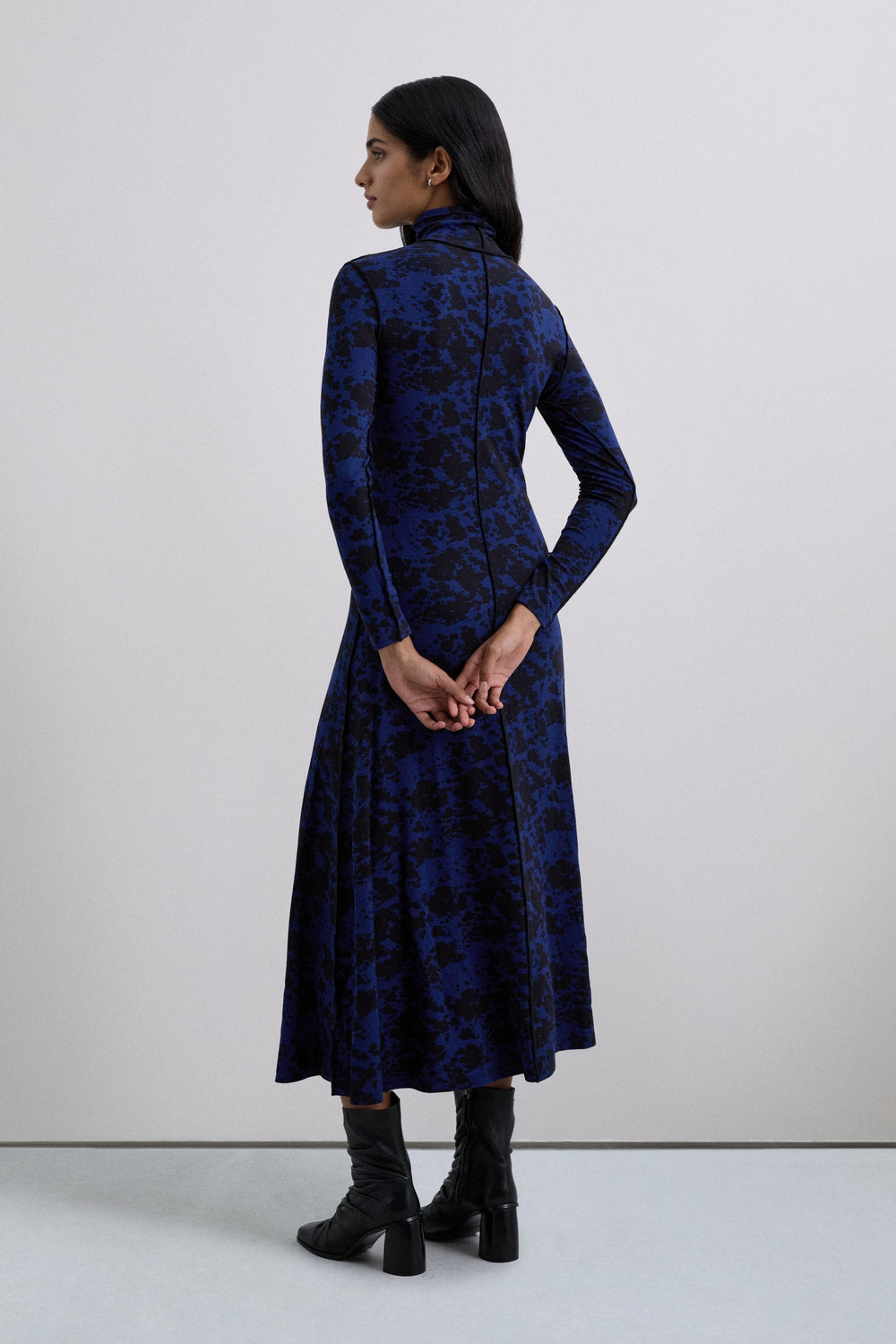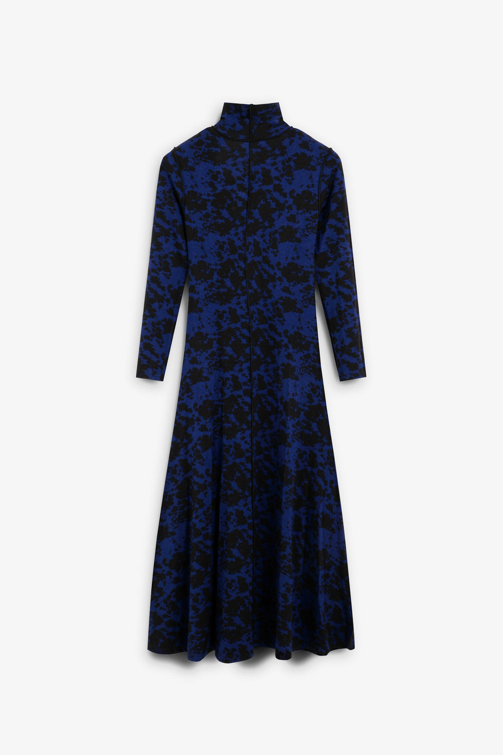 Vestido midi confecionado em viscose ligeiramente elástica. Padrão de estampado animal, gola subida e manga comprida. Pormenores de costuras expostas.