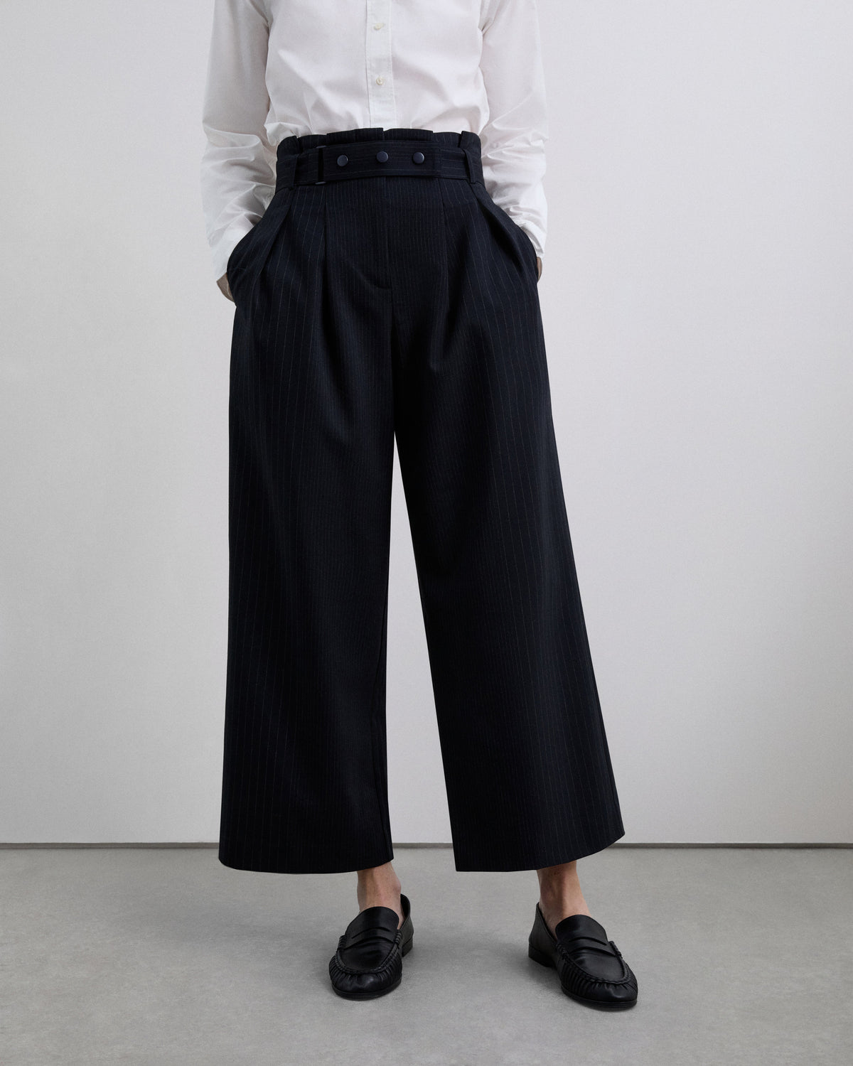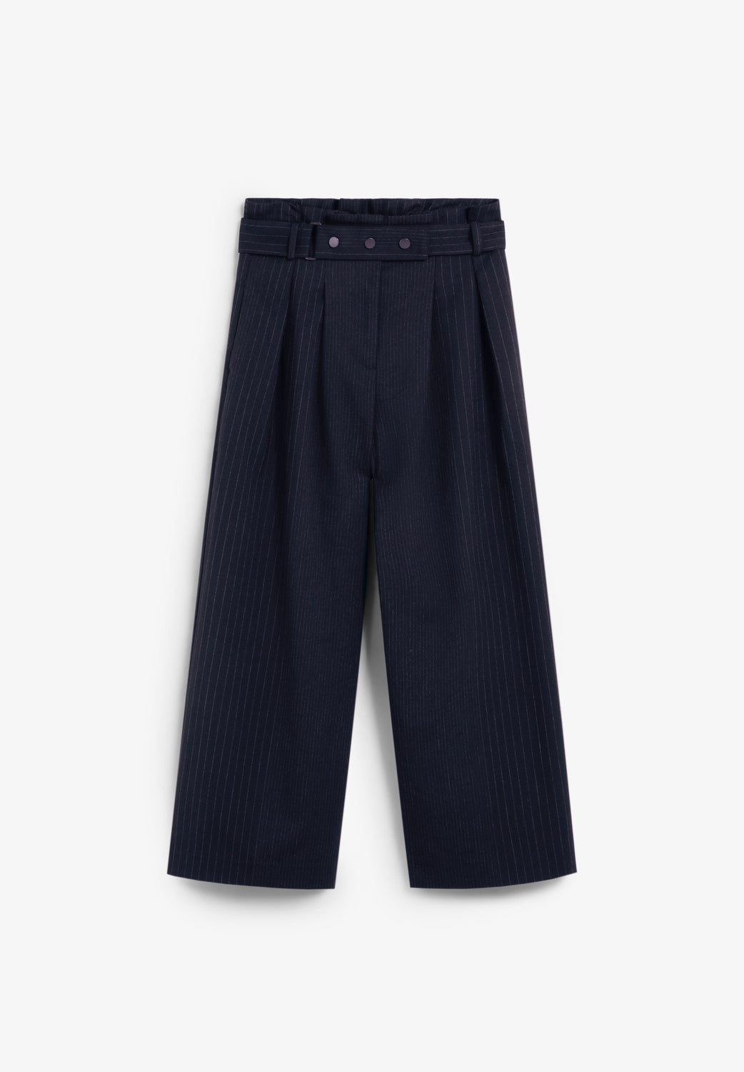 Calças culottes. Corte alto. Presilhas na cintura. Fecho de correr oculto por uma aba com gancho e olhal e botão. Dois bolsos laterais.