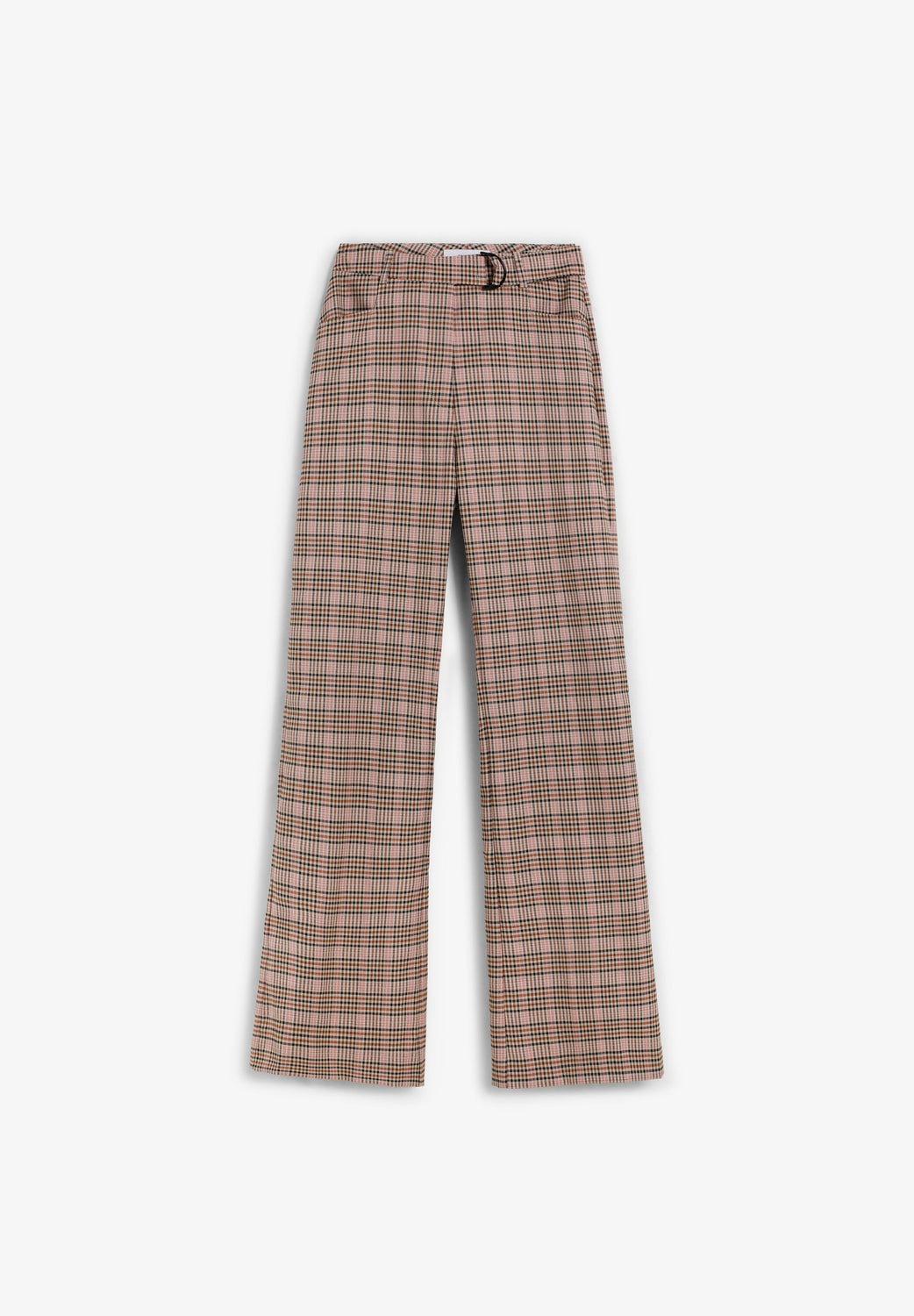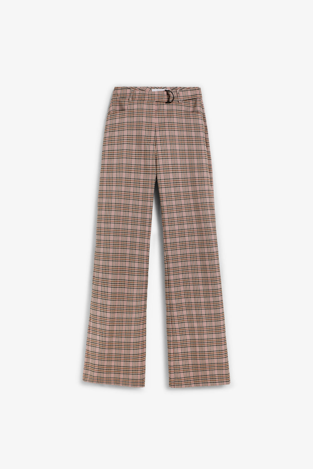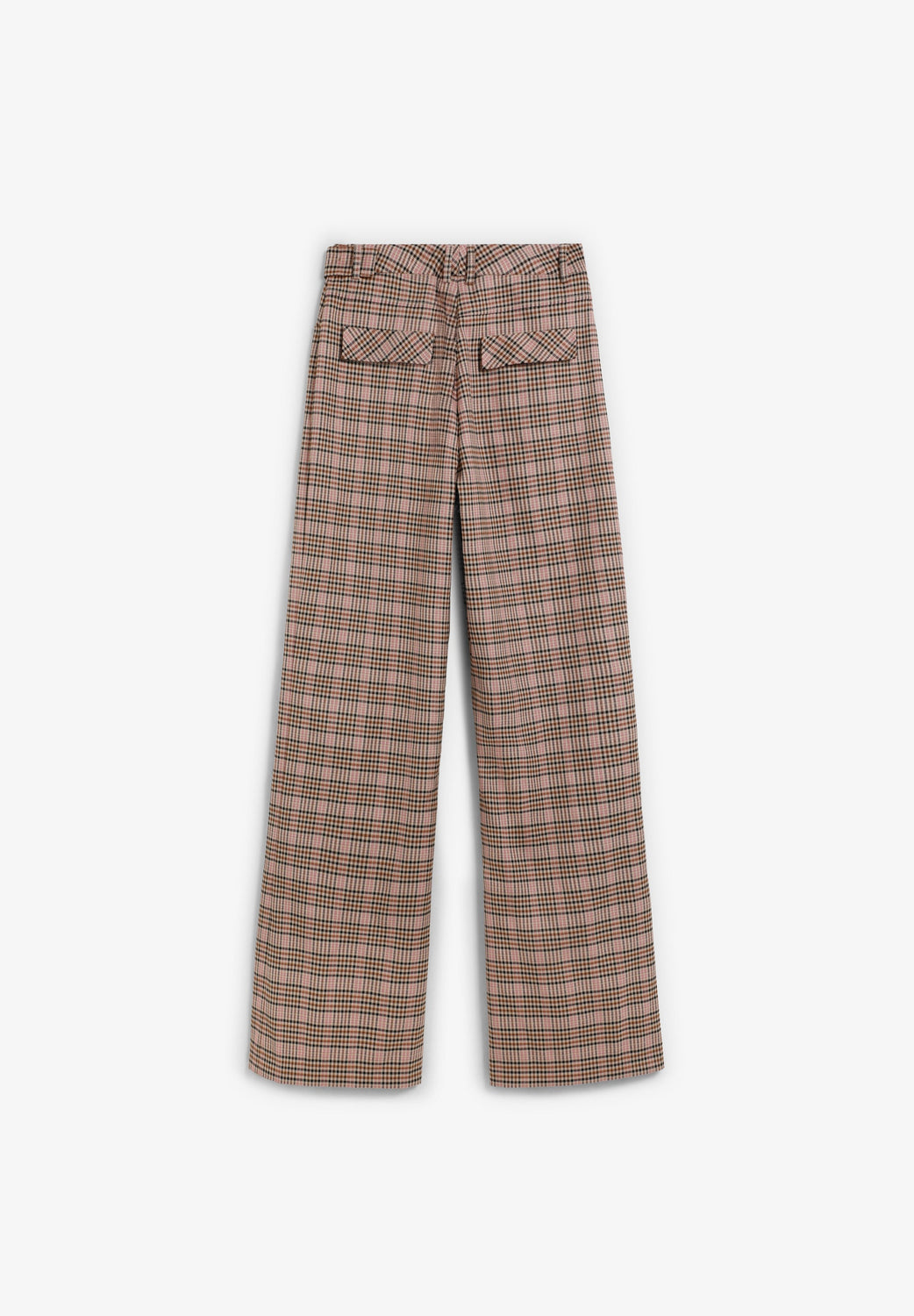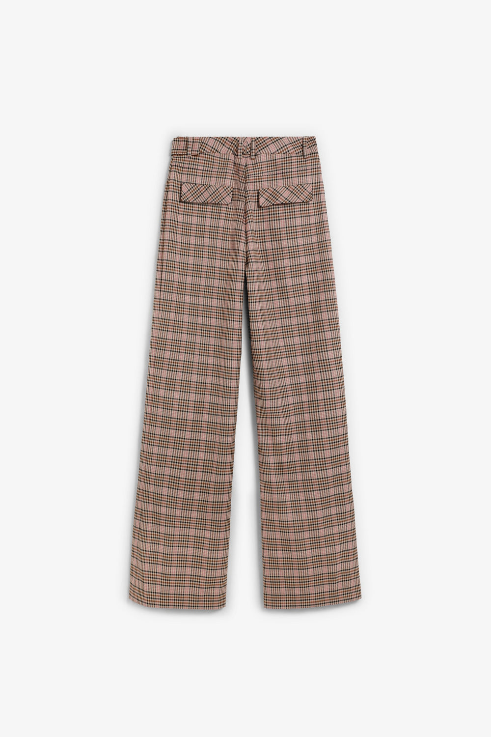 Calças à boca de sino. Bolsos frontais. Bolso com aba na parte traseira. Presilhas na cintura. Padrão em xadrez.