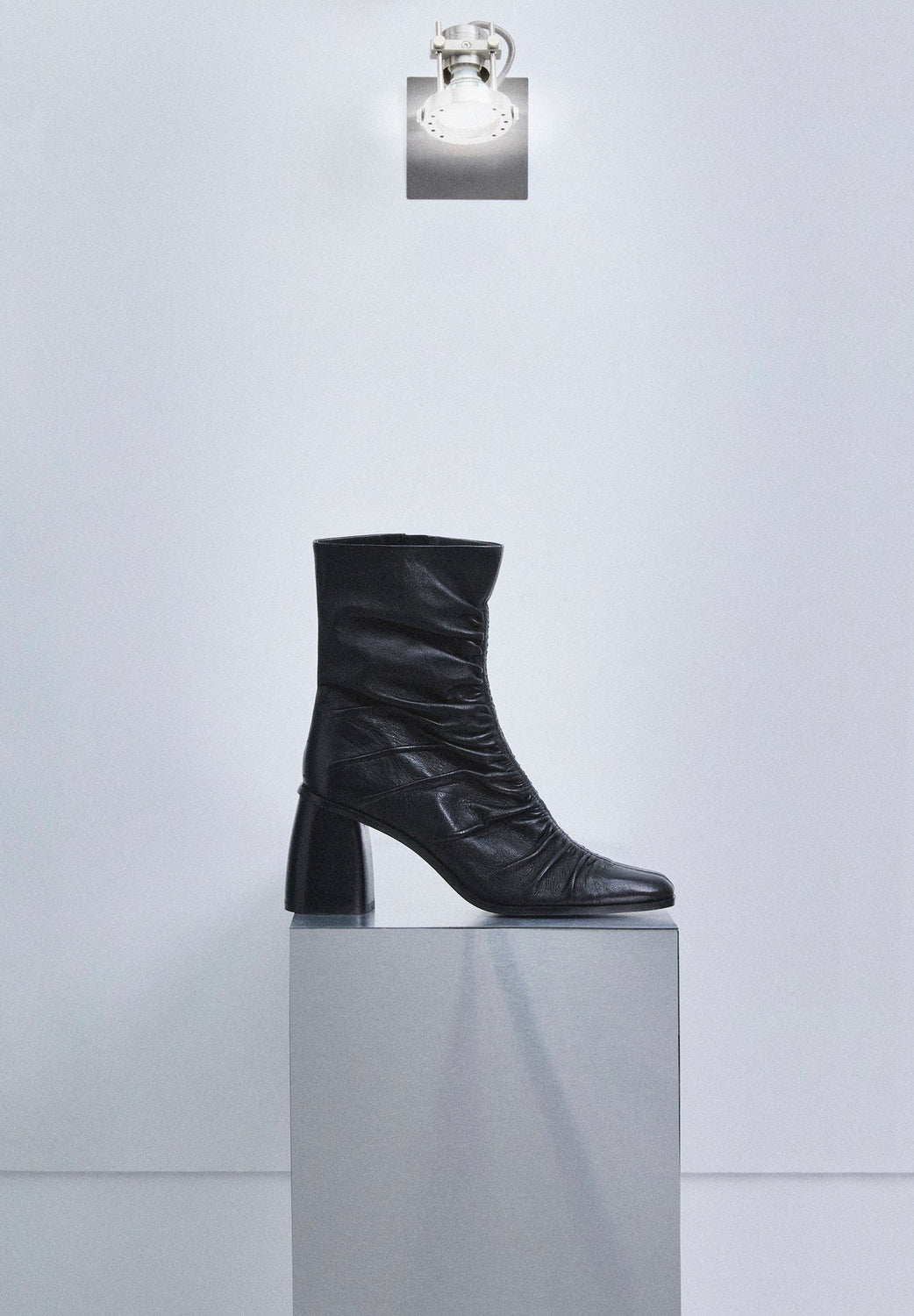 Botas confecionadas em 100% pele. Tacão médio. Pormenor de efeito drapeado no centro, à frente. Fecho de correr. Pormenor de logótipo bordado no fecho de correr. Altura do tacão: 5 cm.