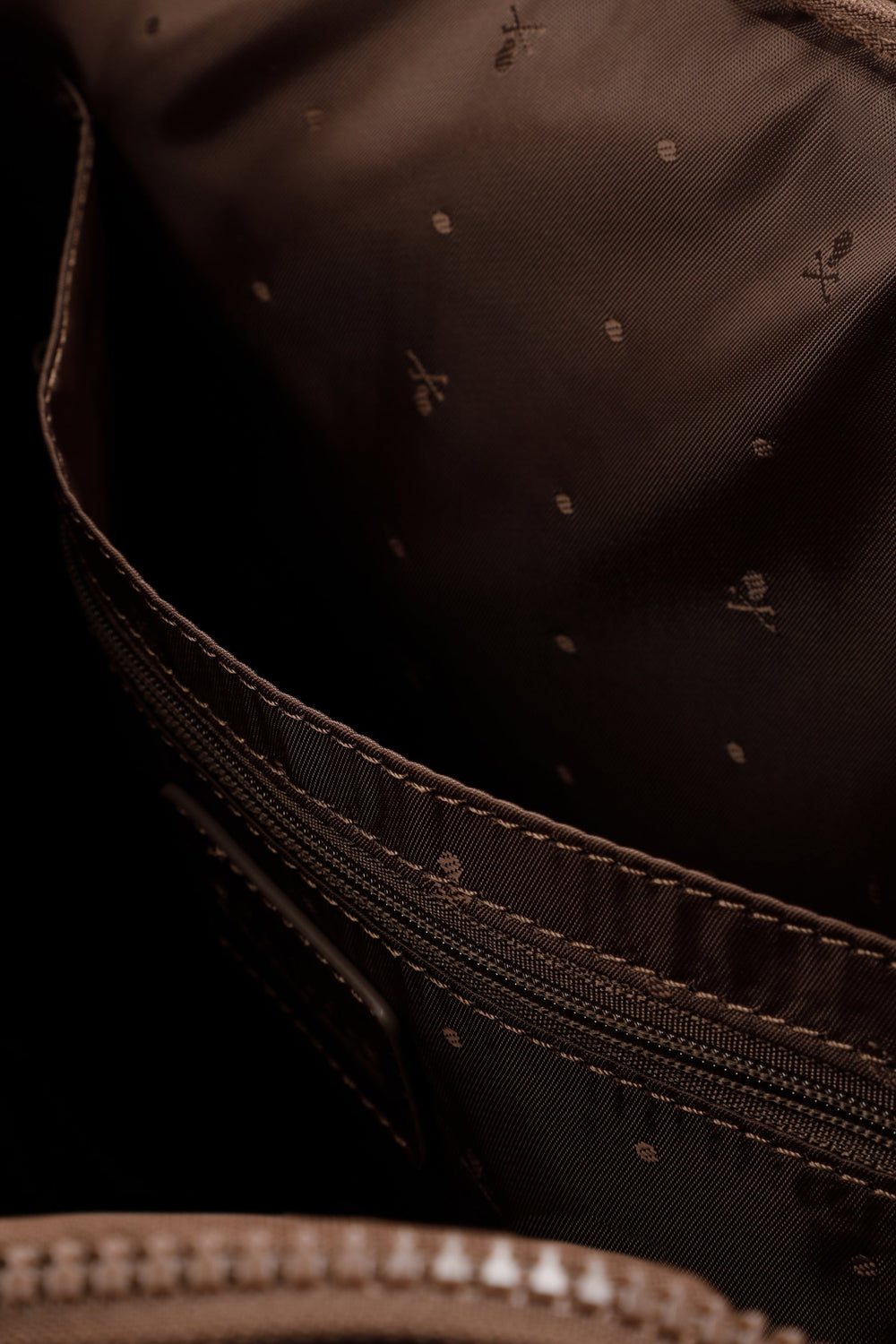 Portfólio com aba e fecho de correr. Pormenor de skull bordada no tom. Pormenor de corda metálica com skull. Forro com padrão de skull. Bolso interior com zip.