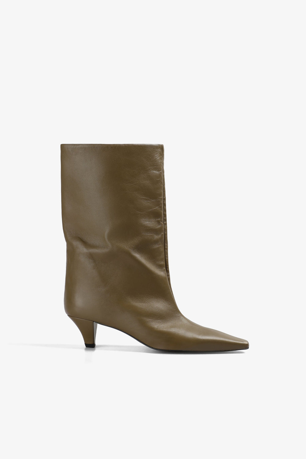 Bota confecionada em 100% pele. Pormenor da cano com franzido. Tacão Kitten médio. Abiqueira pontiaguda.