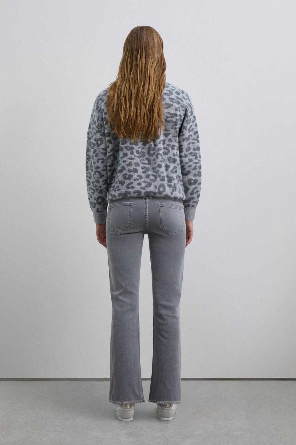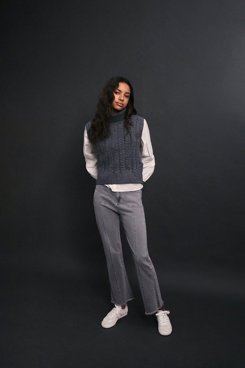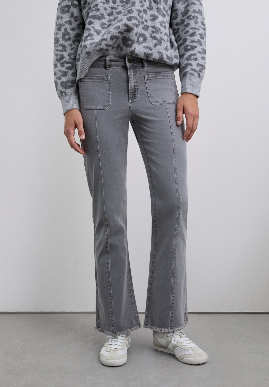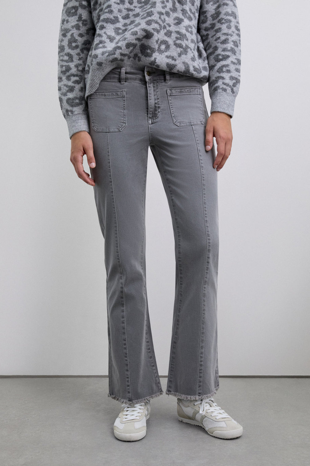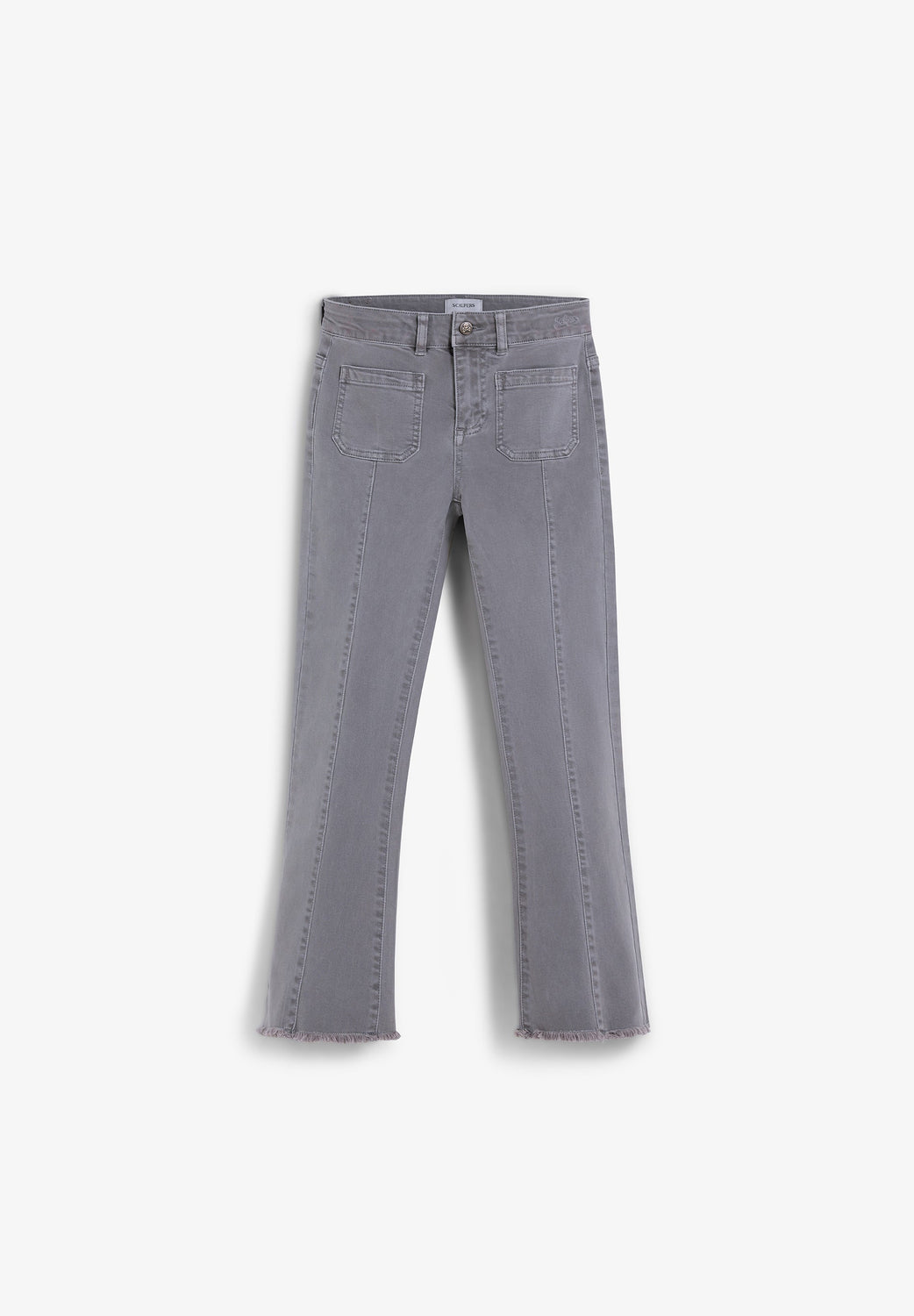 Calças boca de sino confecionadas em algodão BCI. Fecho com botão e zip. Presilhas na cintura. Bolsos à frente e atrás. Pormenor de costura na parte frontal. Abertura lateral e bainhas desfiadas.