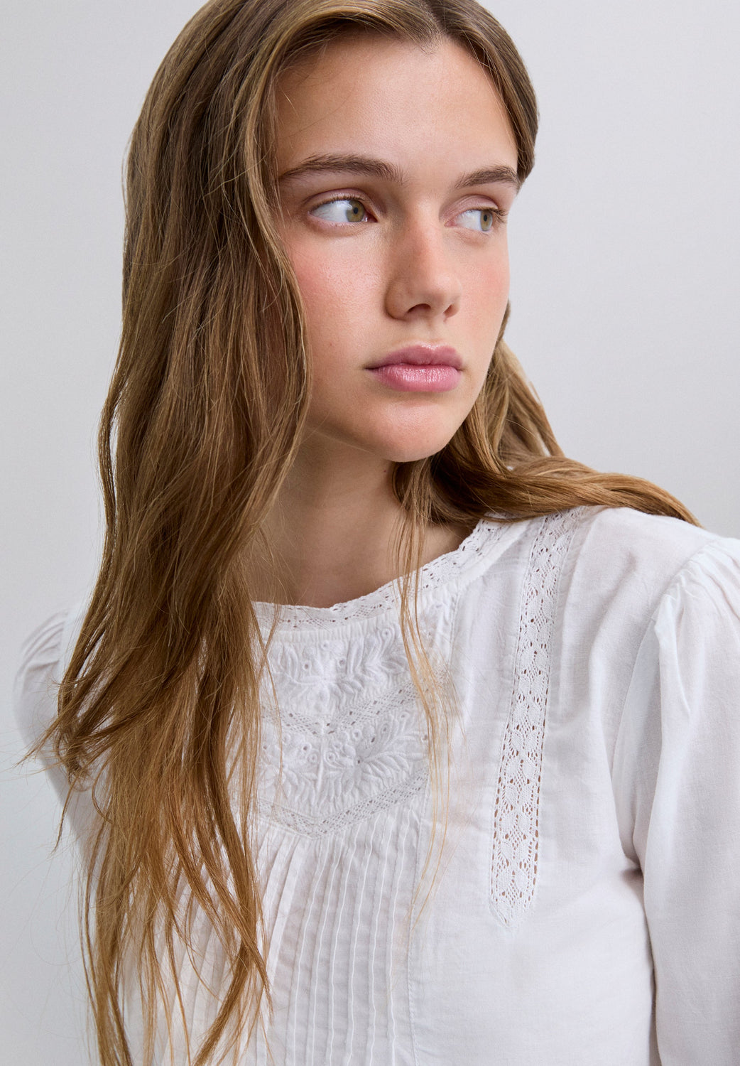 Blusa confecionada em tecido 100% algodão BCI. Regular fit. Decote redondo. Manga comprida abalonada terminada em elástico. Pormenor metálico de skull na cintura. Pormenores de bordados na gola e à frente. Fecho atrás com botão.
