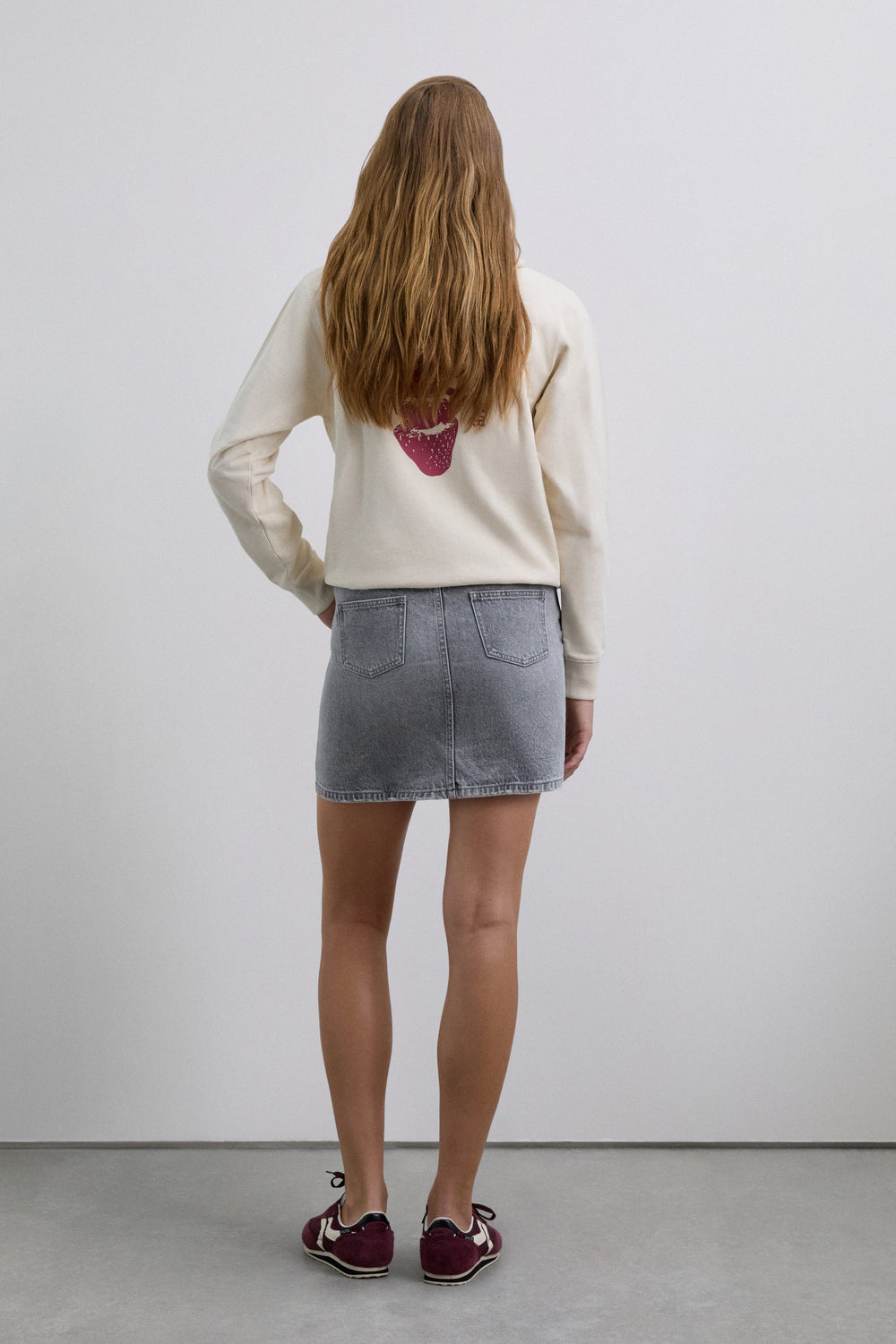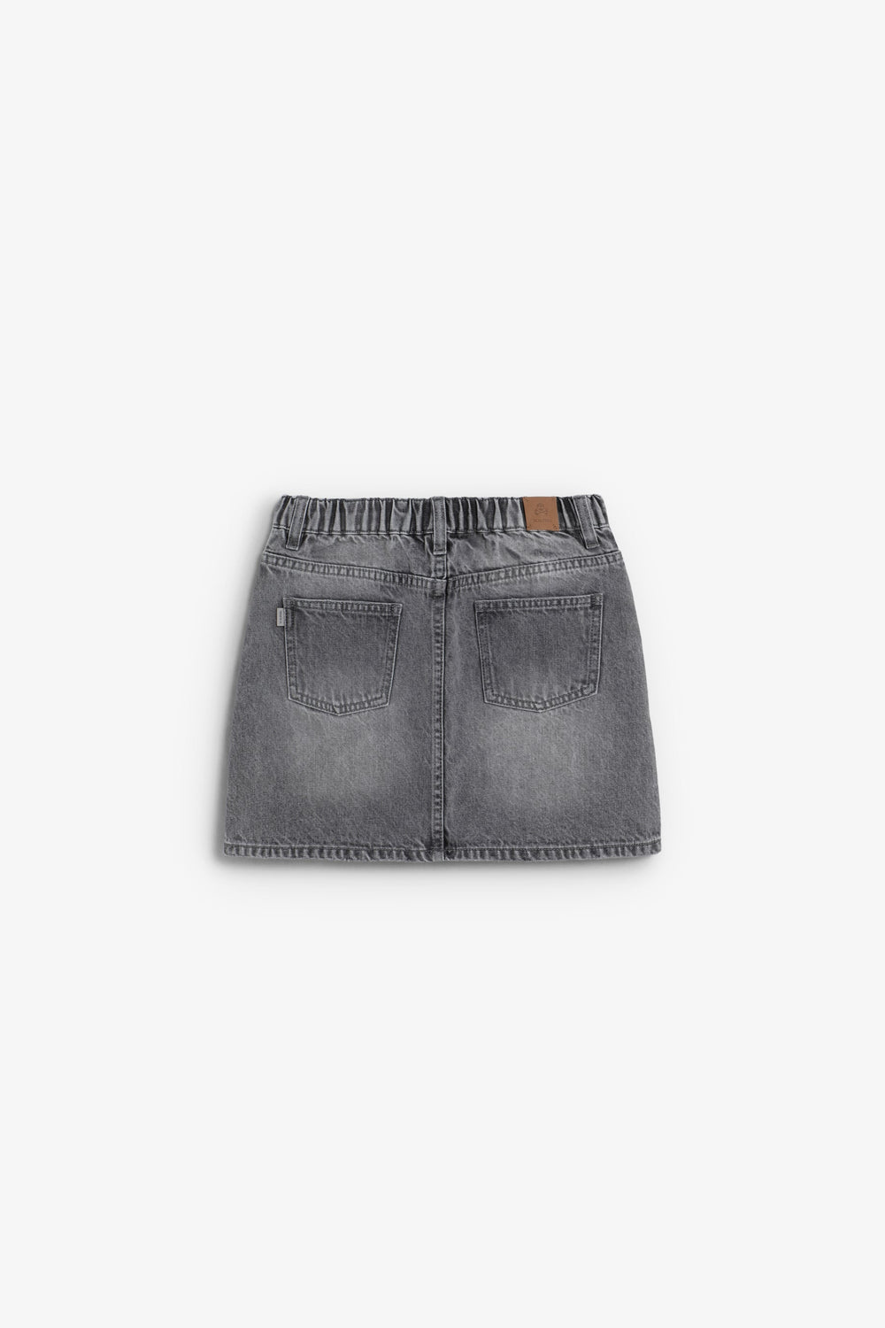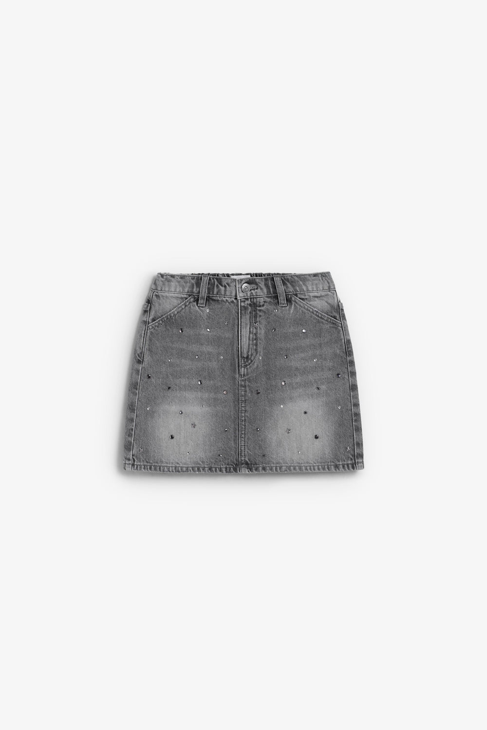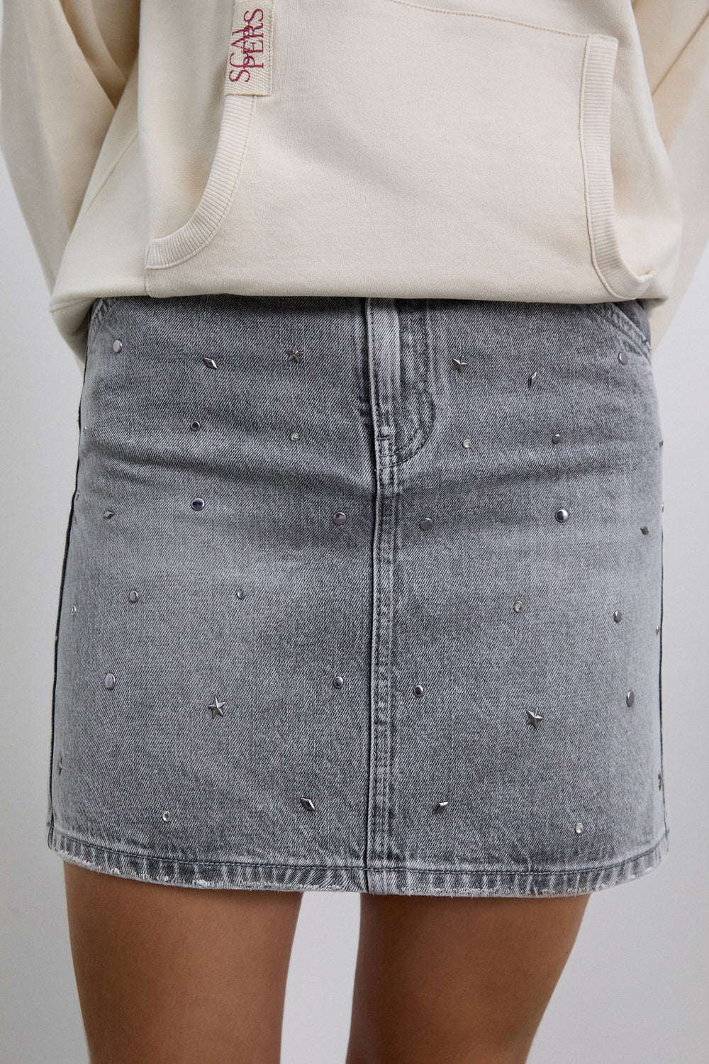 Minissaia denim confecionada em 100% algodão BCI. Pormenor de tachas. Fecho com botão e zip. Presilhas na cintura. Dois bolsos à frente e atrás.