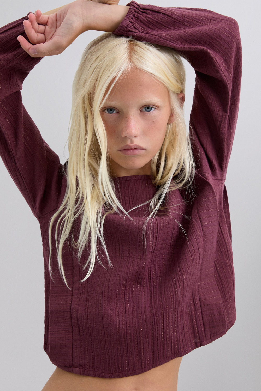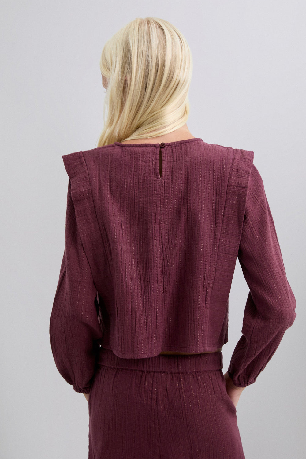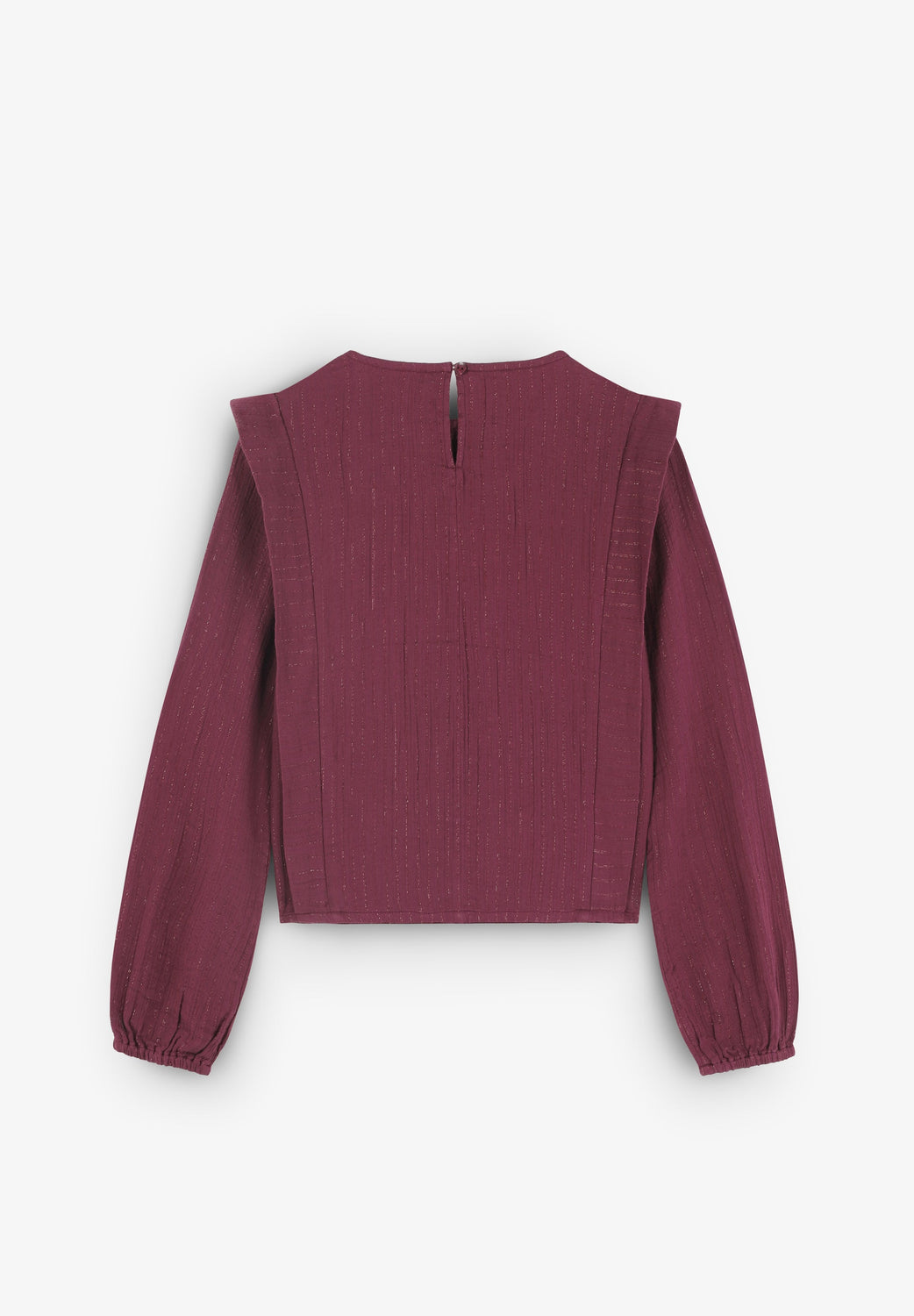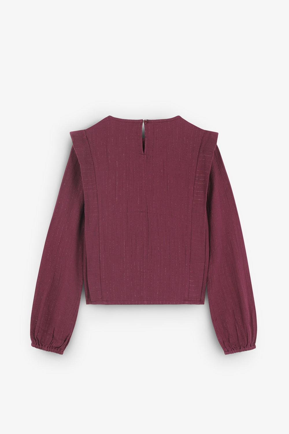 Blusa confecionada em algodão BCI. Decote redondo. Pregas à frente. Detalhes canelados. Manga comprida. Punhos elásticos. Fecho atrás com botão.