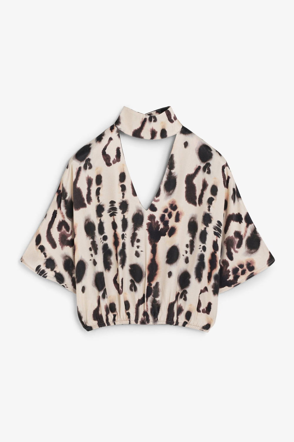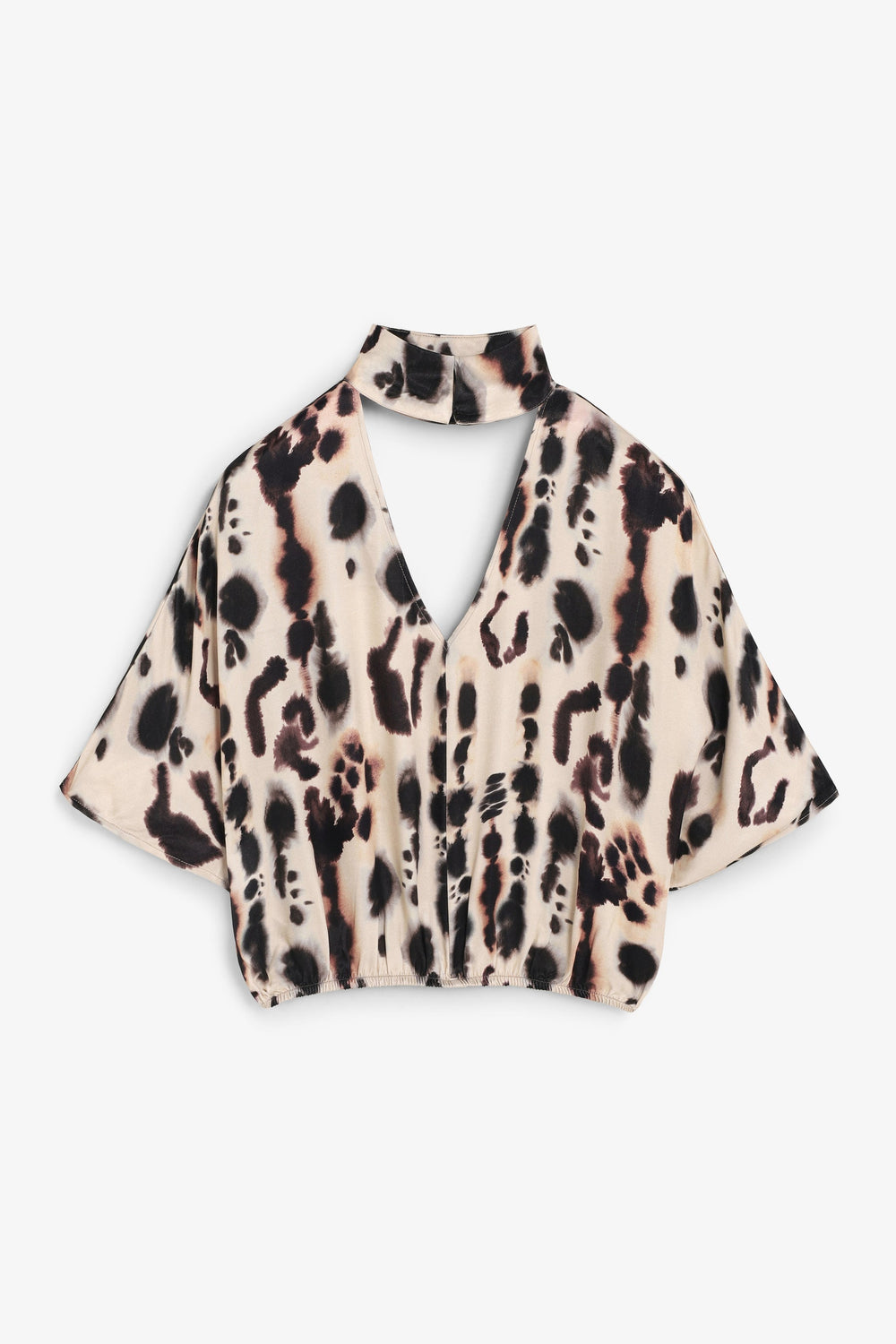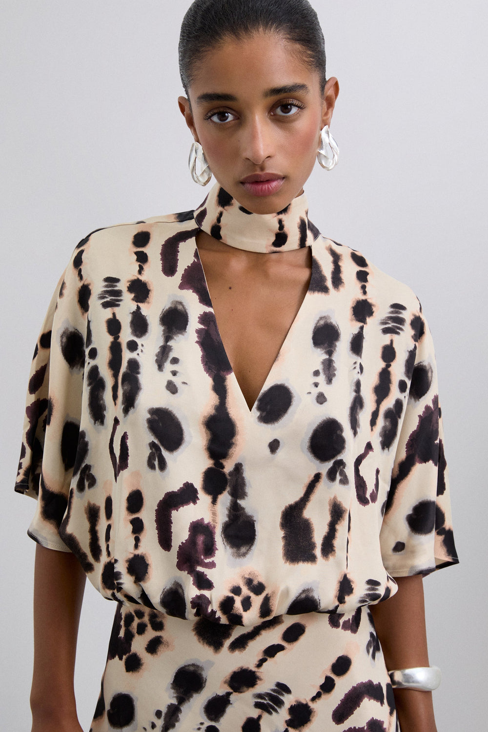 Camisa acetinada de manga curta e pormenor na gola. Decote em V e justo ao pescoço. Camisa fluida com padrão.
