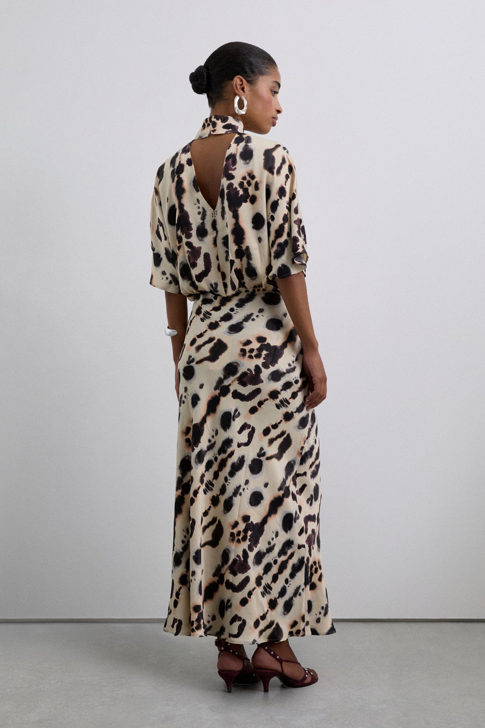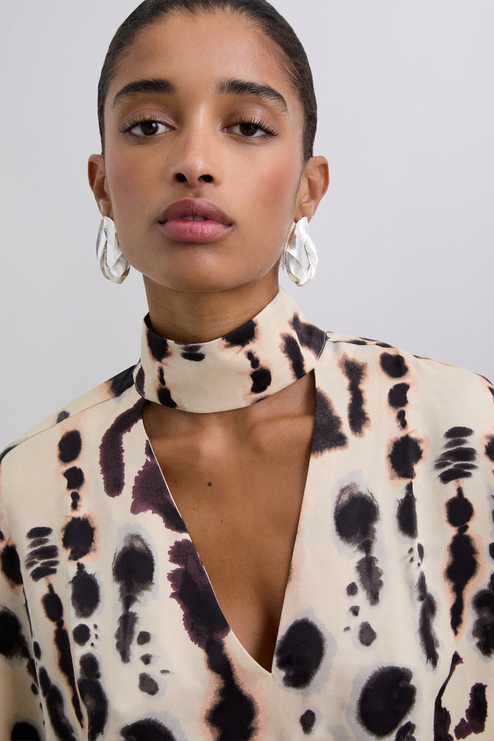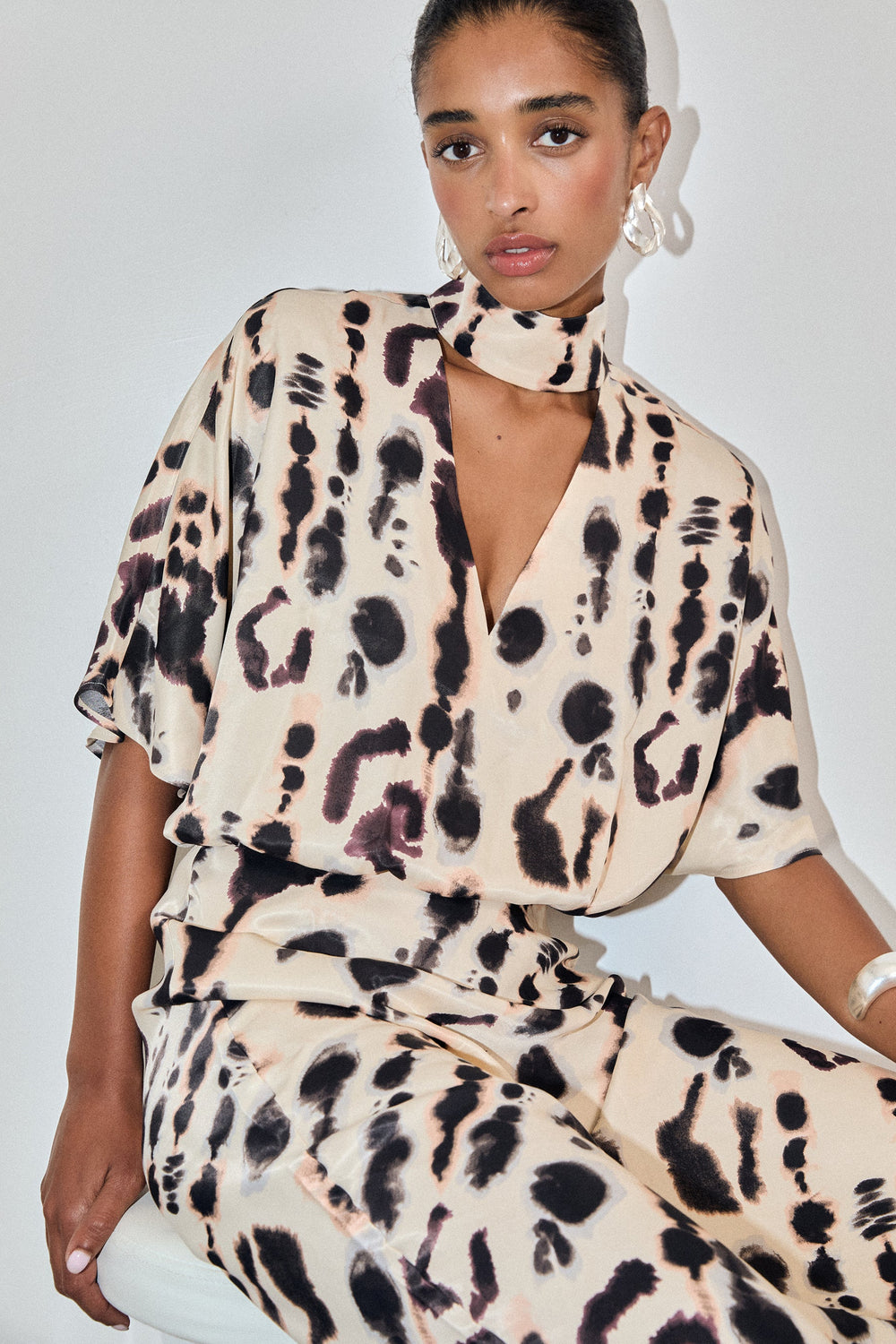 Camisa acetinada de manga curta e pormenor na gola. Decote em V e justo ao pescoço. Camisa fluida com padrão.