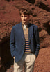 Casaco em linho com um corte justo desportivo. Fecho de abotoadura simples. Lapela entalhada. Bolso de ilhós no peito, bolsos laterais com aba. Abertura traseira. Forro.
