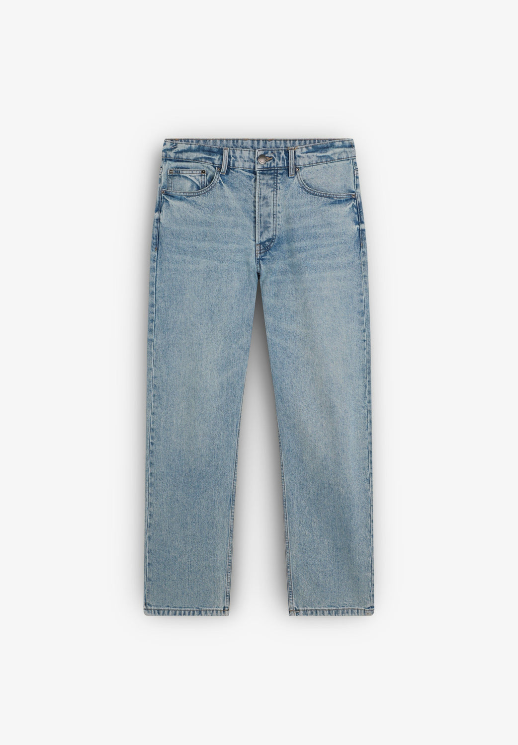 Calças jeans confecionadas em algodão BCI. Fecho com botão e zip. Dois bolsos laterais e traseiros. Presilhas na cintura.