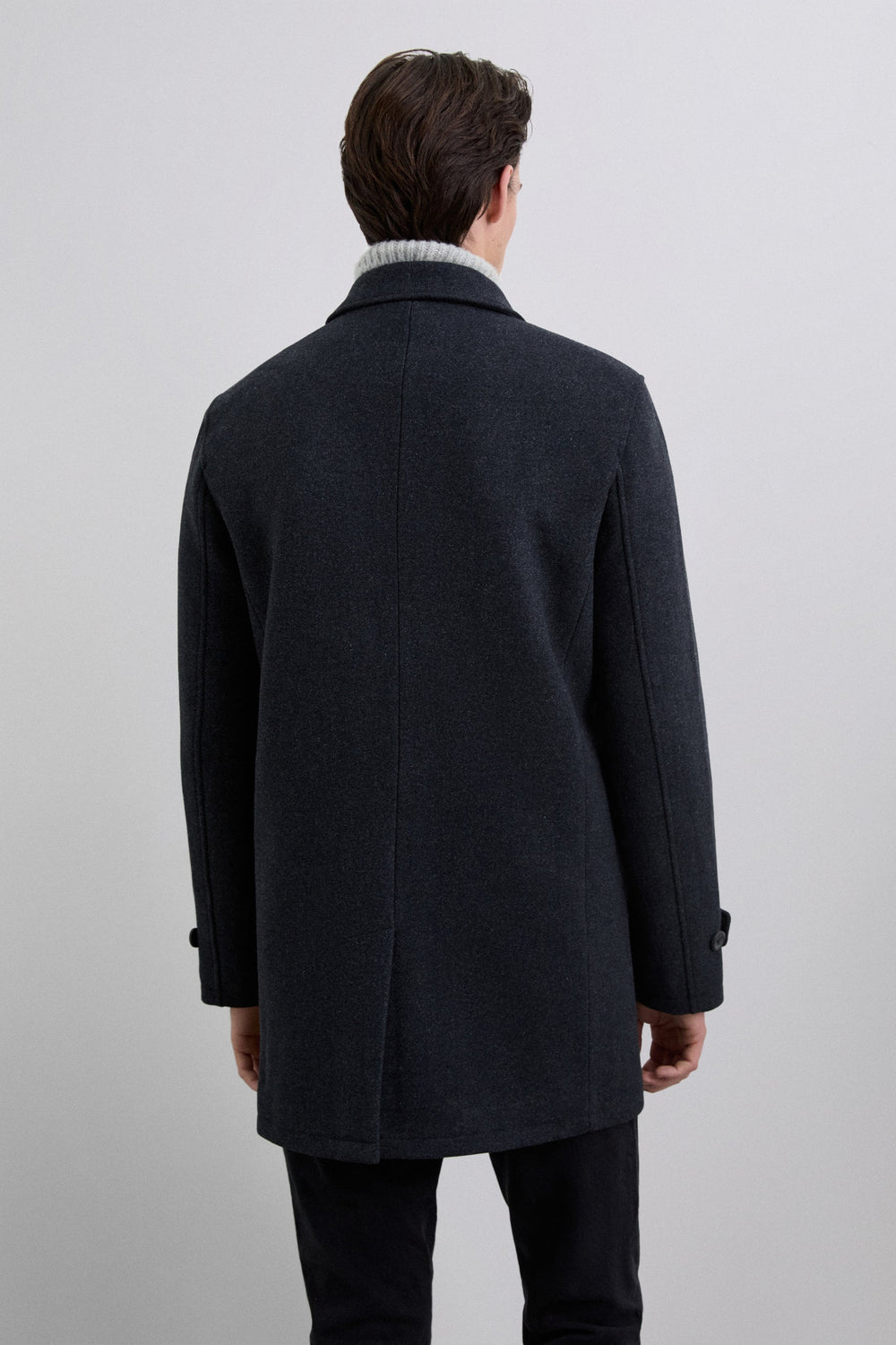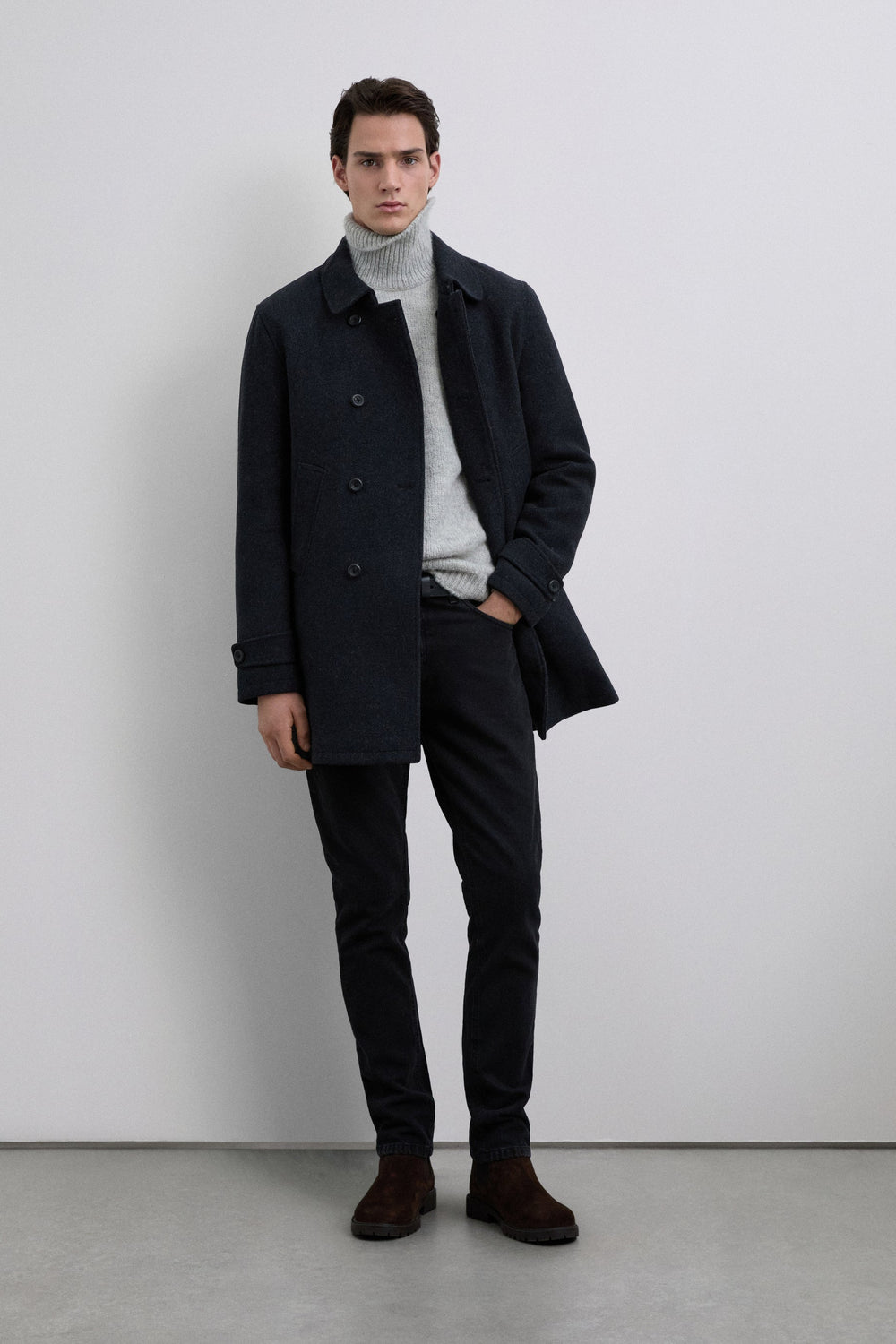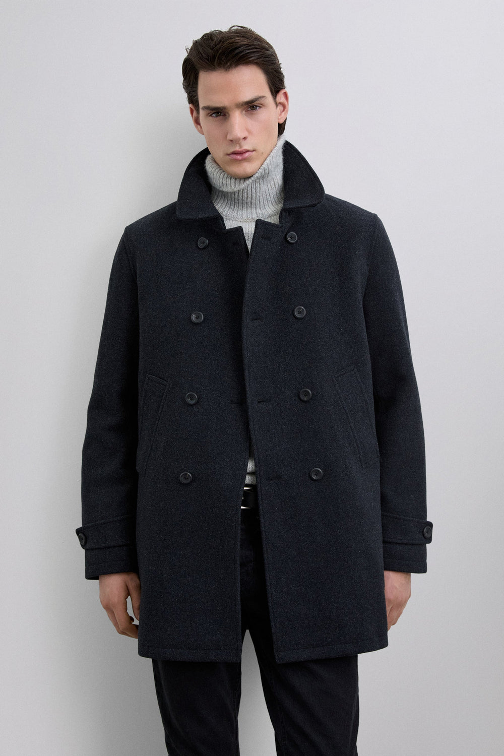 Casaco cruzado confecionado em mistura de lã. Abotoadura à frente. Bolsos de linhas vivas inclinados à frente. Bolso interior. Pormenor do punho com presilhas.