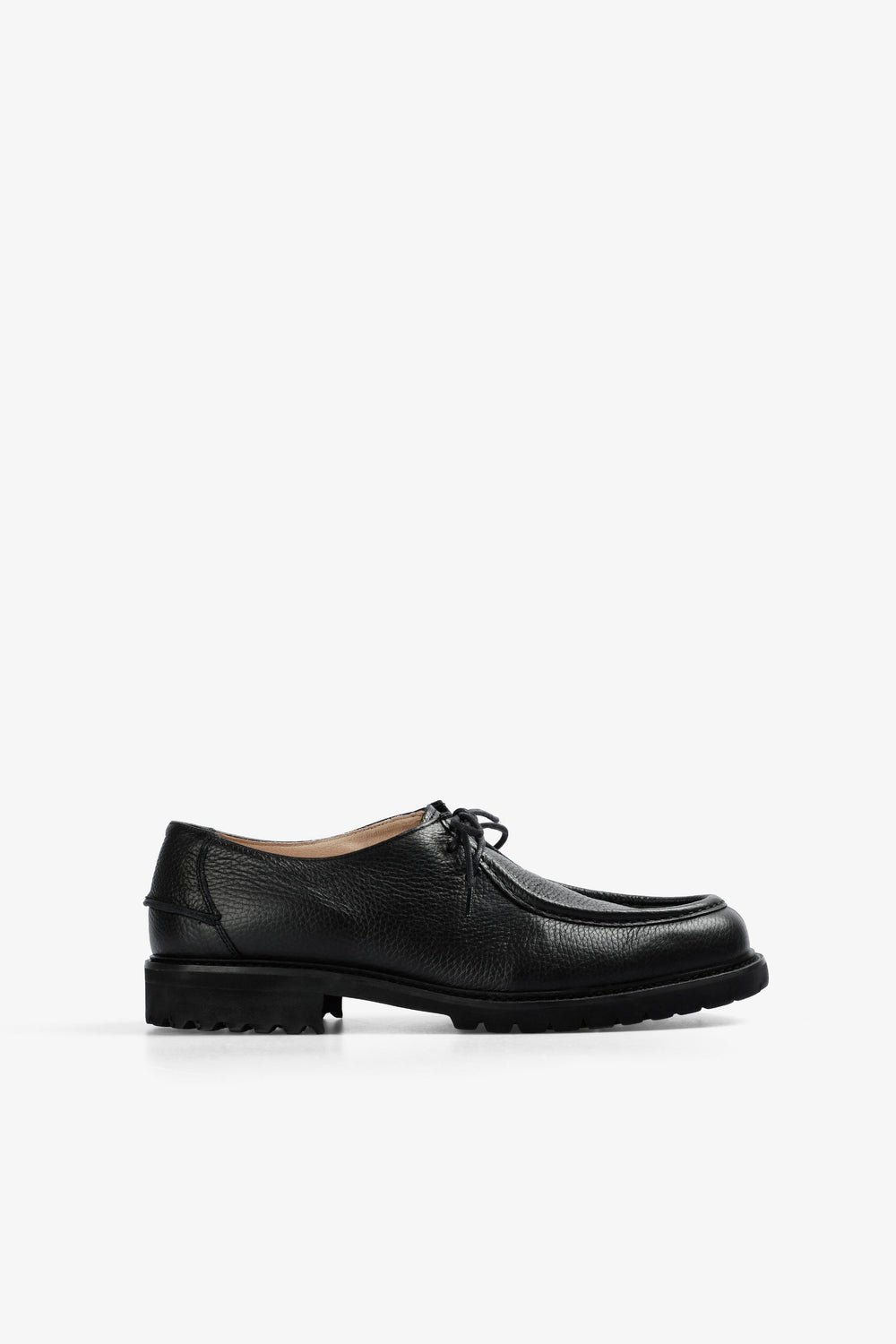Sapatos confecionados em 100% pele. Pormenor de acabamento de pele em toda a parte superior / na língua. Etiqueta tecida na aba do calcanhar e palmilha de caucho antiderrapante. Fecho com cordões.
