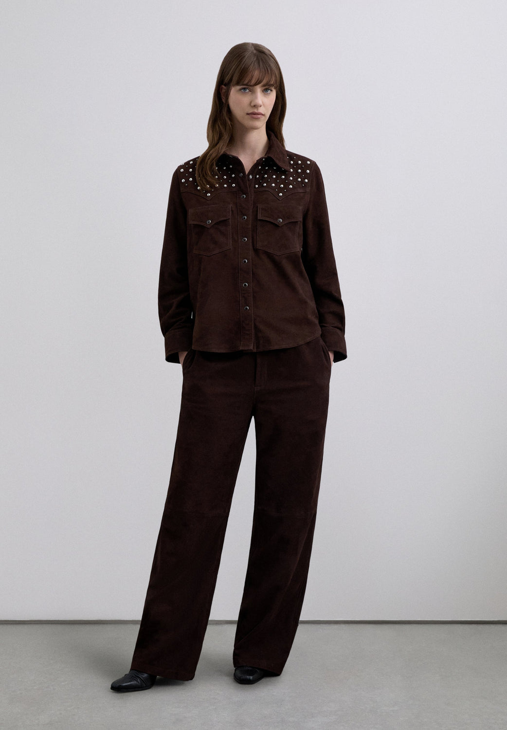 Camisa confecionada em 100% camurça. Manga comprida e fecho de botões à frente e nas mangas. Pormenor de costuras nas costas. Pormenor de tachas à volta da gola.