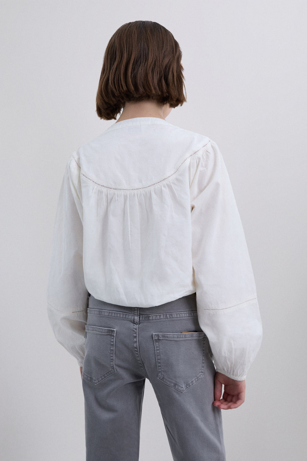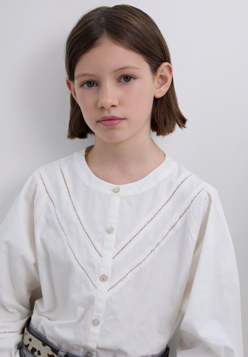 Camisa confecionada em 100% algodão. Camisa com decote redondo e manga comprida acabada em elástico. Fecho de abotoadura à frente. Pormenor do perfurados em bico.