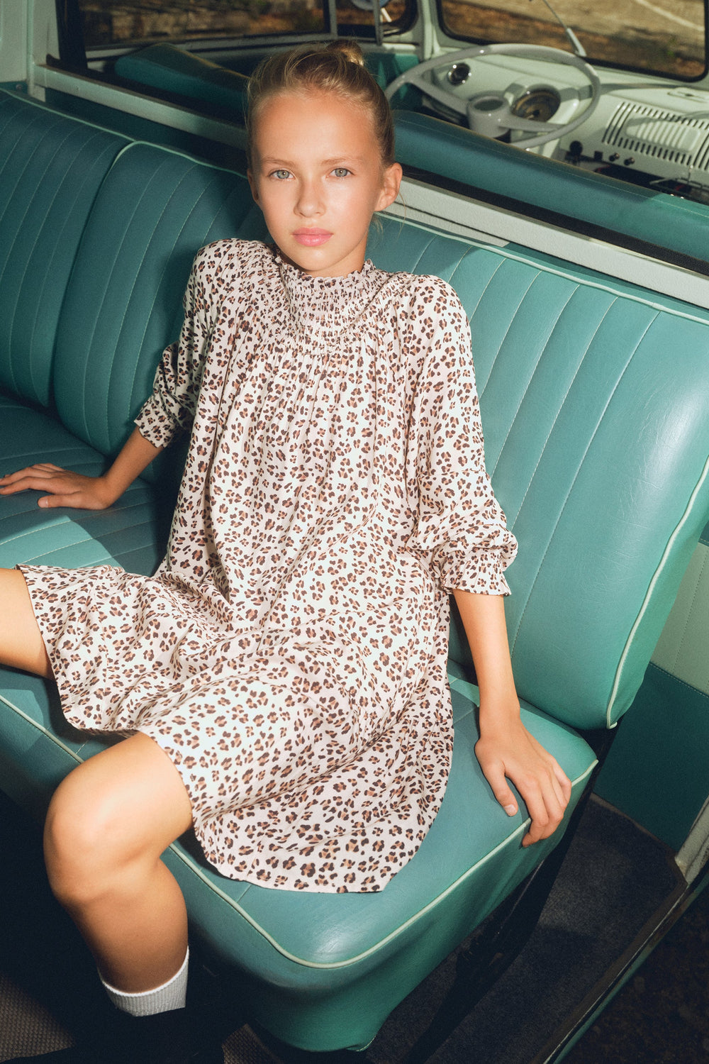 Vestido estampado animal em padrão. Manga comprida ligeiramente abalonada. Gola favos de mel e fecho com botão.