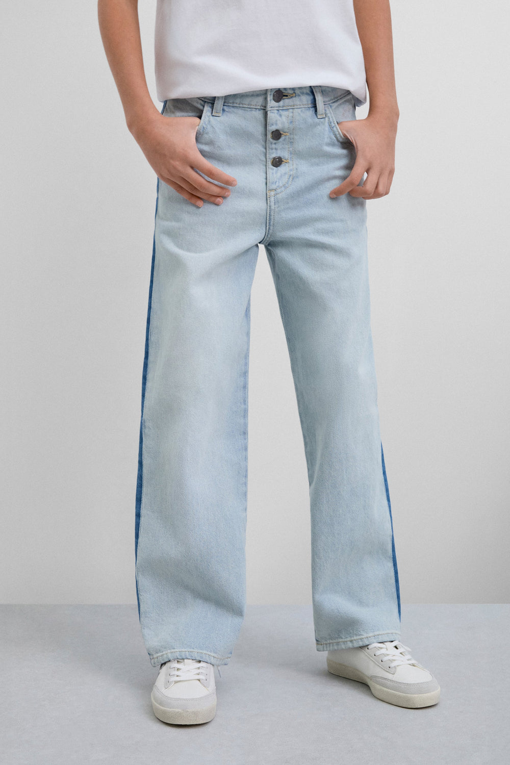 Calças wide leg confeconadas em 100% algodão BCI. Fecho com duplo botão e fecho de correr. Presilhas na cintura. Pormenor de costura em contraste na lateral. Forro interior 100% algodão.