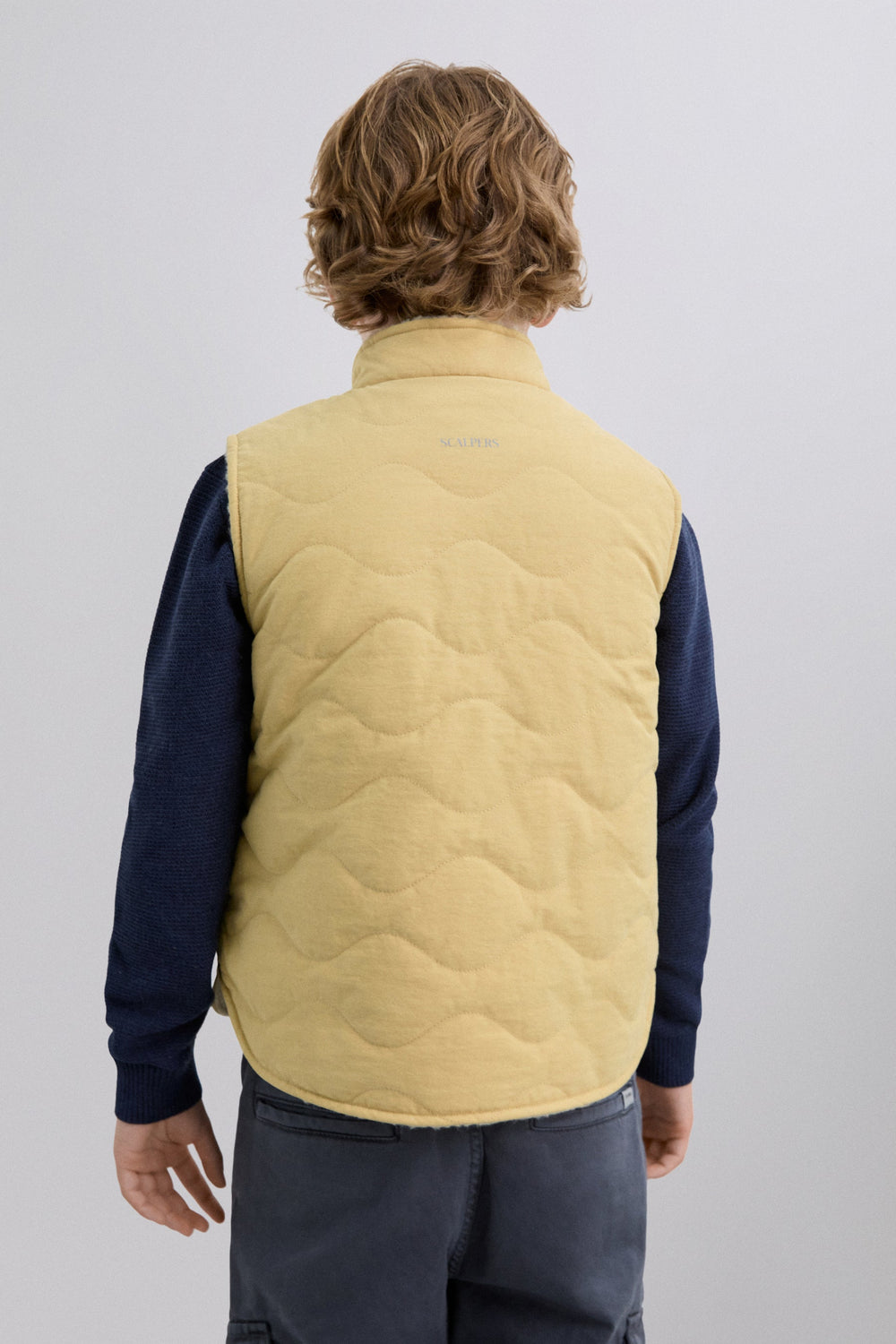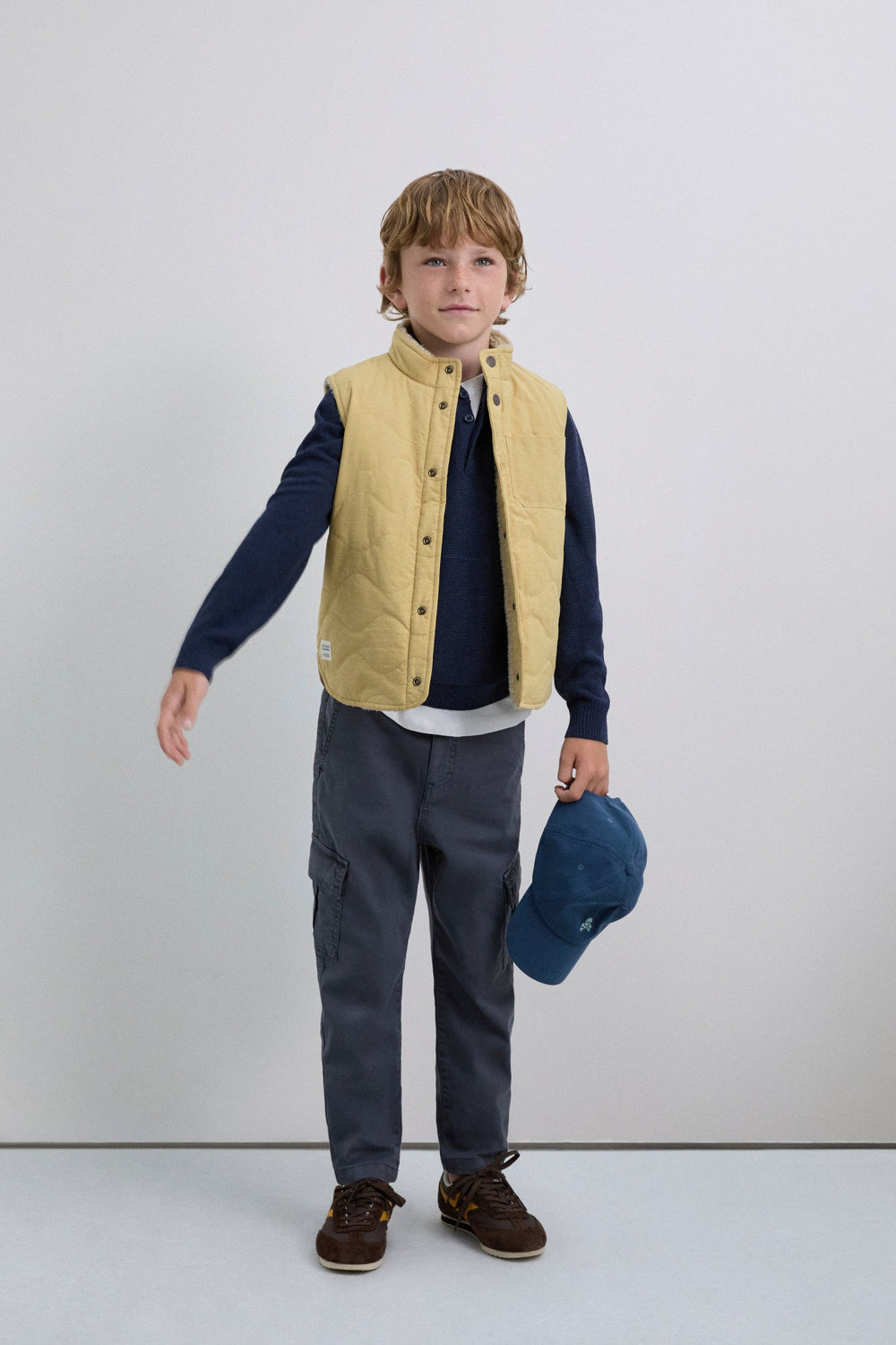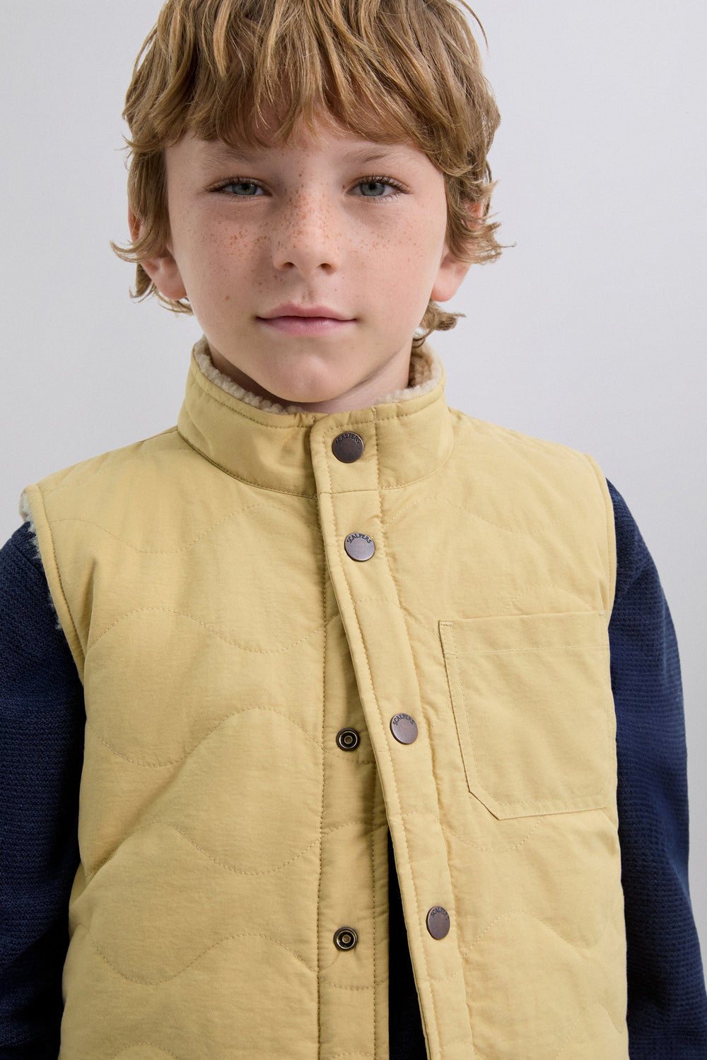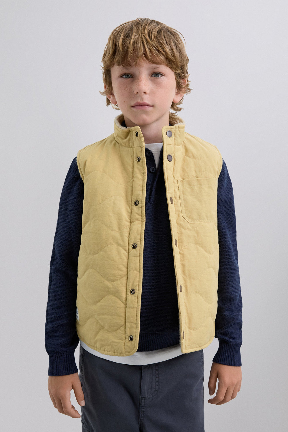 Colete acolchoado confecionado em mistura de algodão e nylon com bolso exterior. Forro de borrego confecionado em material recycled. Gola subida. Corte Regular Fit. Fecho de botões.