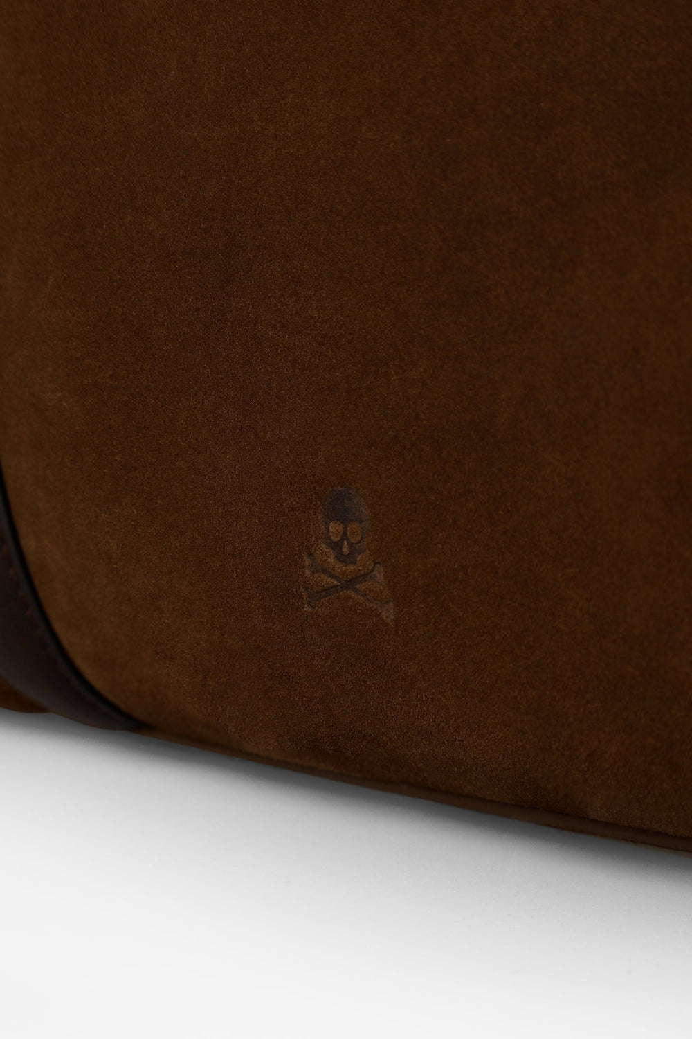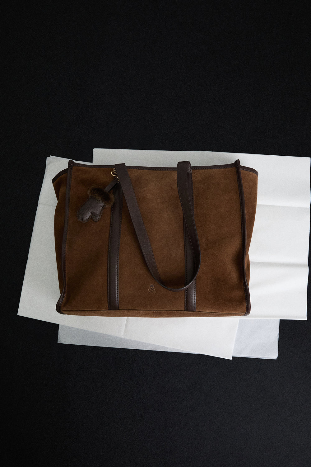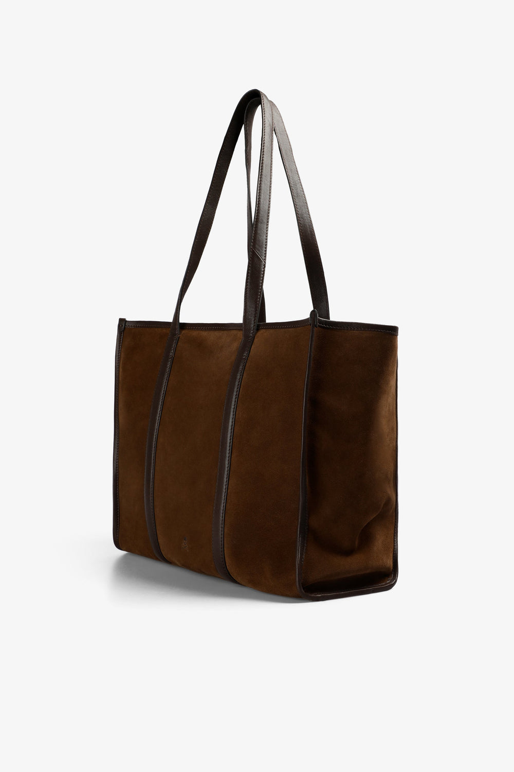Bolsa shopper confecionada em 100% camurça. Pormenores em pele em contraste. Fecho de correr.