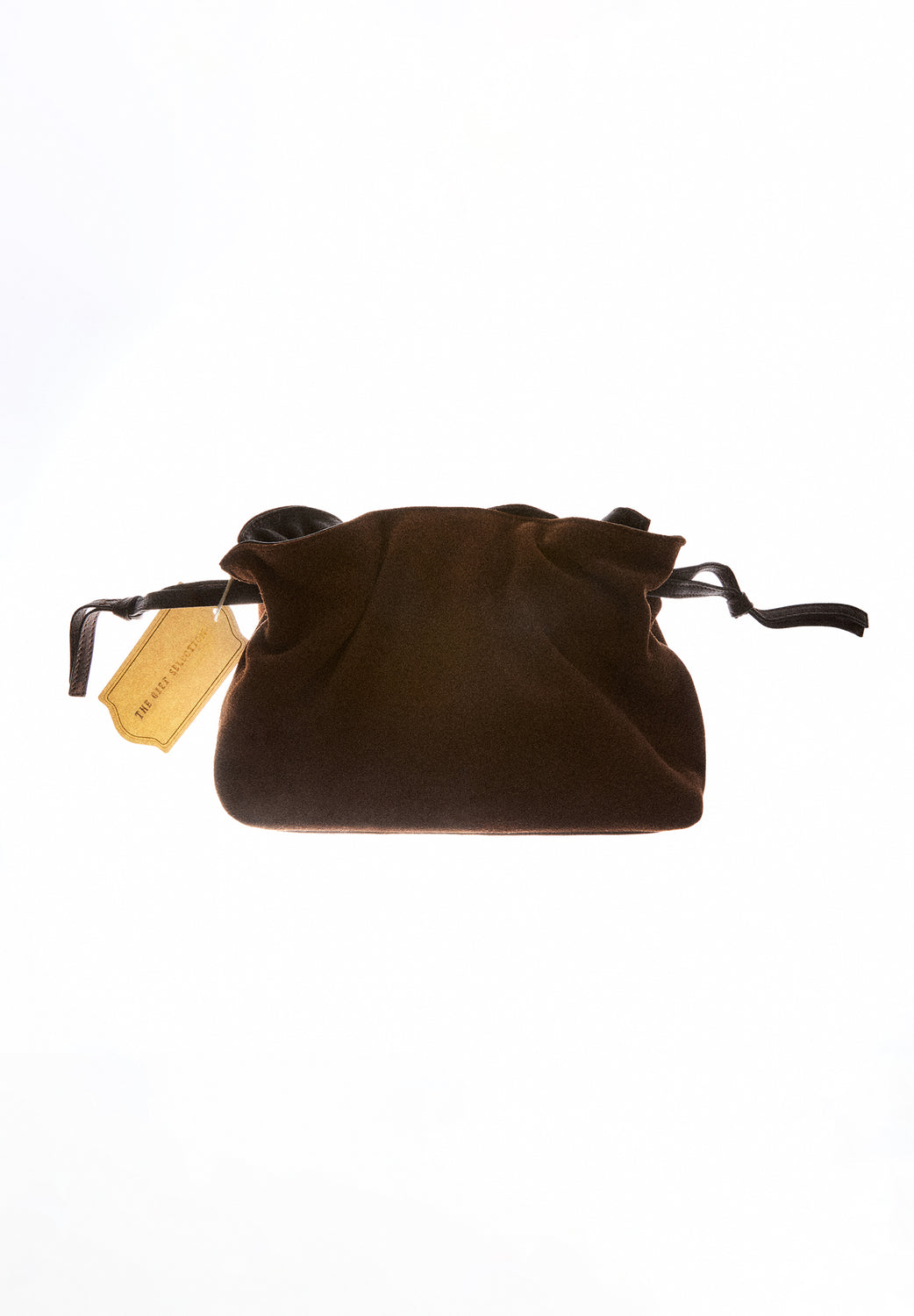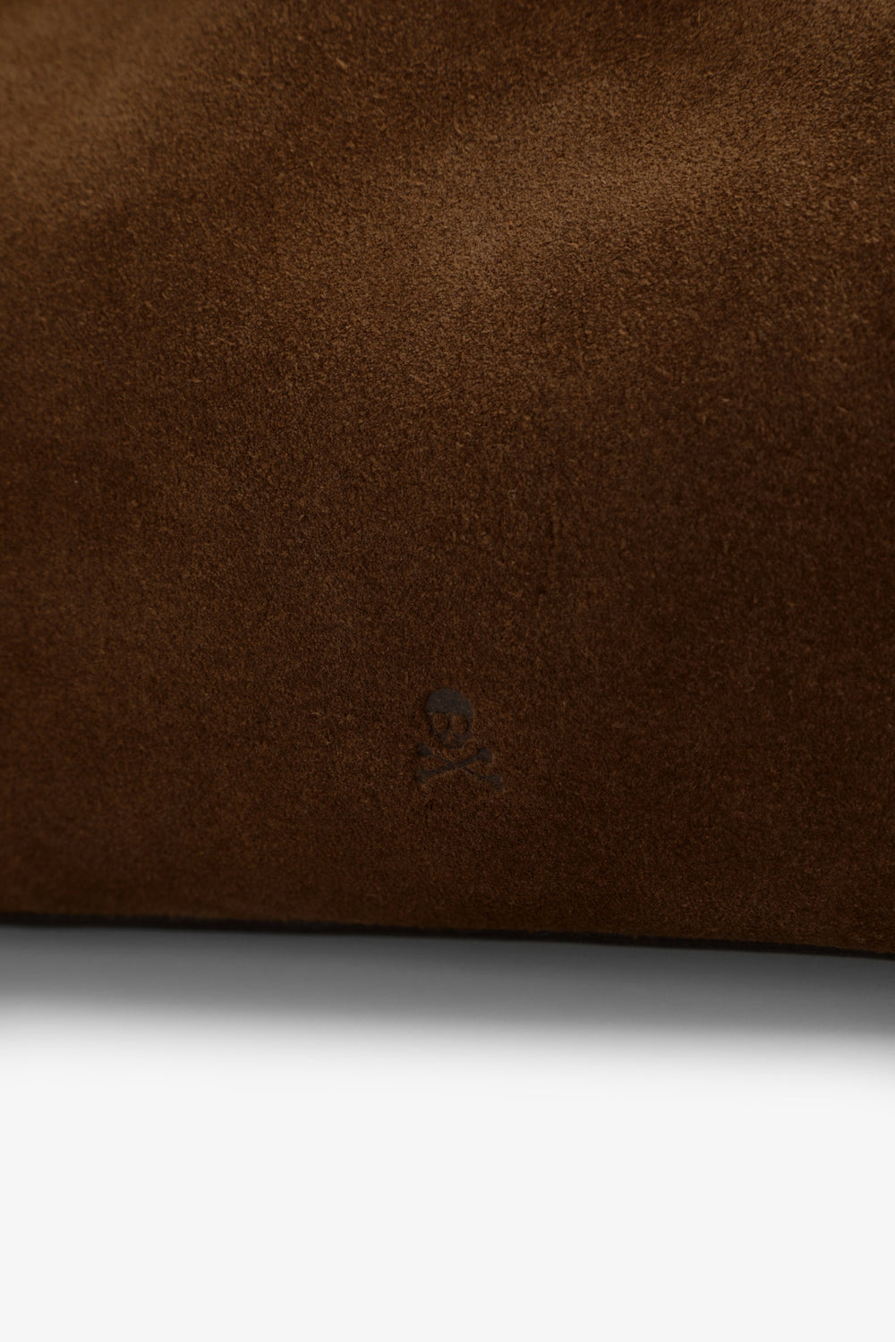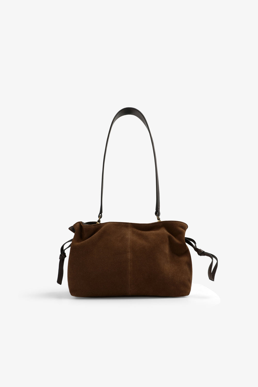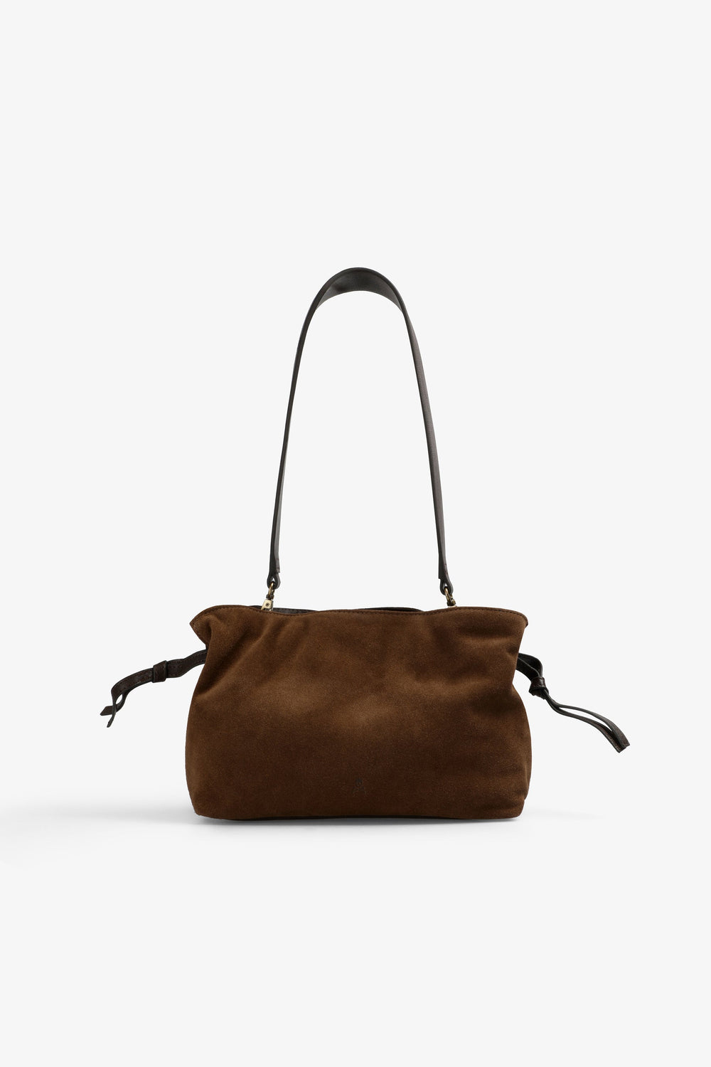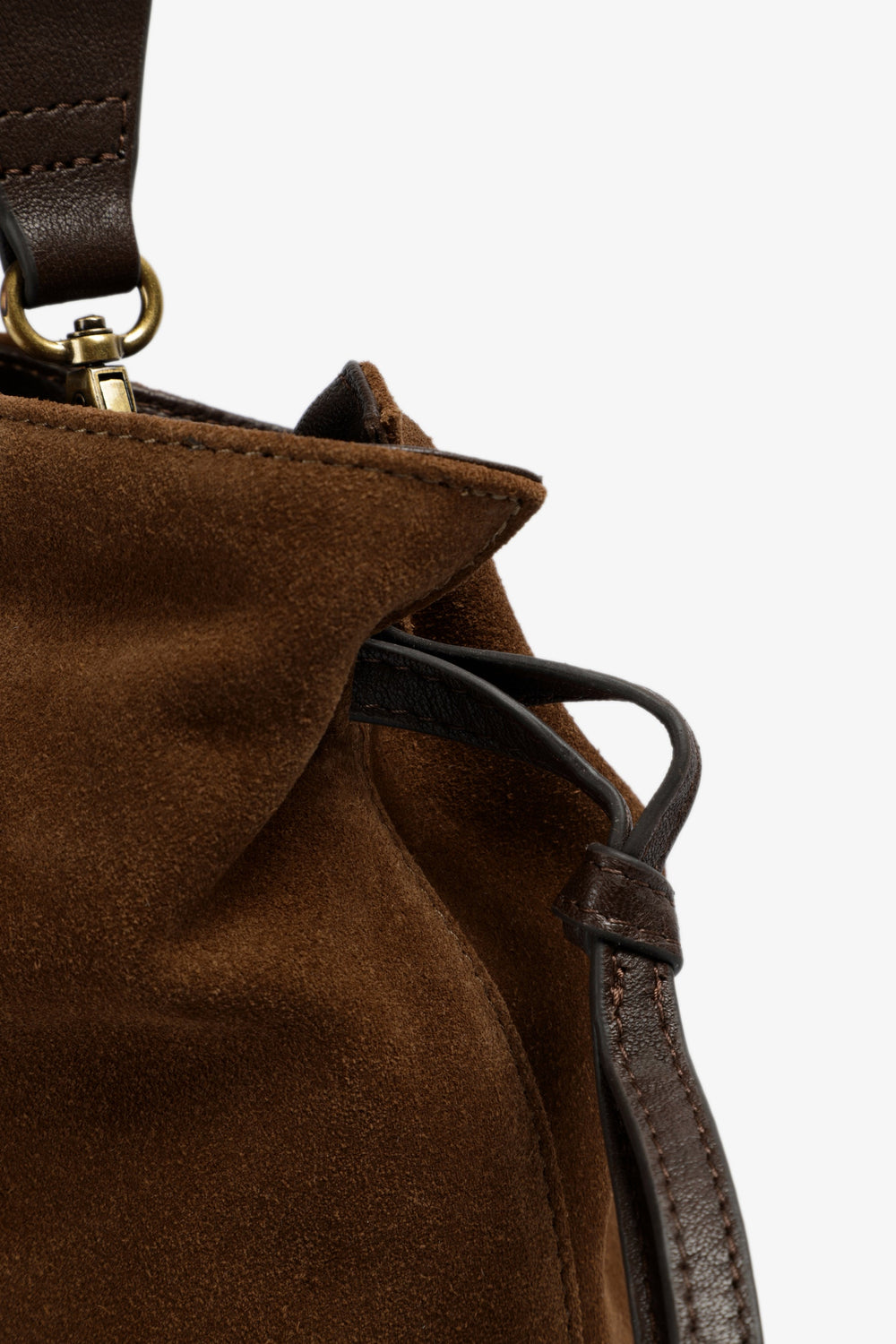Mala confecionada em 100% camurça. Alças de napa em contraste. Forro interior. Fecho magnético. Bolso interior. Acabamentos metálicos dourados personalizados.