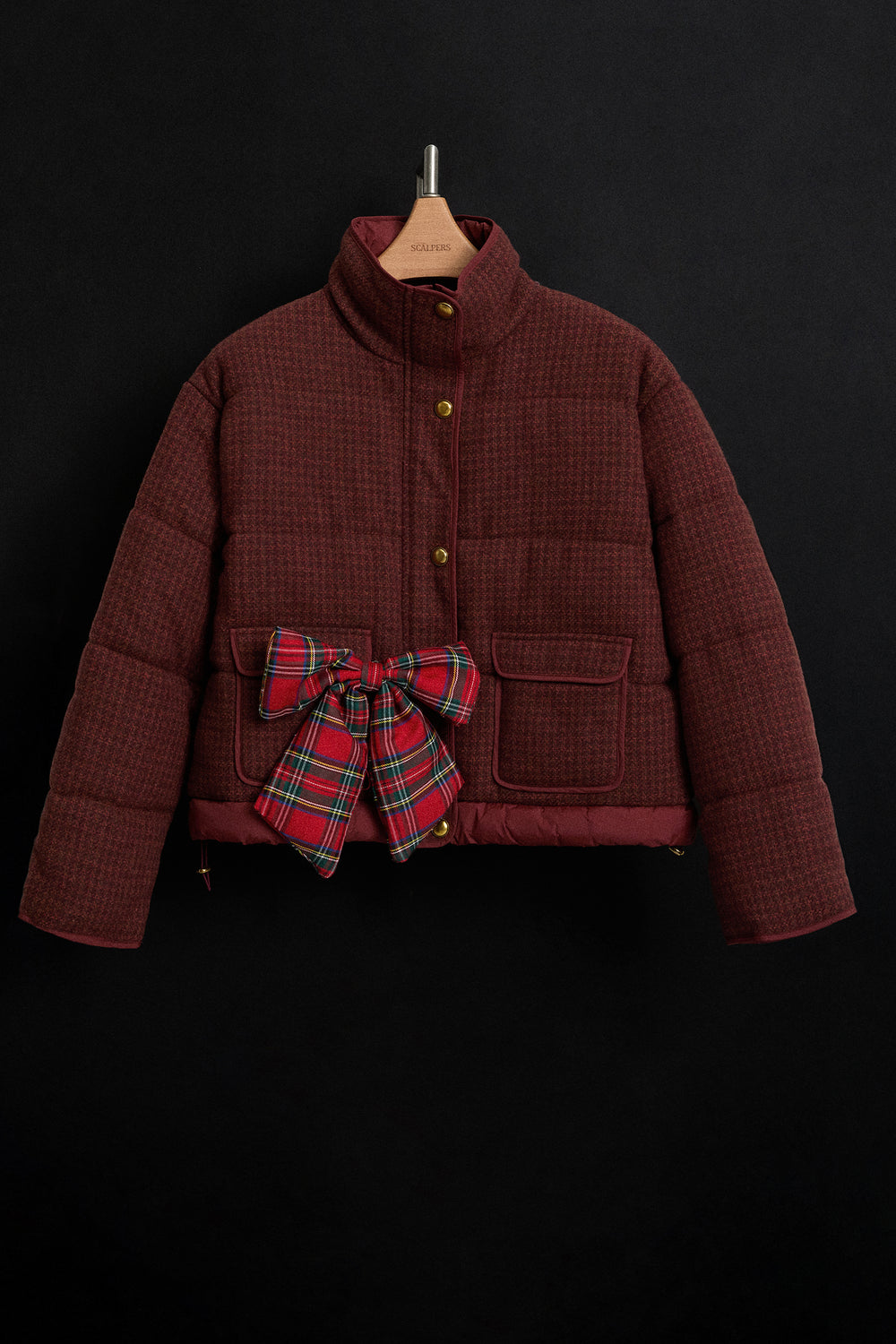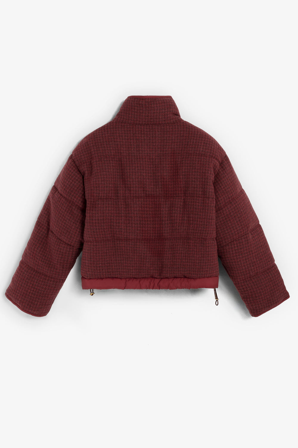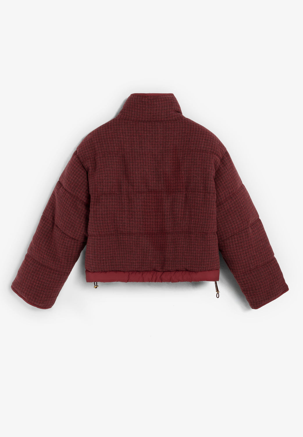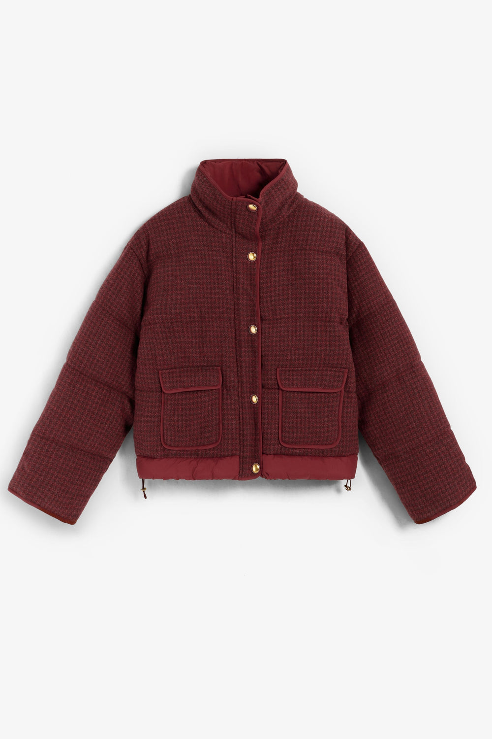 Casaco acolchoado confecionado em mistura de lã com estampado xadrez. Corte regular fit. Ligeiramente cropped. Gola subida. Manga comprida. Linhas vivas em contraste. Fecho de correr central e aba com botões metálicos de pressão. Puxadores ajustáveis na bainha.