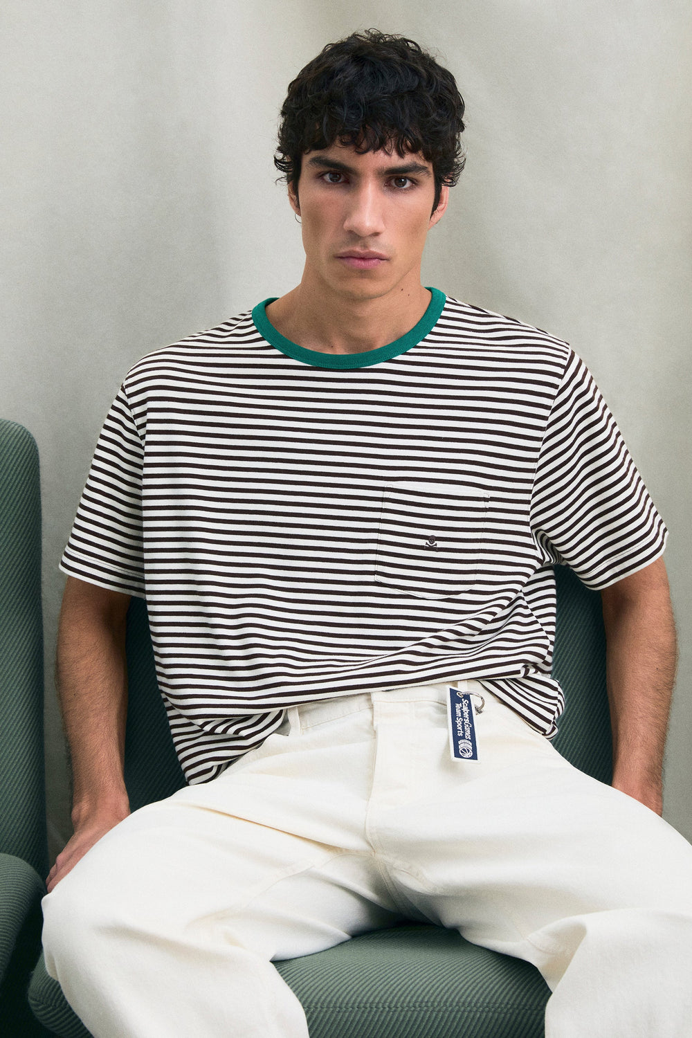 T-shirt confecionada em 100% algodão BCI. Padrão às riscas. Manga curta. Decote redondo em contraste. Pormenor de bolso no peito. Logótipo bordado.