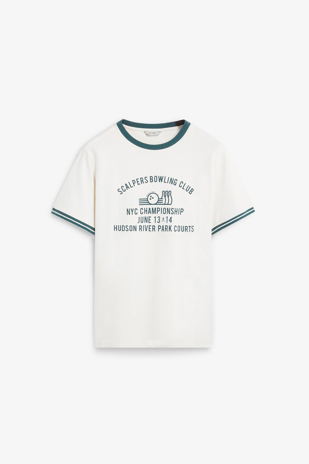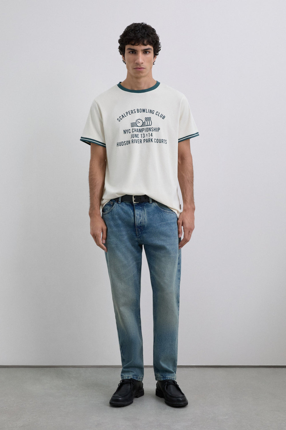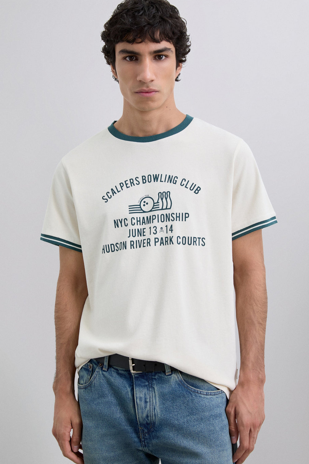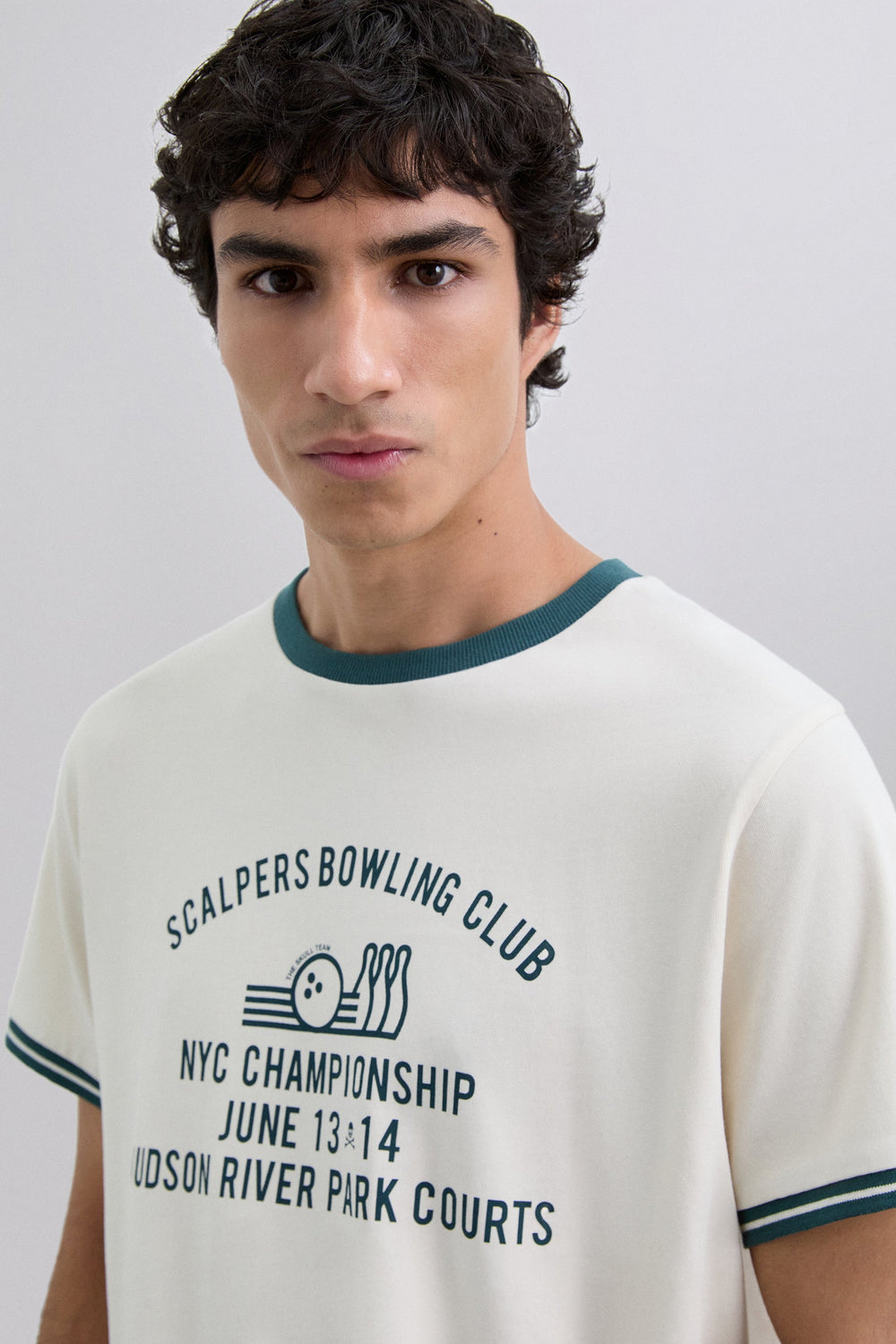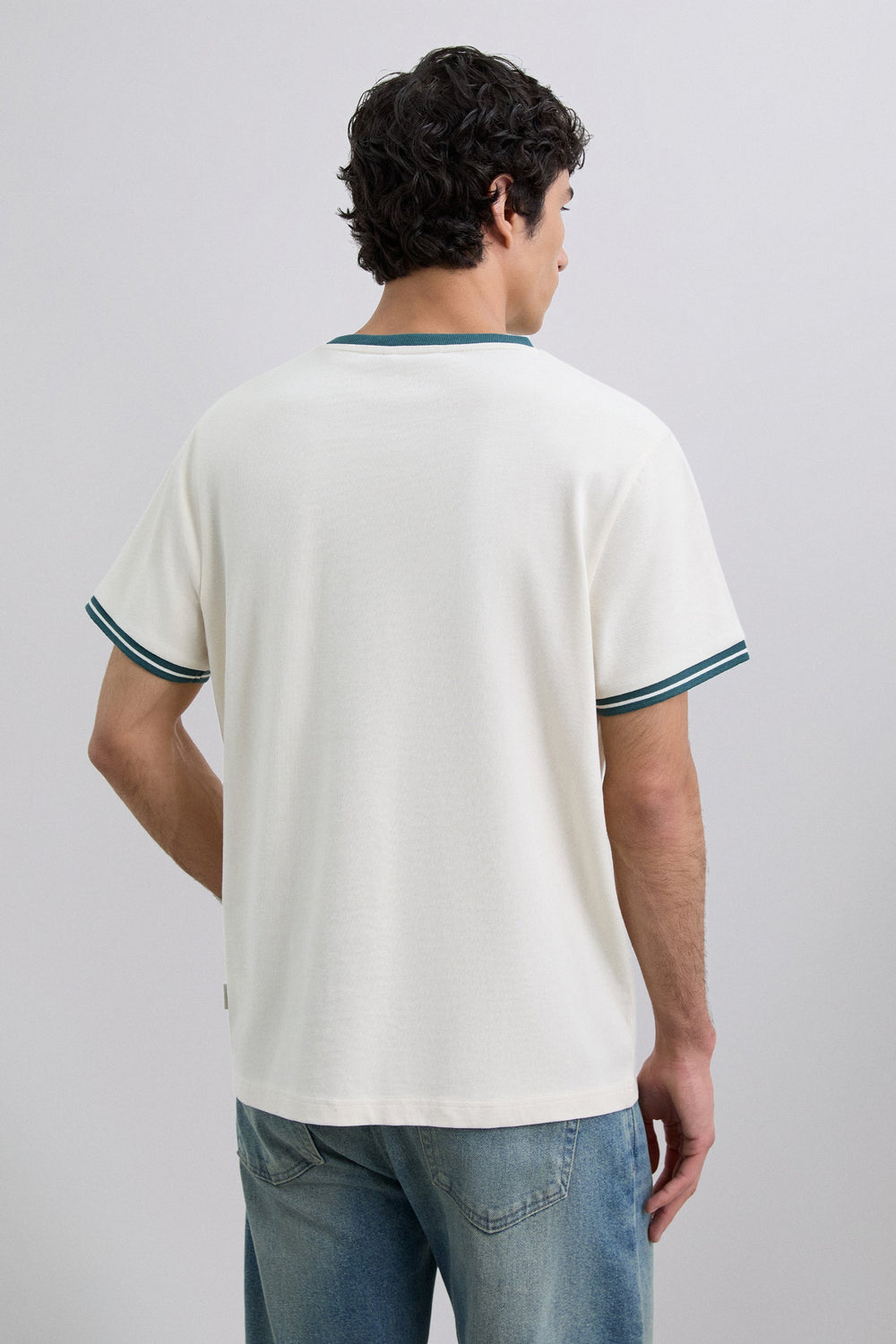 T-shirt confecionada em 100% algodão BCI. Manga curta. Padrão à frente. Corte Regular Fit. Gola e mangas com acabamento em nervuras em contraste.
