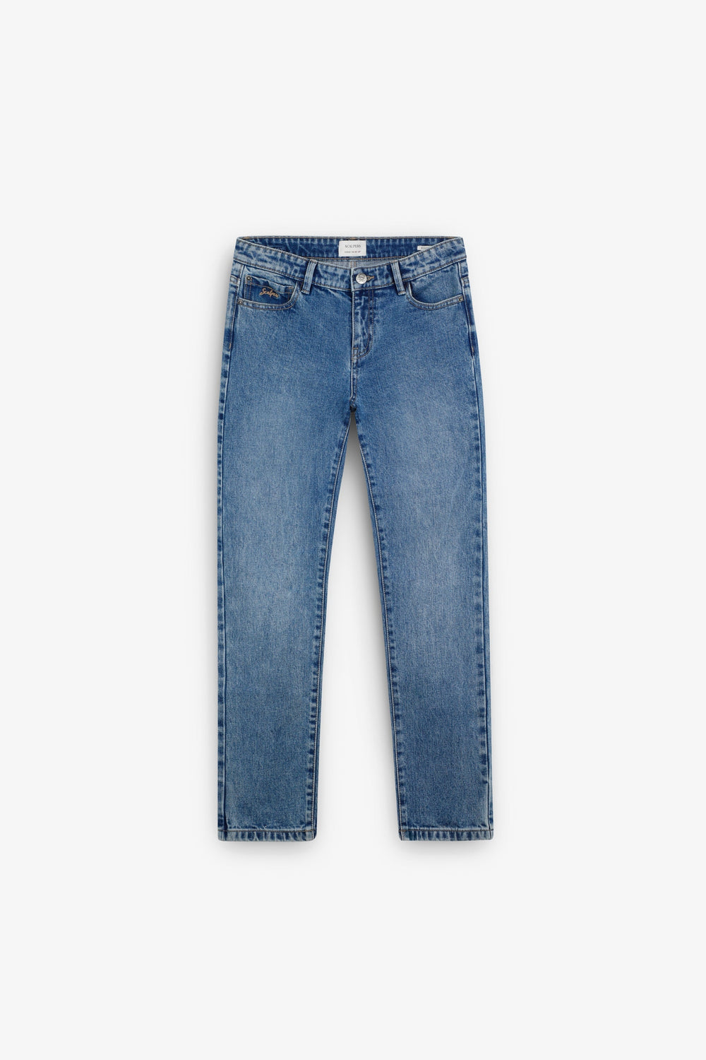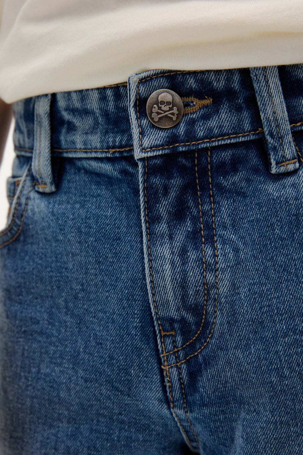 Calças jeans confecionadas em mistura de algodão. Regular fit. Bolsos à frente e atrás. Fecho com botão e zip. Presilhas na cintura. Pormenor de skull no botão e na etiqueta com logótipo no bolso traseiro.