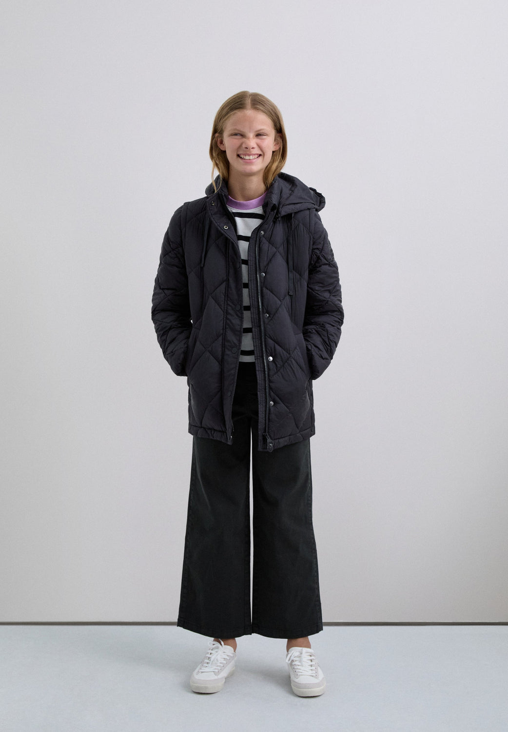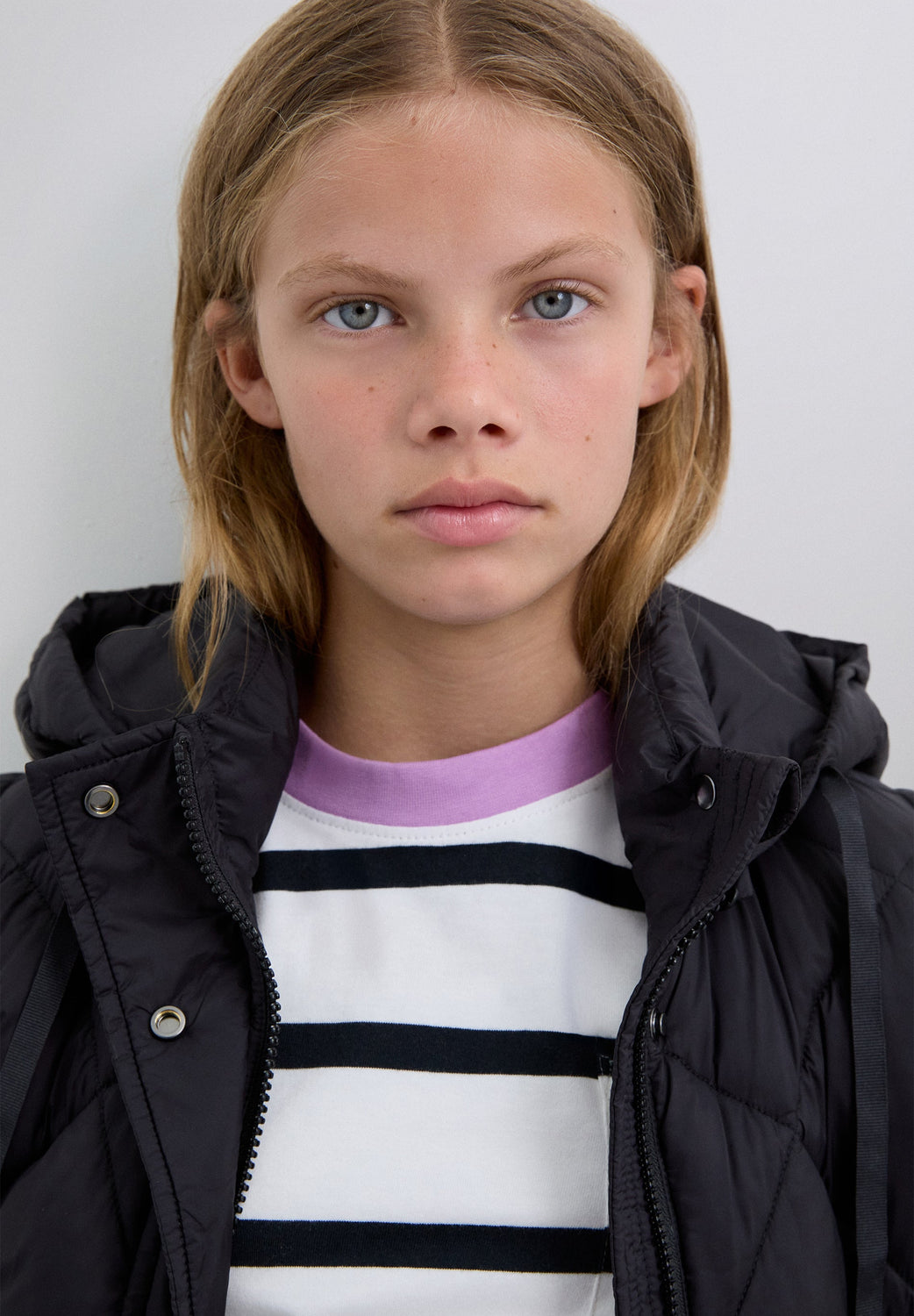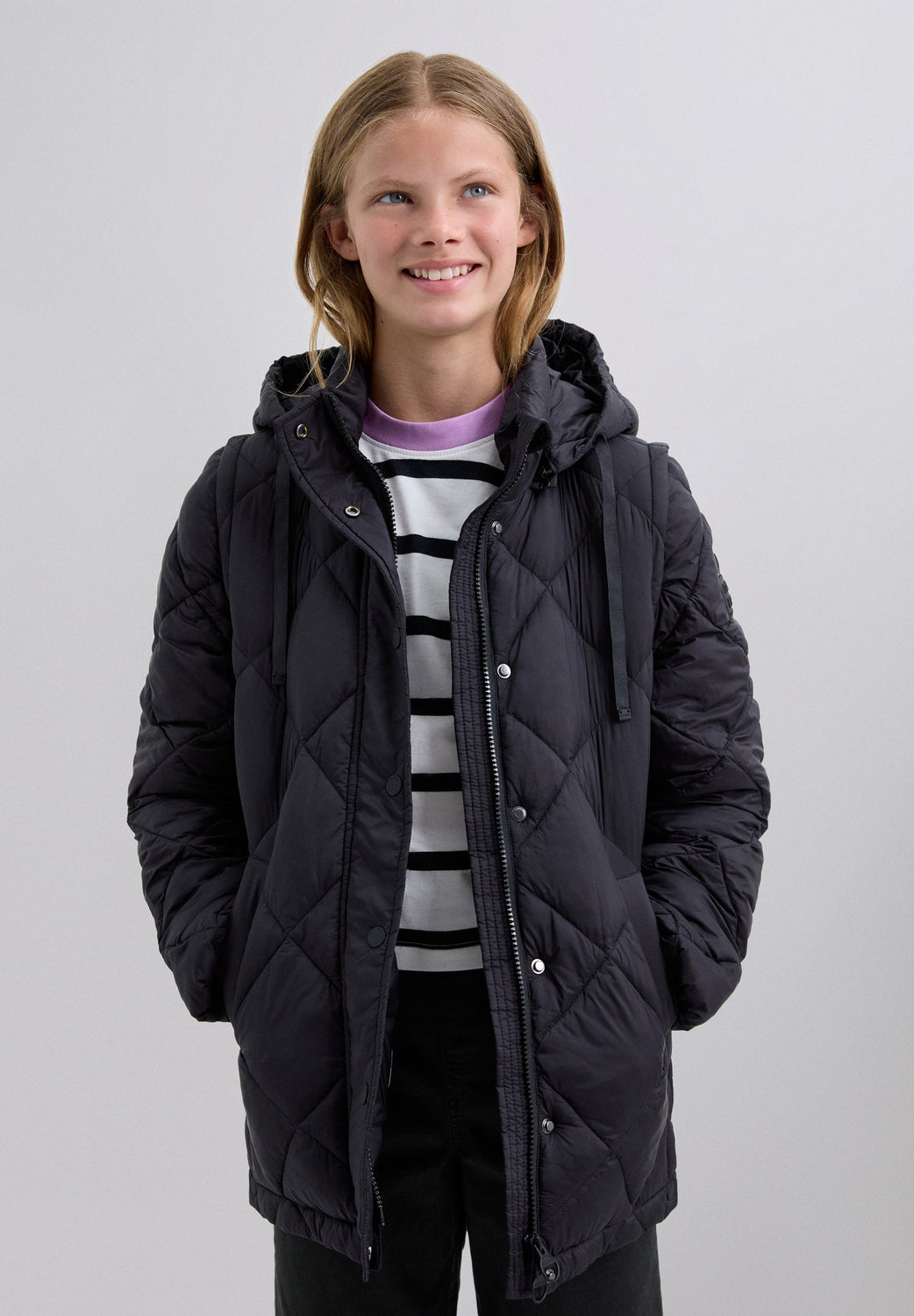 Casaco acolchoado. Capuz e Mangas amovíveis. Fecho de correr à frente oculto por uma aba com fecho de botões de pressão. Bolsos laterais. Forro recycled. Pormenor de logótipo nas costas.