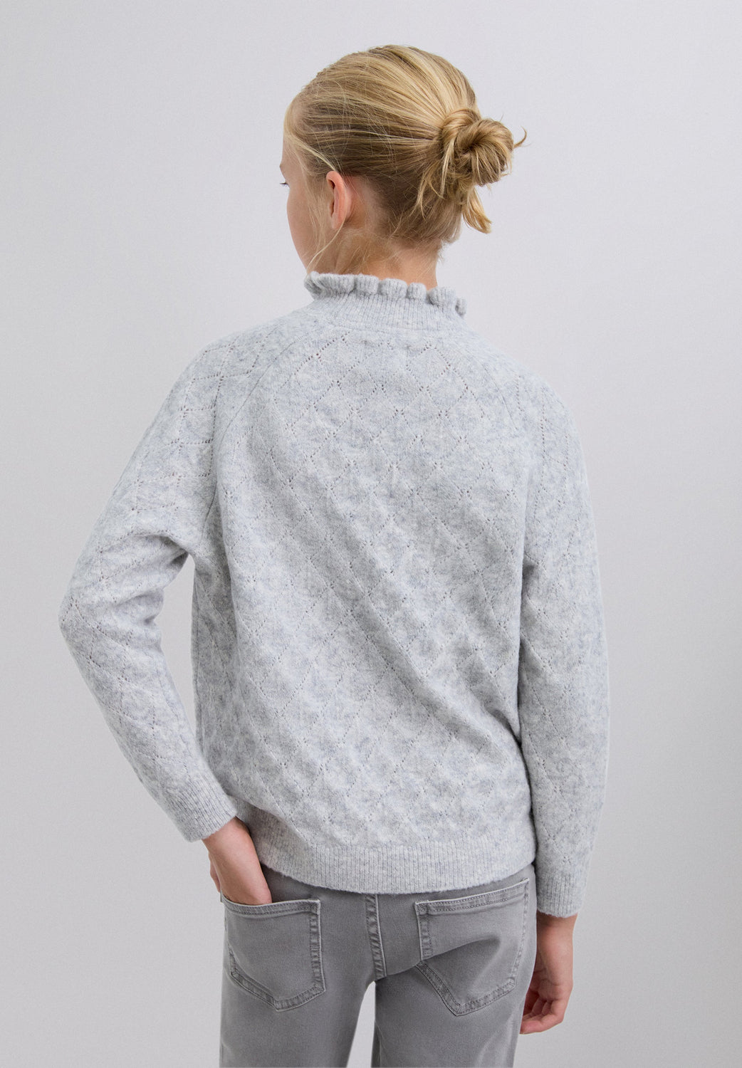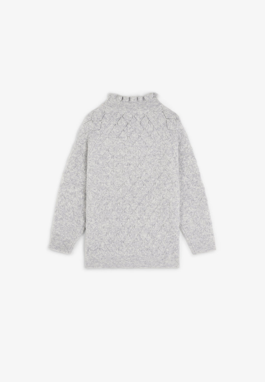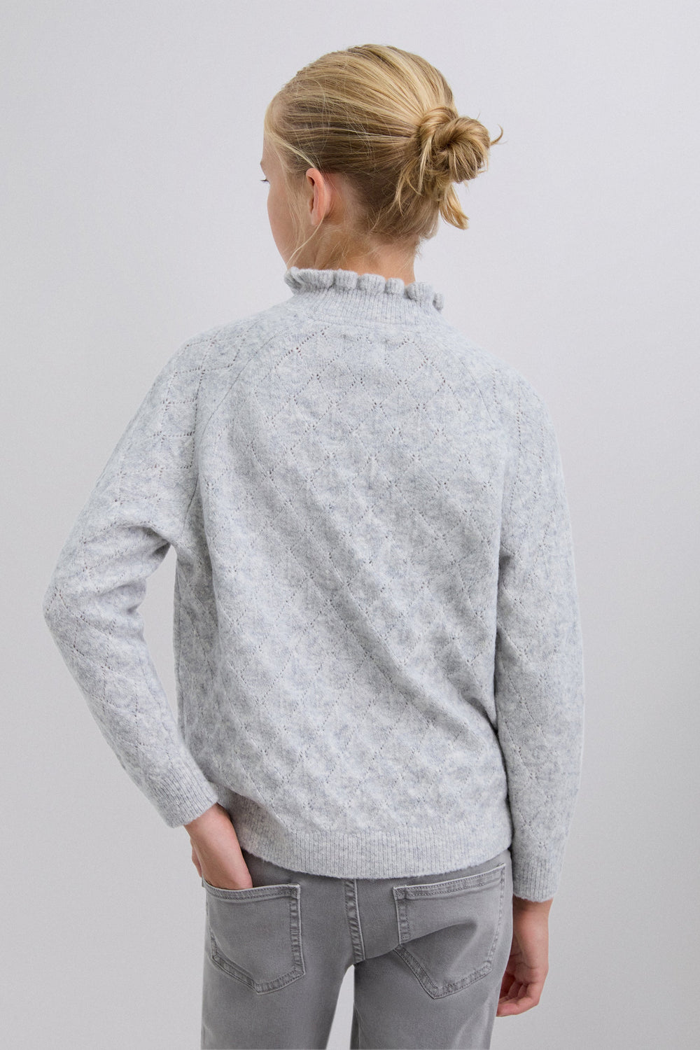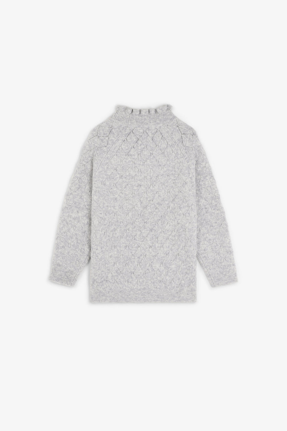 Sweater de malha confecionada em mistura de lã merino. Gola alta com folhos. Manga comprida com acabamentos canelados. Motivo perfurado textura diamante.