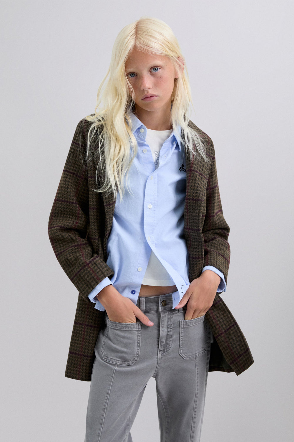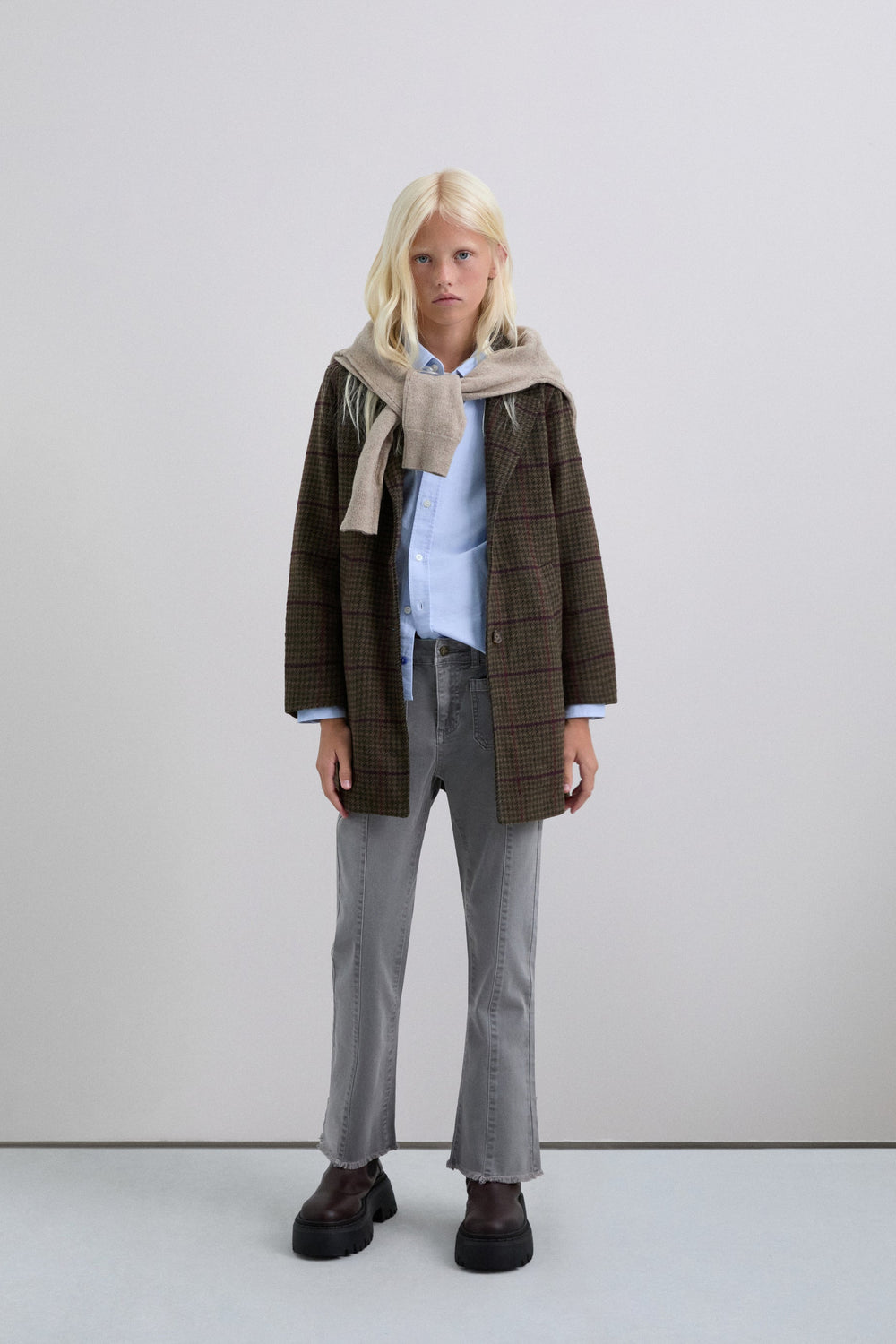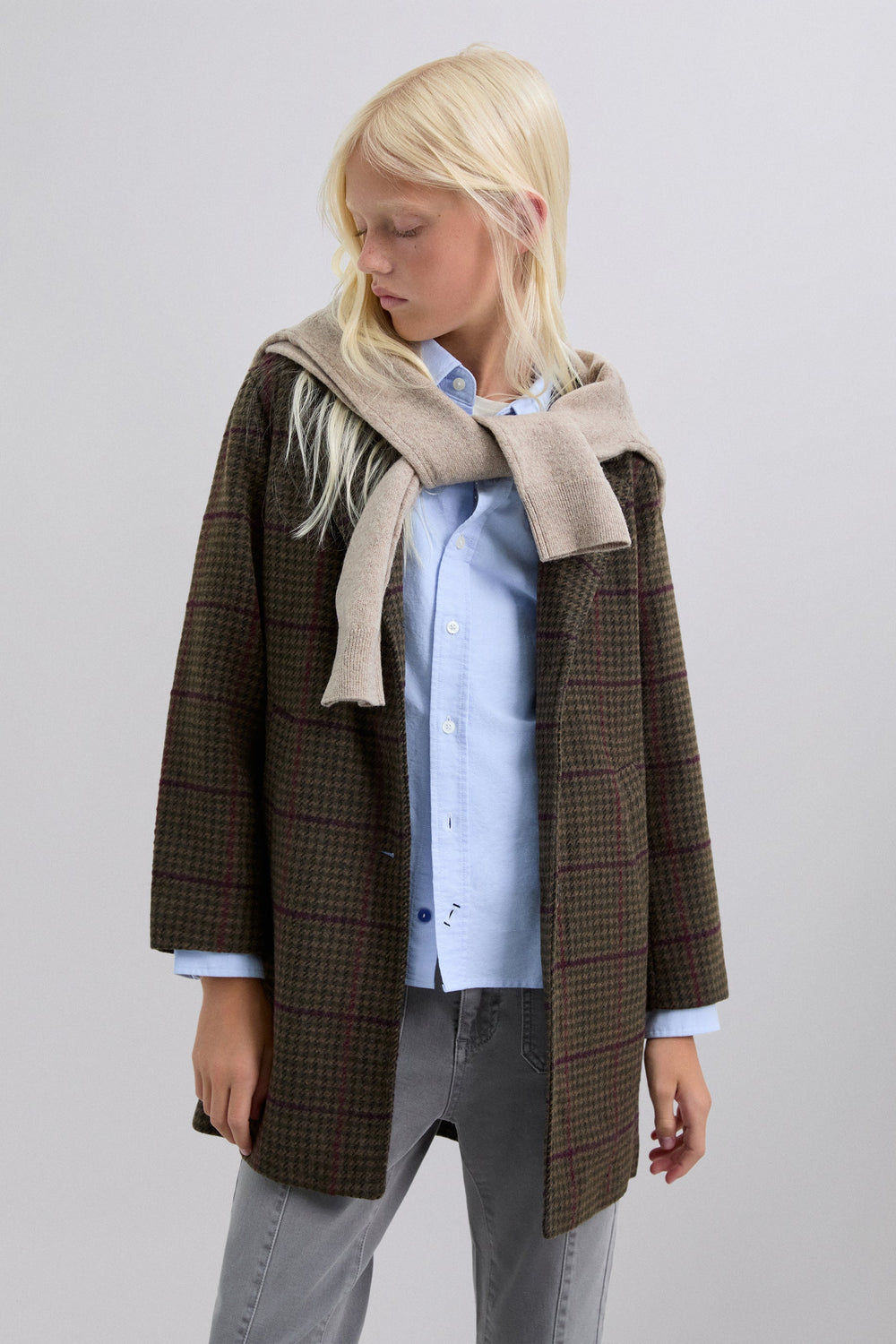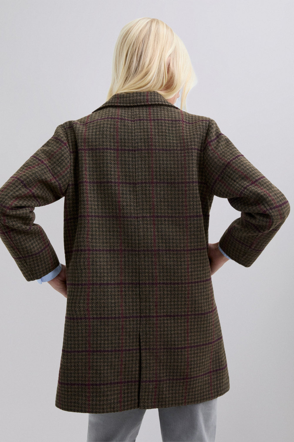 Casaco de pano xadrez. Gola com lapelas. Fecho com botões. Manga comprida. Bolsos escondidos com aba.