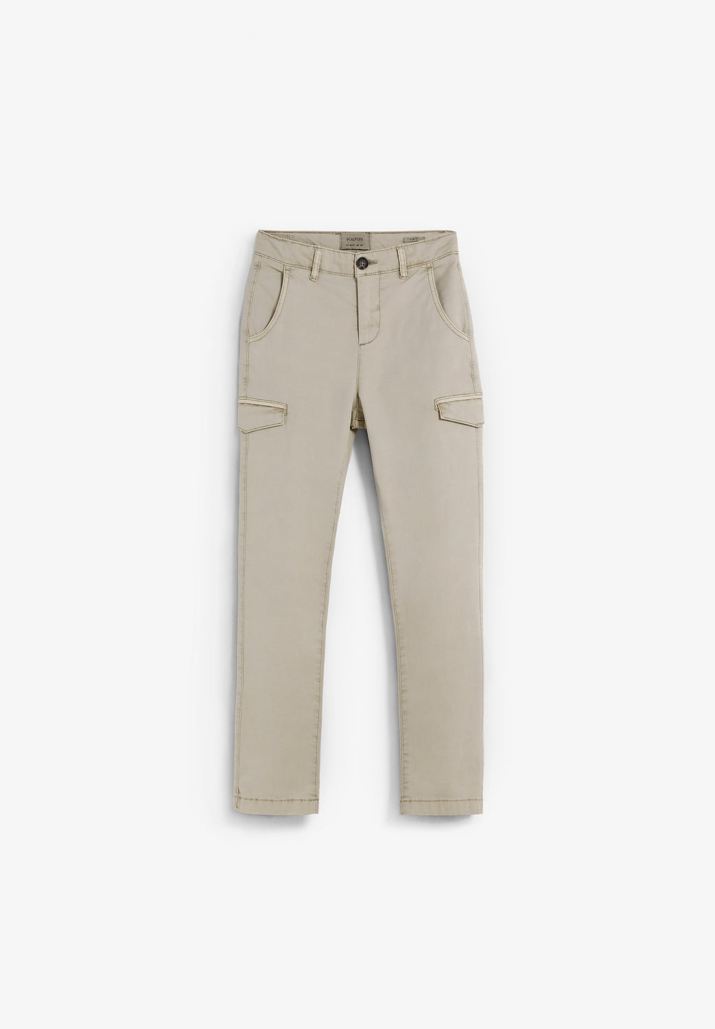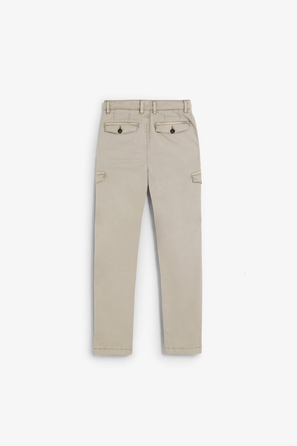 Calças cargo confecionadas em algodão BCI ligeiramente elástico. Regular fit. Fecho com botão e fecho de correr. Bolsos à frente e atrás. Presilhas na cintura e bolsos nas pernas com placket.