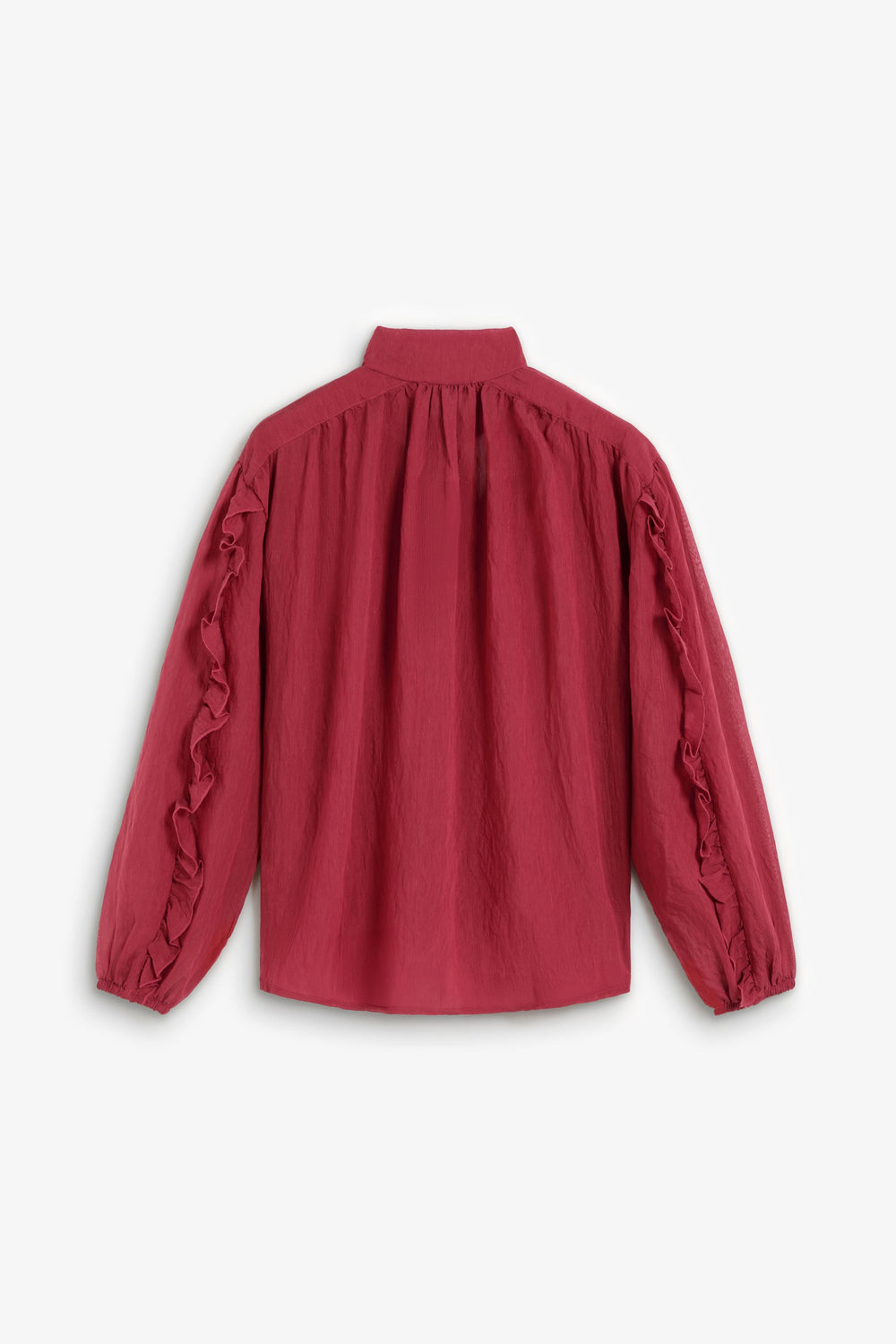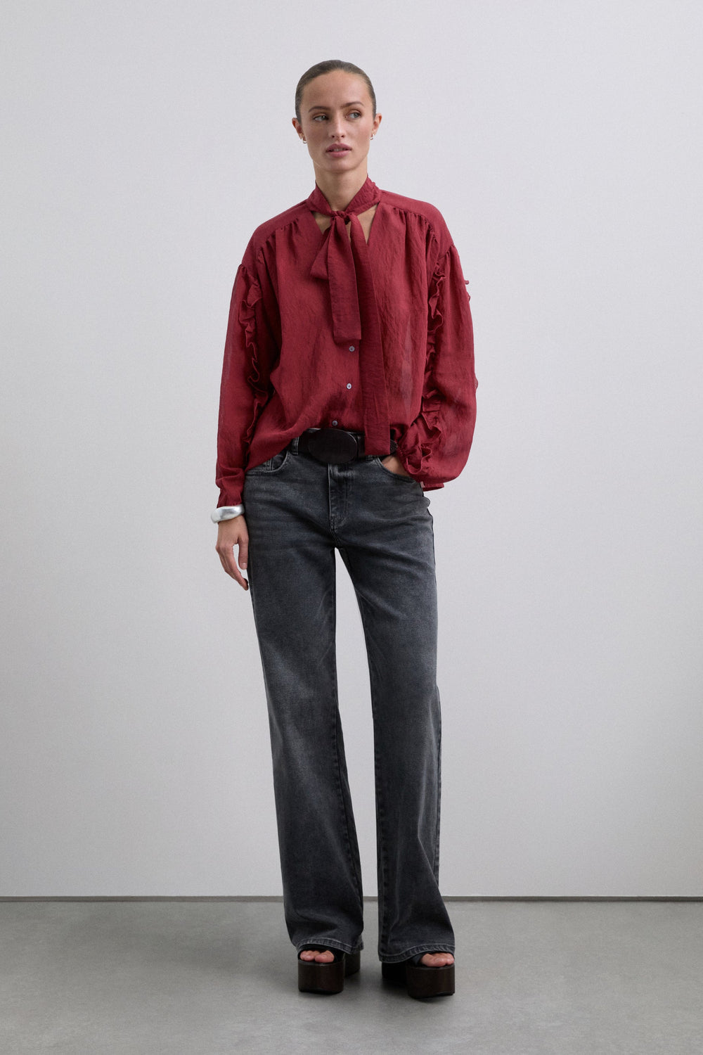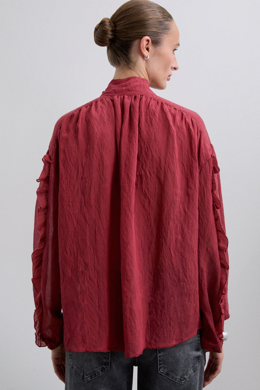 Blusa confecionada em tecido fluido com linho e rayón. Regular fit. Decote com pormenor de laço. Fecho com botões à frente. Manga comprida ligeiramente abalonada terminada em punhos. Pormenores de franzidos nas mangas.