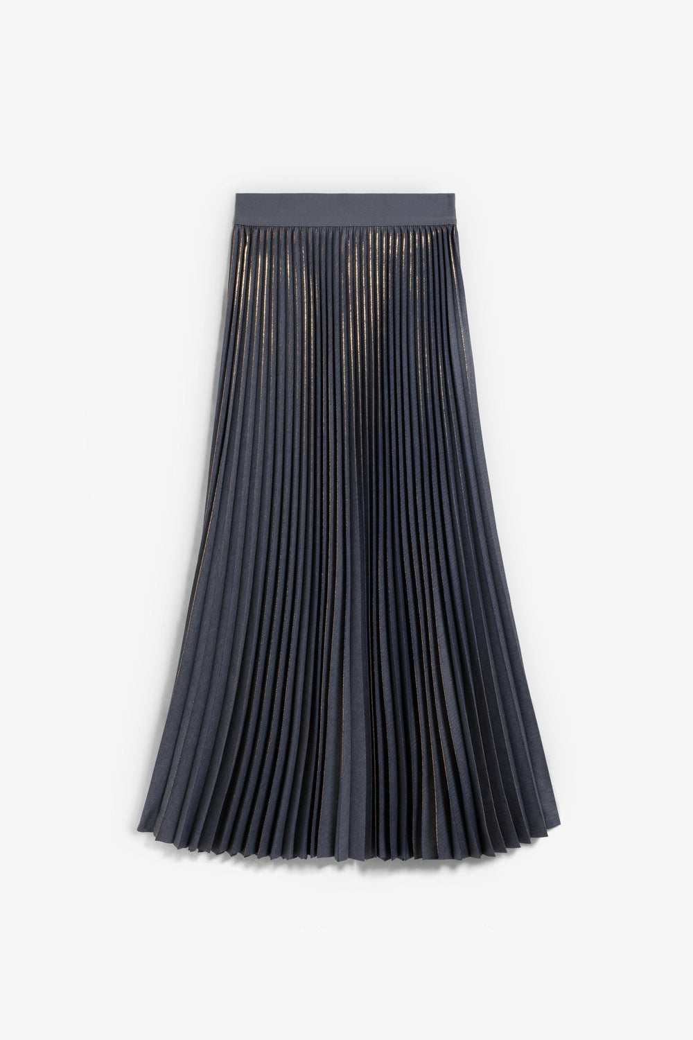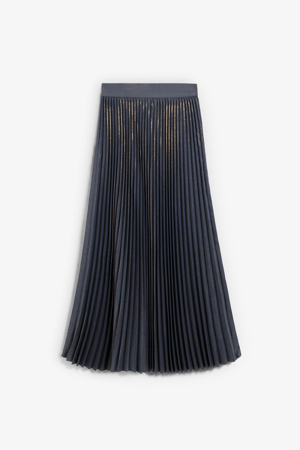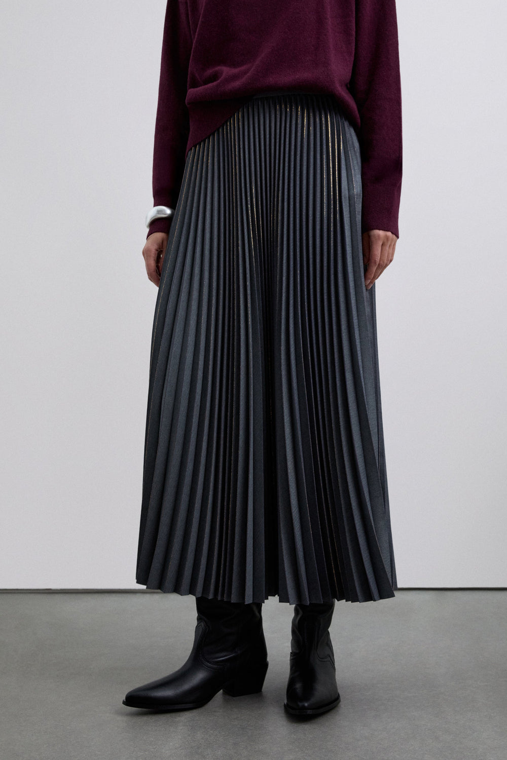 Saia midi plissada confecionada em tecido fluido com pormenores de fio metalizado em pregas. Regular fit. Cós elástico. Ligeiramente A Line.