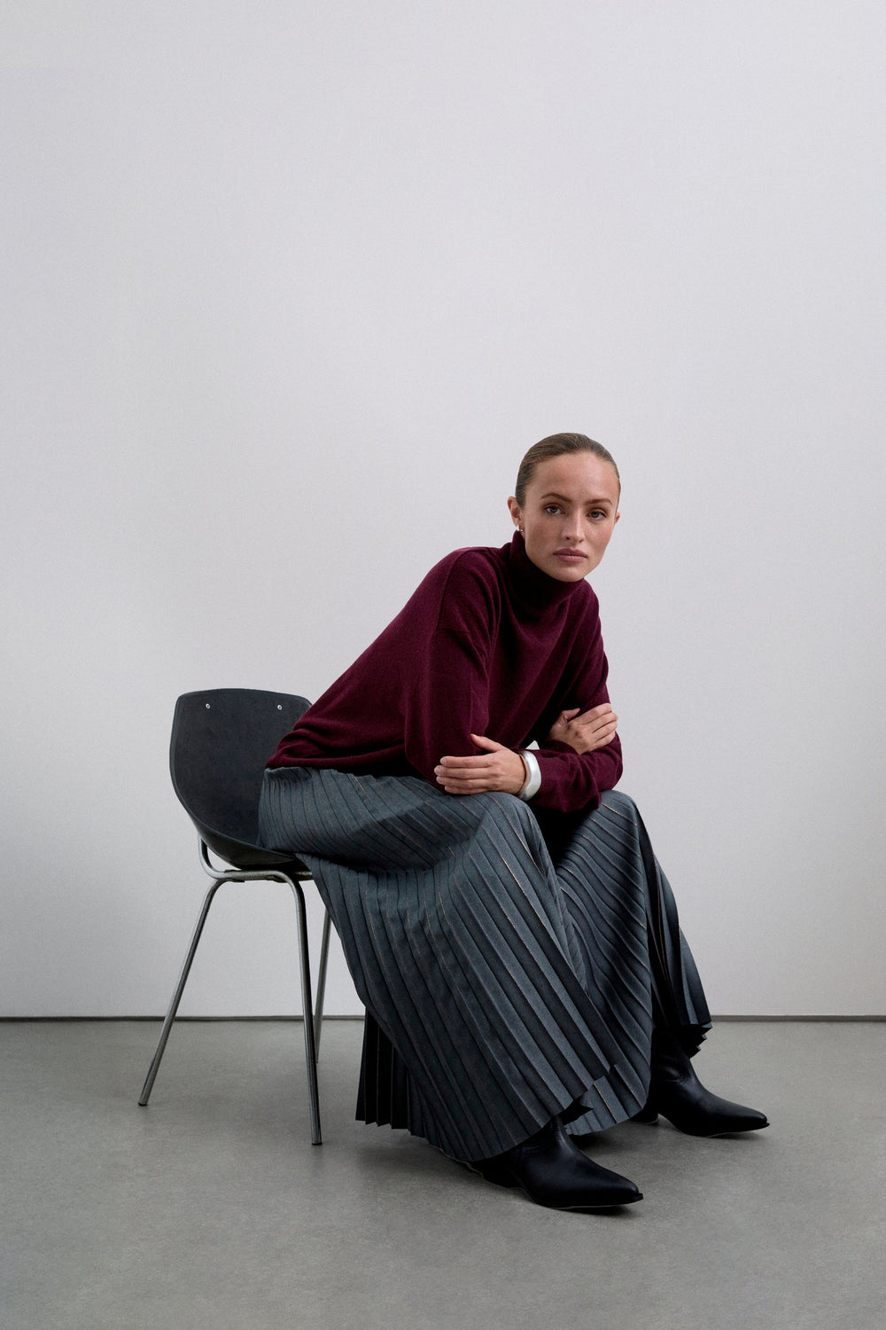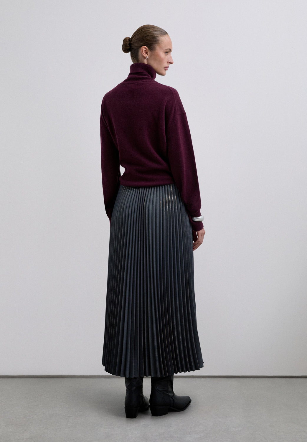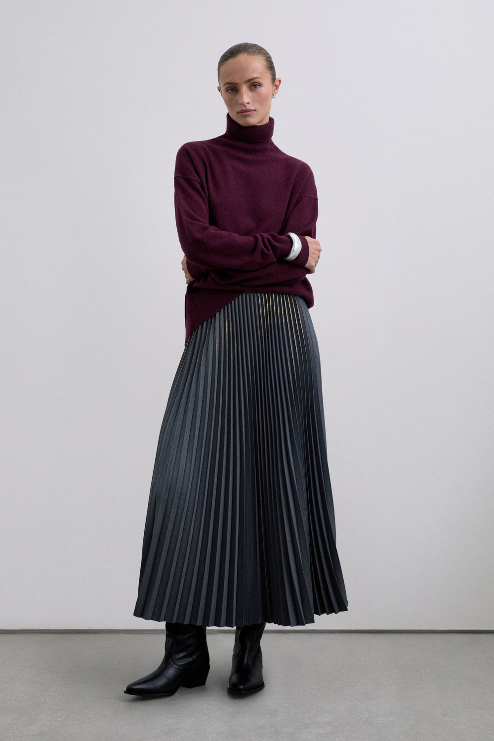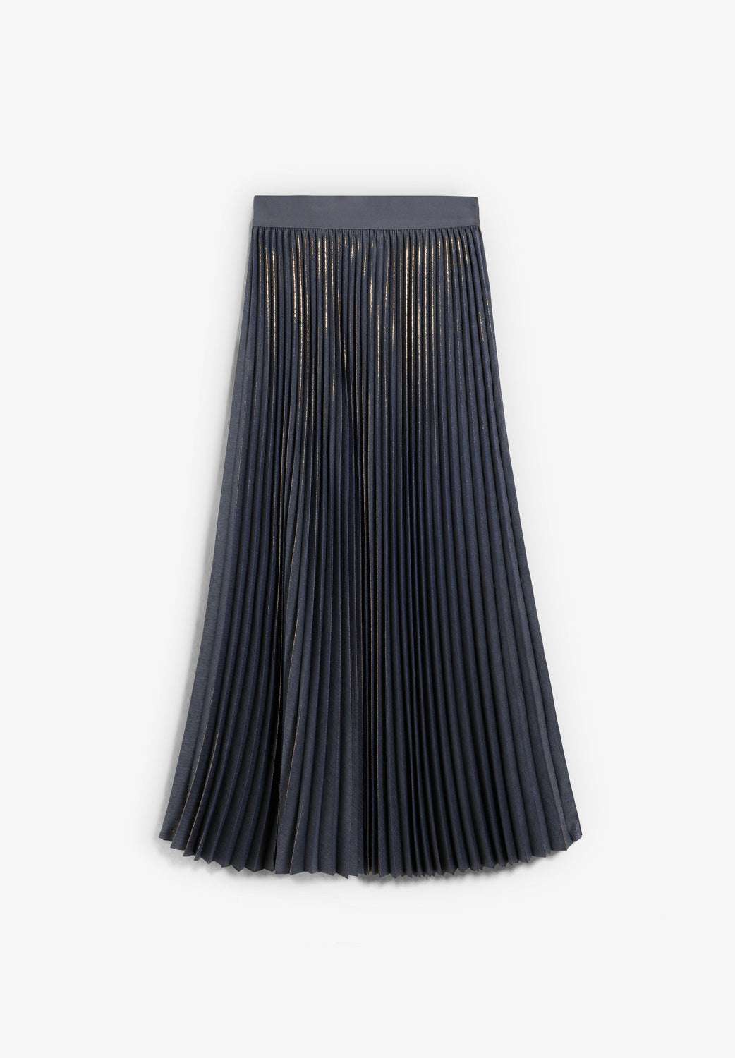 Saia midi plissada confecionada em tecido fluido com pormenores de fio metalizado em pregas. Regular fit. Cós elástico. Ligeiramente A Line.
