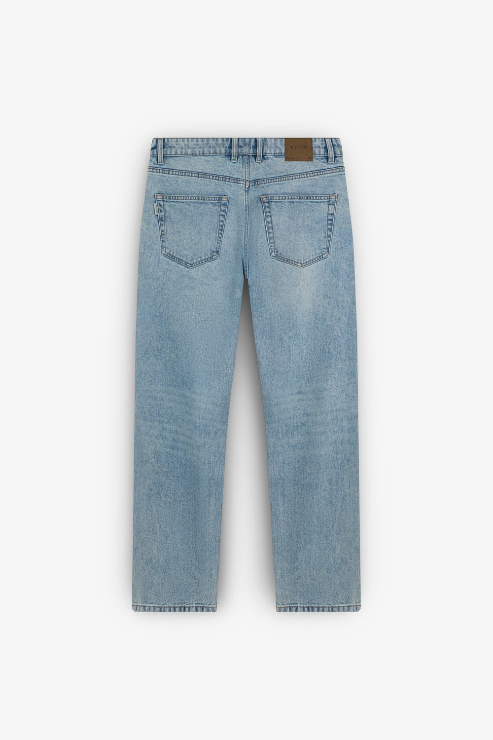 Calças jeans confecionadas em algodão BCI. Fecho com botão e zip. Dois bolsos laterais e traseiros. Presilhas na cintura.