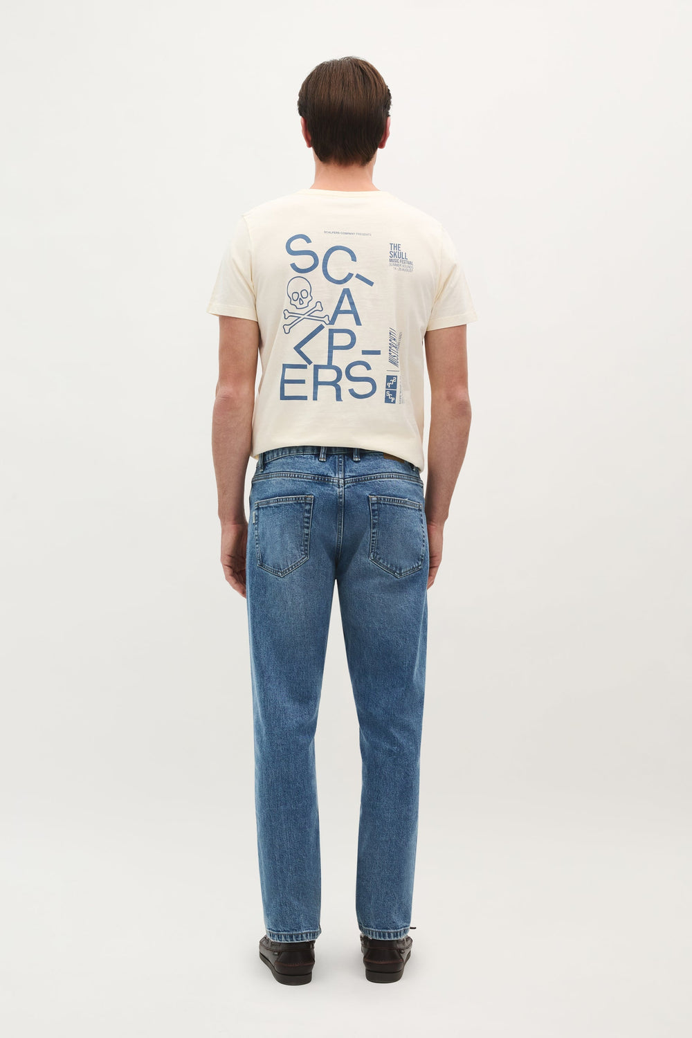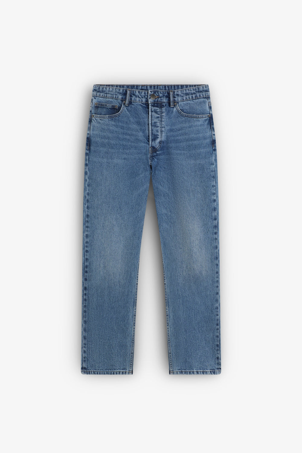 Calças jeans confecionadas em algodão BCI. Fecho com botão e zip. Dois bolsos laterais e traseiros. Presilhas na cintura.